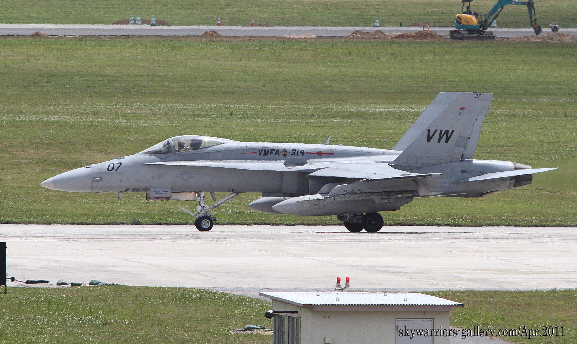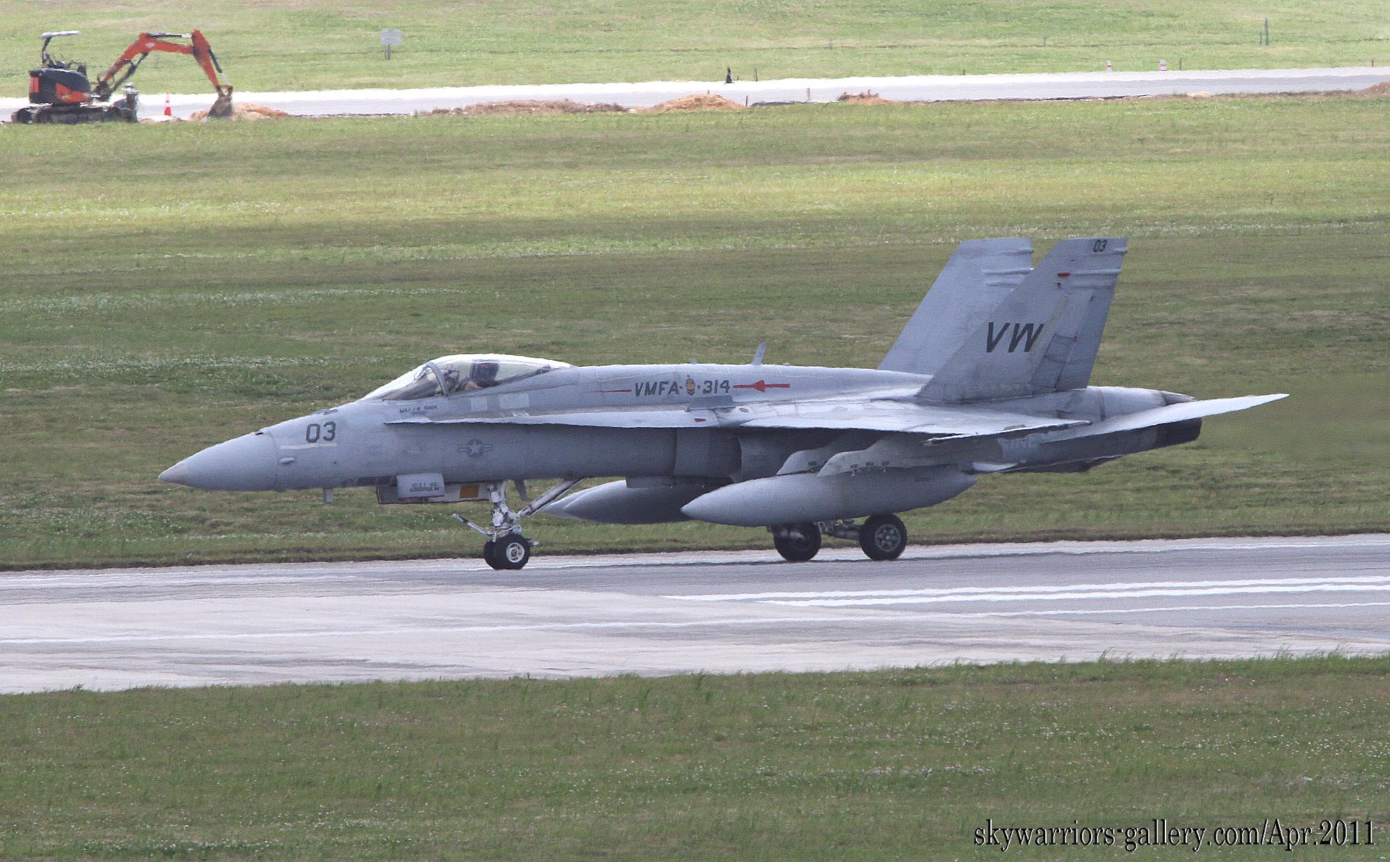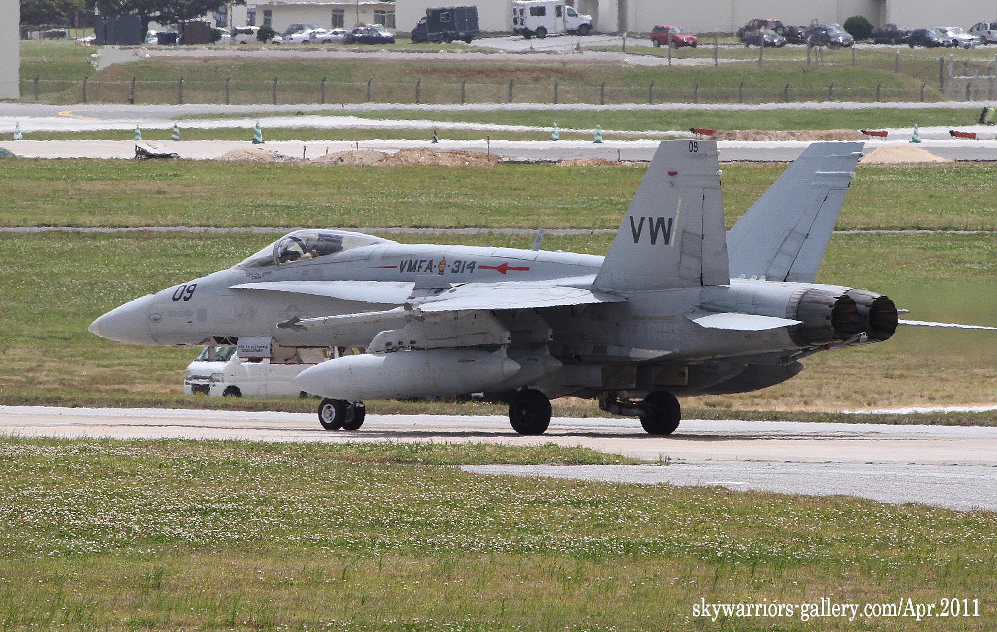 ↑ 2011年3月に岩国基地に配備されたVMFA-314。所属機全機の胴体上部左右に部隊マークであるナイトの兜が3色カラーで入るという久方に色気のあるマーキングだった。隊長指定機は尾翼には同じナイトの兜が大きく書かれ更に派手なものだった。F/A-18A+/Bu.No.162400。2014年にはほぼ同じマーキングが、FA-18A++/Bu.No.163416に引き継がれた。