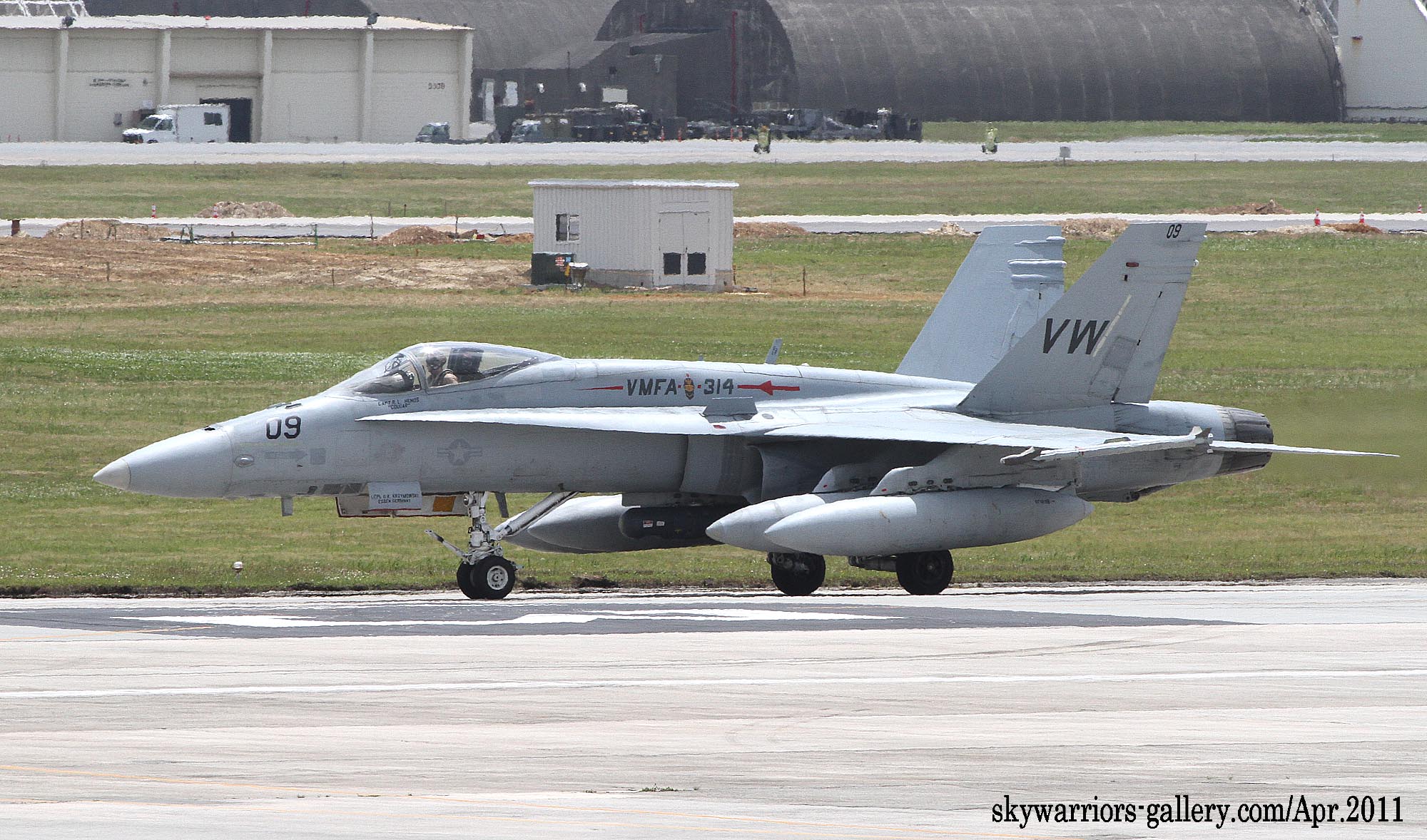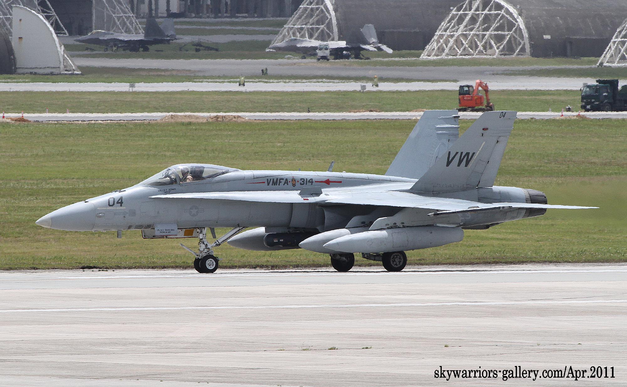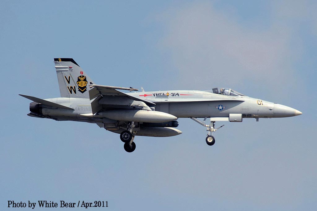 ↑ 2011年3月に岩国基地に配備されたVMFA-314。所属機全機の胴体上部左右に部隊マークであるナイトの兜が3色カラーで入るという久方に色気のあるマーキングだった。隊長指定機は尾翼には同じナイトの兜が大きく書かれ更に派手なものだった。F/A-18A+/Bu.No.162400。2014年にはほぼ同じマーキングが、FA-18A++/Bu.No.163416に引き継がれた。