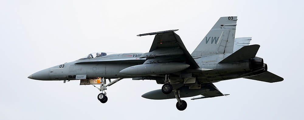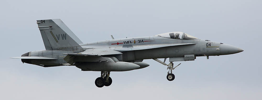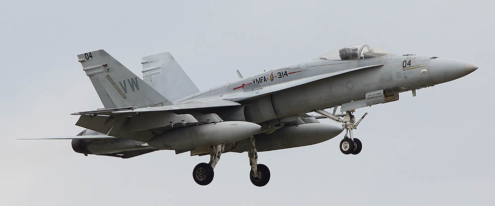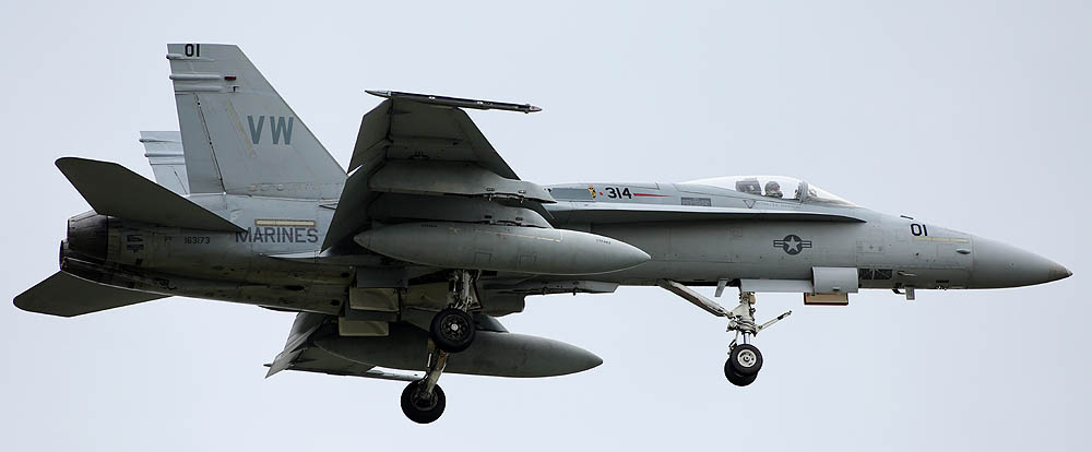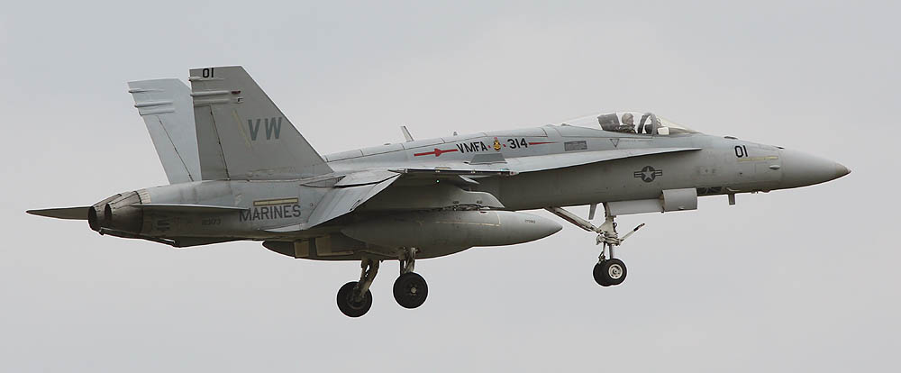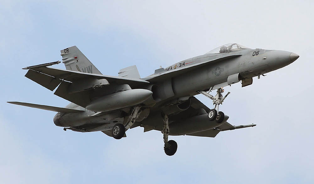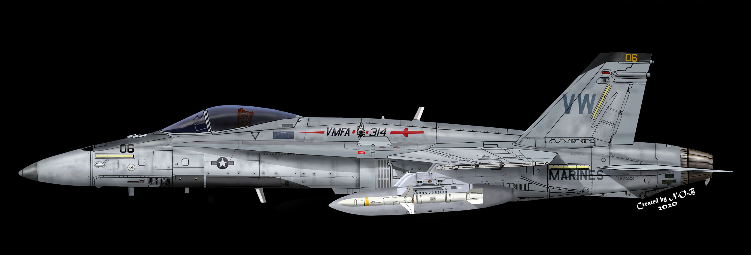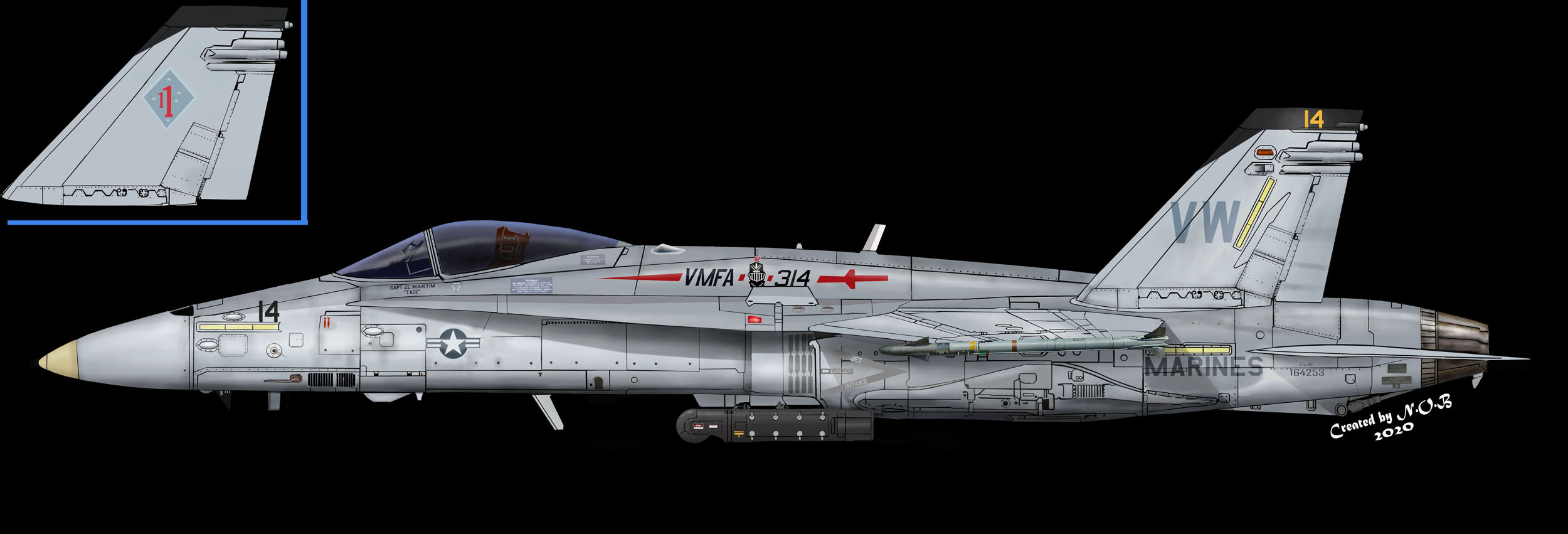 ↑ 2018年6月のVW-14 F/A-18C,Bu.No.164253 。この年にこの部隊で確認された機体は、尾翼のチップが黒に塗られ テールレターは、ダークグレーとなっている。VW-14の尾翼内側には、第一騎兵師団のインシグニア 機首には、2つの爆撃マークが入っている。2018年は、海兵隊に初めて女性が入隊した1918年から100周年であり ミラマーではセレモニーも開催された