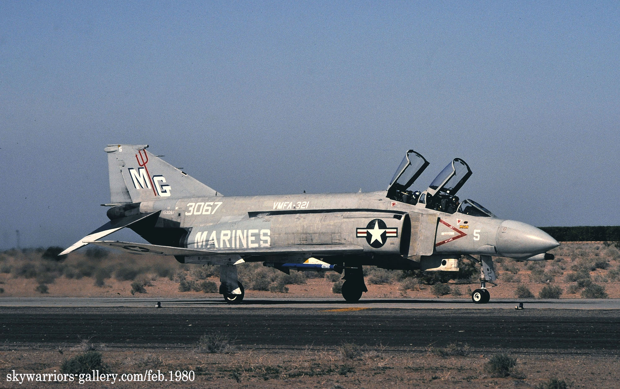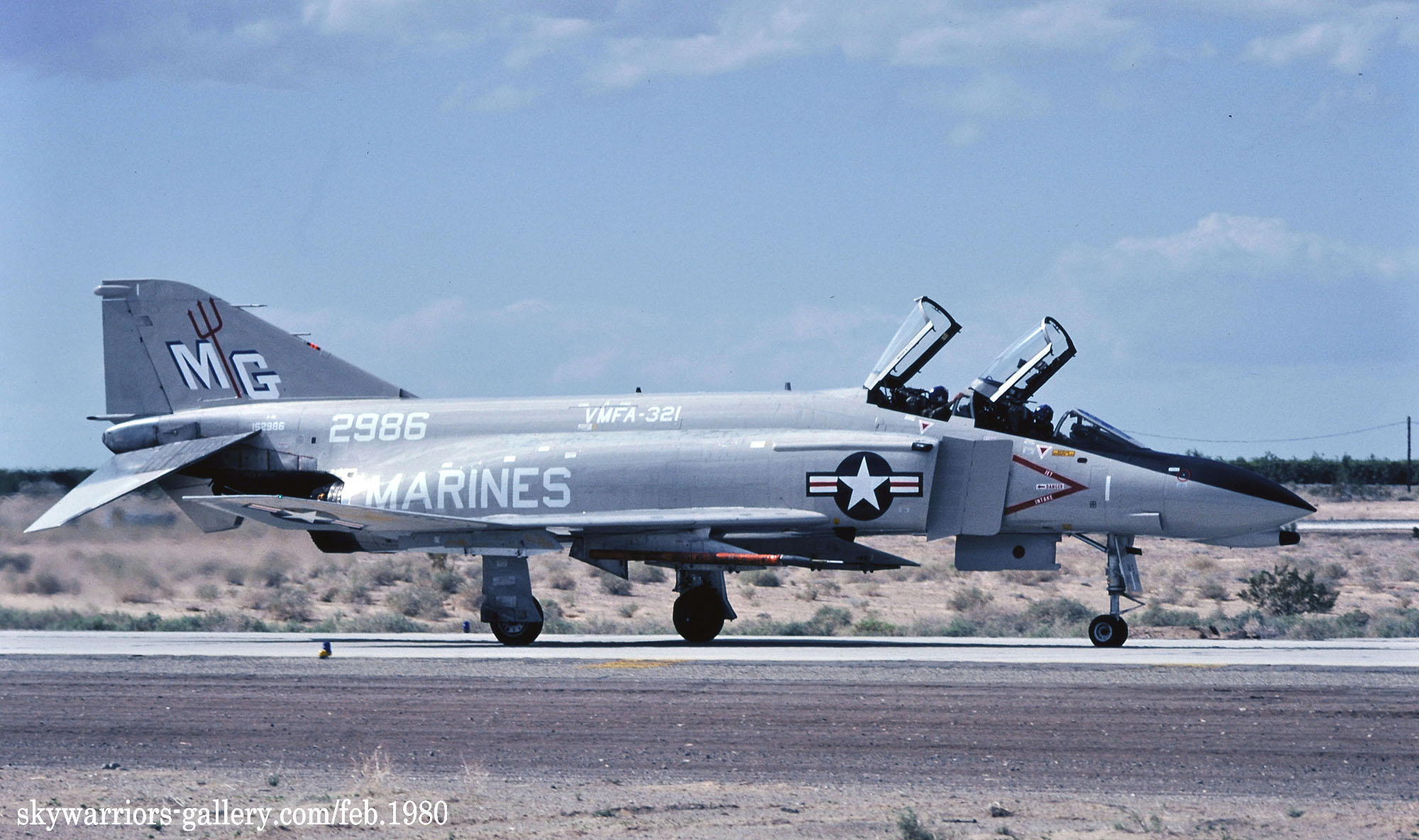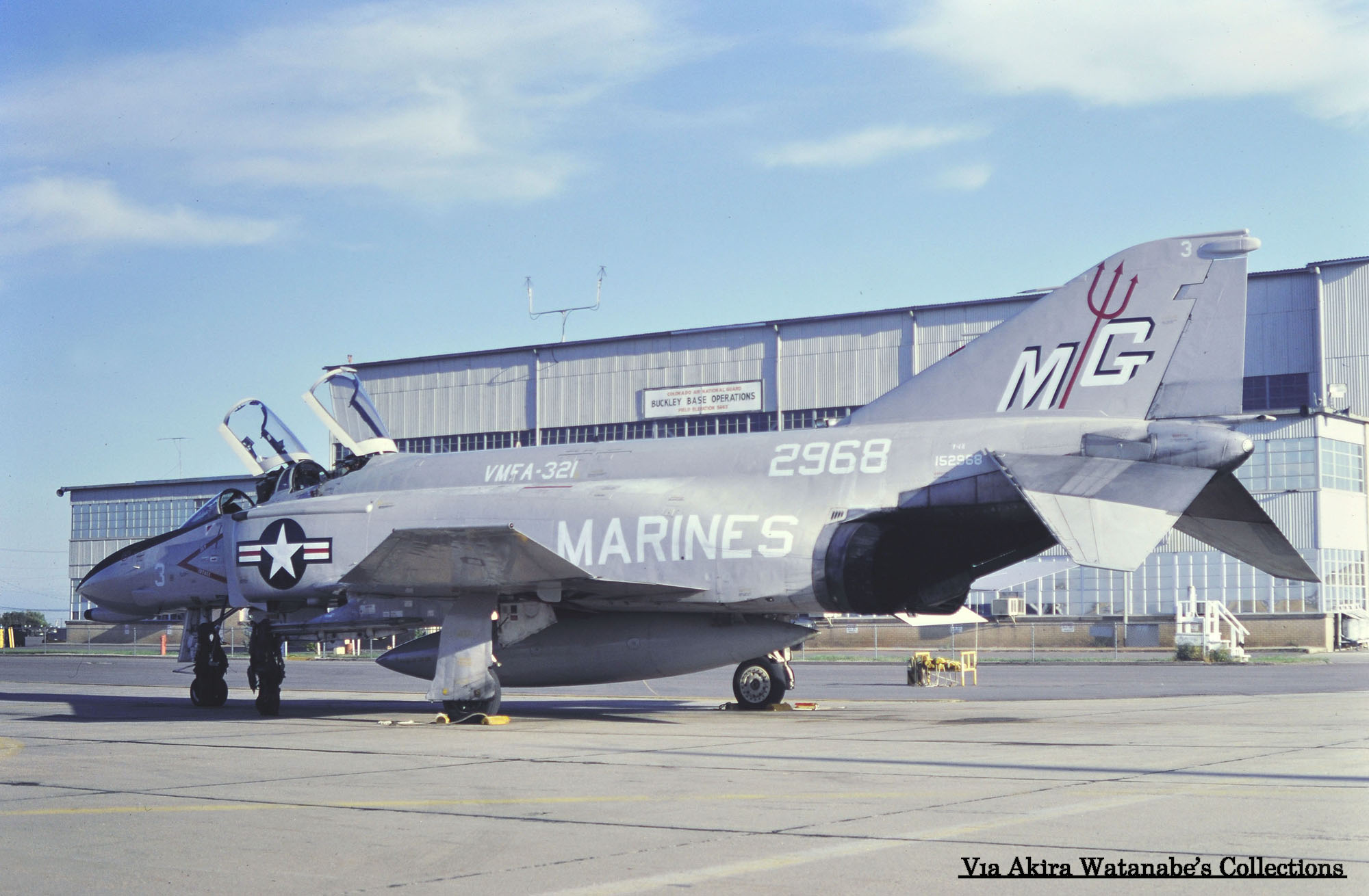 ↑ 1983年3月に撮影されたVMFA-321のF-4N/MG-9。前ページの写真から1か月後の写真であり、基本的に何も変わっていない。懸架された大小のロケット弾ポッドが興味深い。