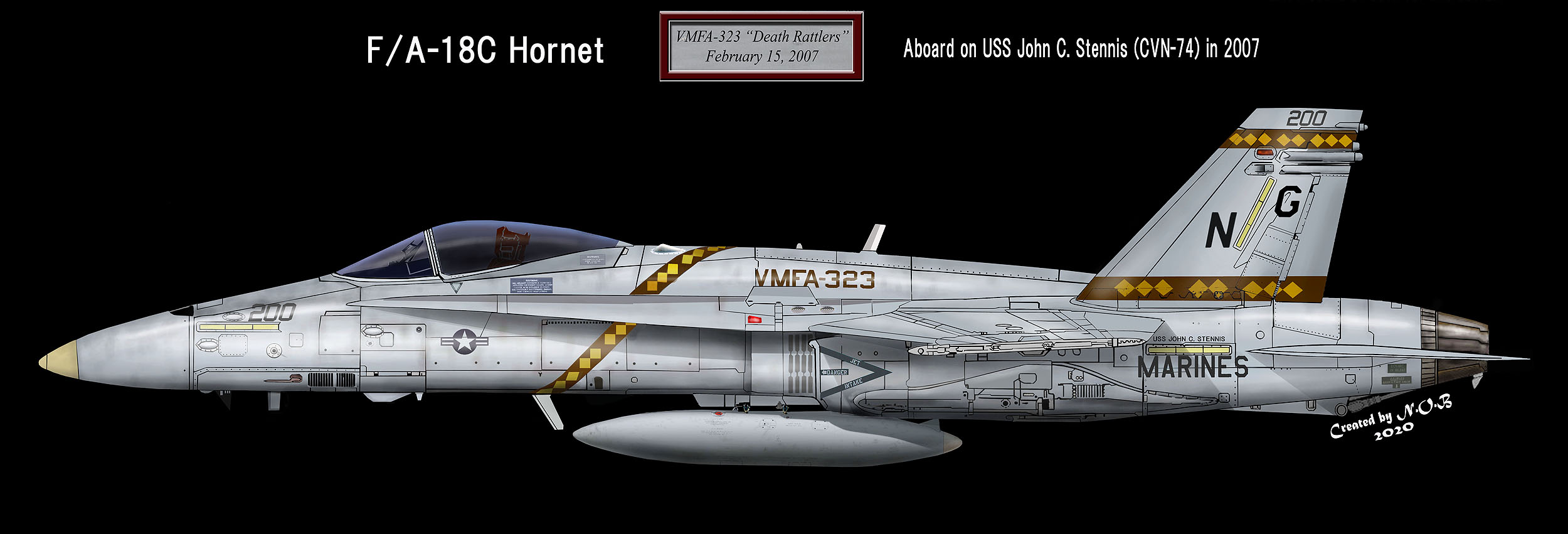 ↑ 2007年3月より空母ジョン・C ステニスと強襲揚陸艦ボノム・リチャードなど9隻の艦隊が、ホルムズ海峡を経てアラビア湾に入り イランなどを牽制した際 空母に搭載されてこの区域での監視活動をしたのが、VMFA-323だった。派遣早々に1機が事故で失われたが、パイロットは救助されている。この時期の司令官指定機NG-200のマーキングは、従来よりもダイヤモンドの入った茶帯が1本多く書き込まれていた。Bu.No.は不明。