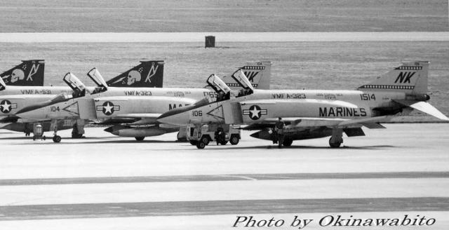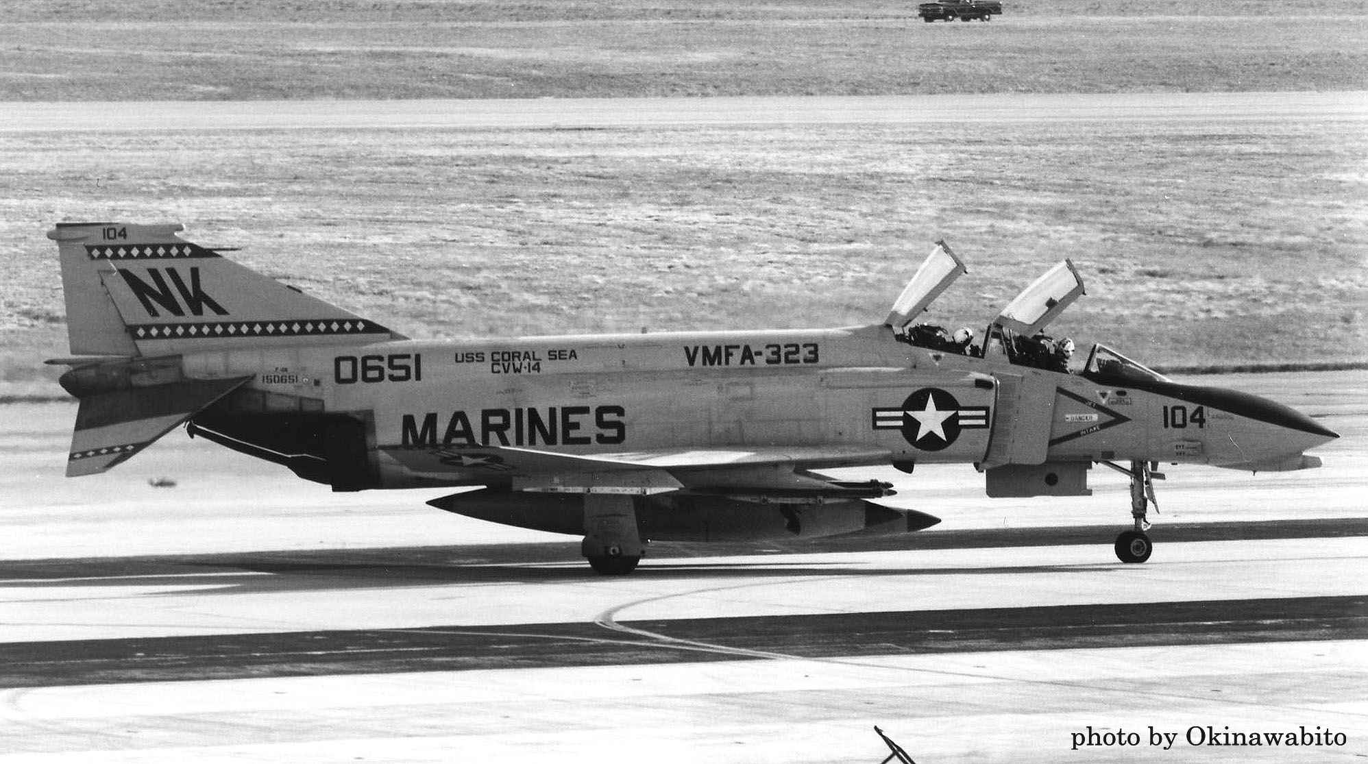 1980年のWest-Pacで USSコーラルシーに載って航海した際に嘉手納に降りたVMFA-323のF-4N”NK-104”と”NK-106"。後方にはVMFA-531のF-4Nも見える。MCASエルトロを拠点にしていた為 めったに日本で見られなかった飛行隊が空母に搭載されて訓練に参加して我々の目の前に現れた。