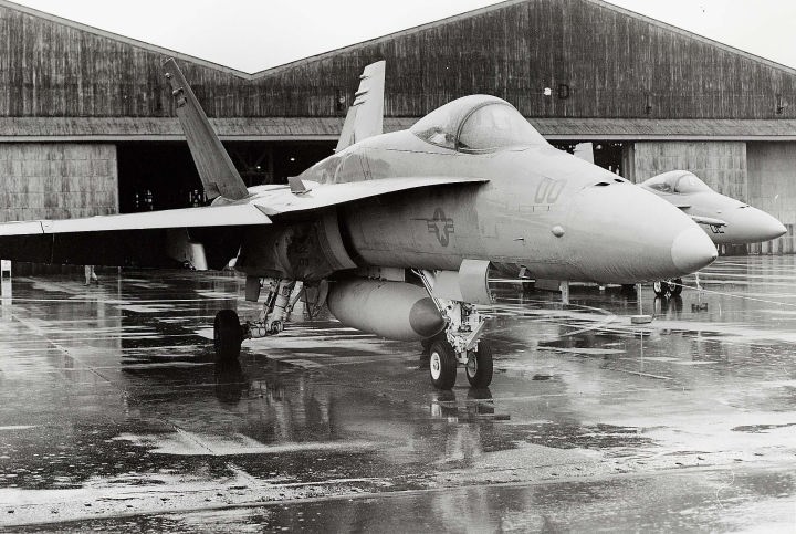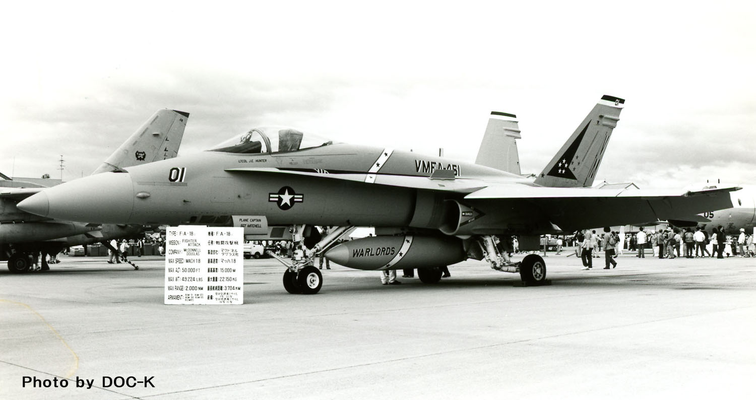≪1994年木更津基地に展示されたFA-18A(VM-00)、このときは、VMFA-232(WT-02)も飛来し展示された。短い滑走路しか持たない木更津にも降り事ができる離着陸性能をFA-18は持っていることを示した。