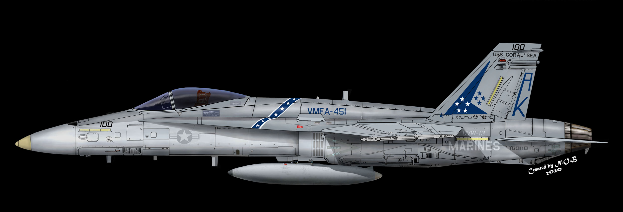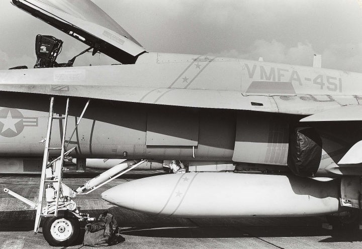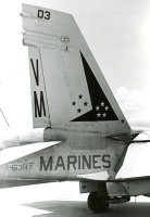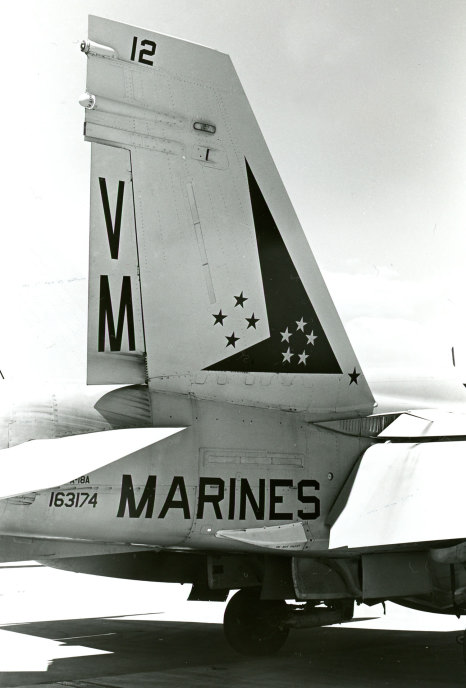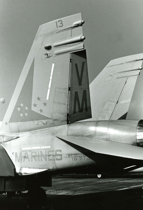 ↑ 1989年空母コーラルシー最後の航海でCVW-13に配属され、遠征に出た際のVMFA-451 AK-100。F/A-18A.Bu.No.163118。この年空母コーラルシーは5月末から9月までの約4か月間地中海方面で最後の活動をして役目を終えた。それと同時にレーガン政権時代に生まれた空母航空団CVW-13(AK)もブッシュ政権の財政圧縮策の中、部隊解散となった。