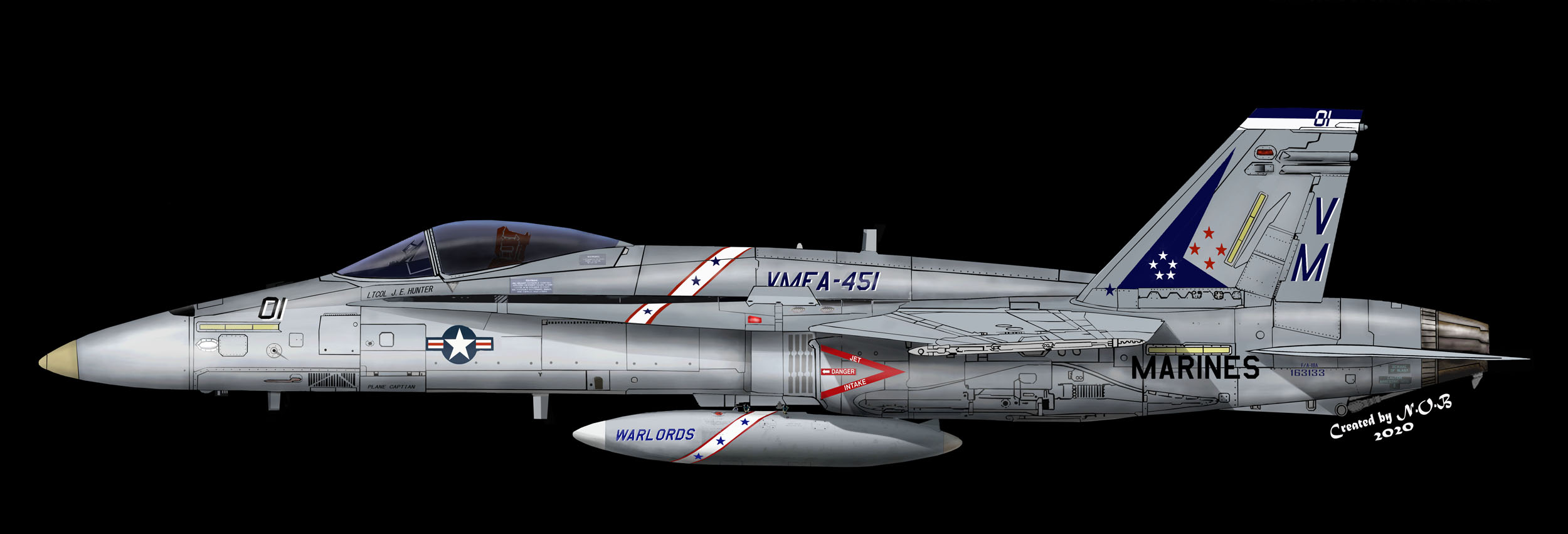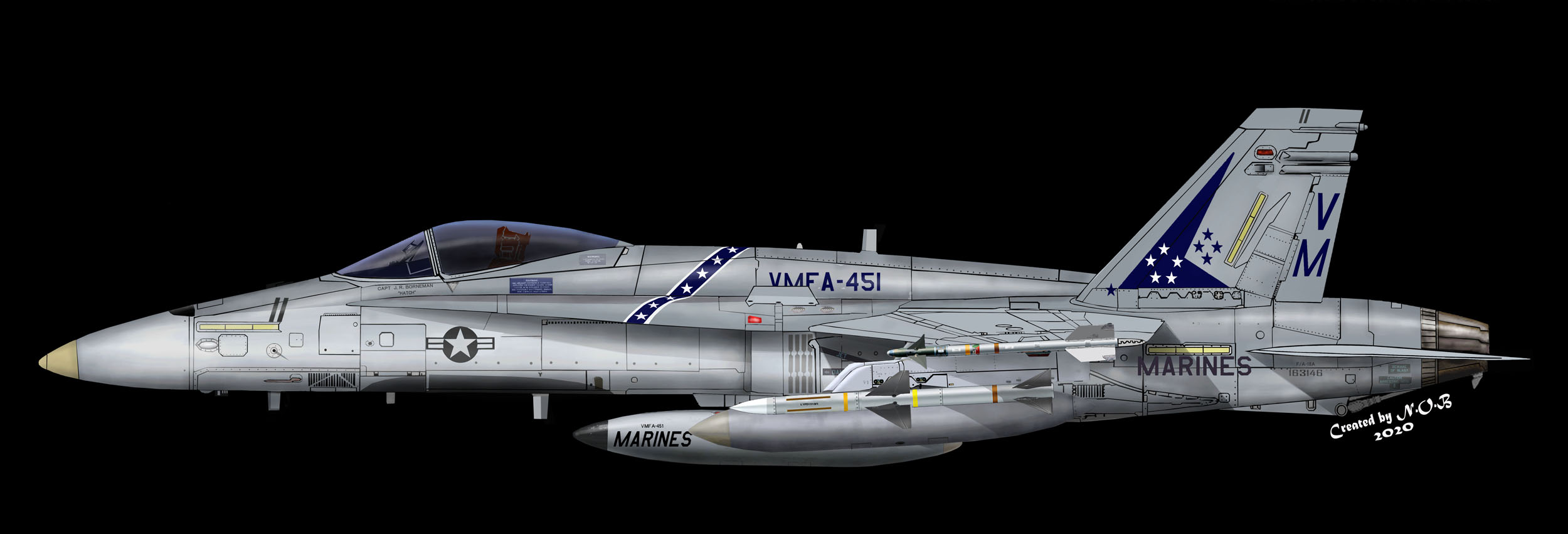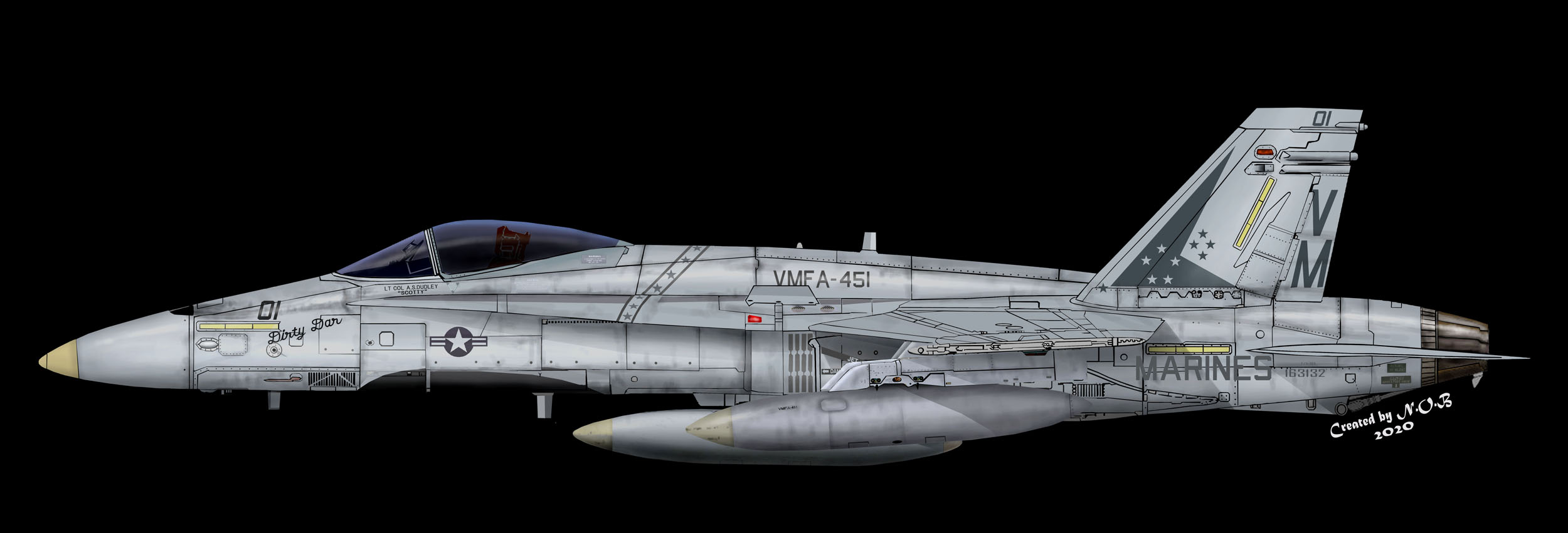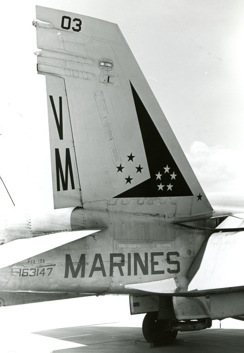 ↑ 1991年2月イラクの砂漠の嵐作戦から帰隊した時のマーキング。VMFA-451の部隊長ダットリー中佐が自ら操縦していた機体。機首の左右に斜めに「Dirty Dar」と黒文字で書かれてあった。F/A-18A VW-01 Bu.No.163132