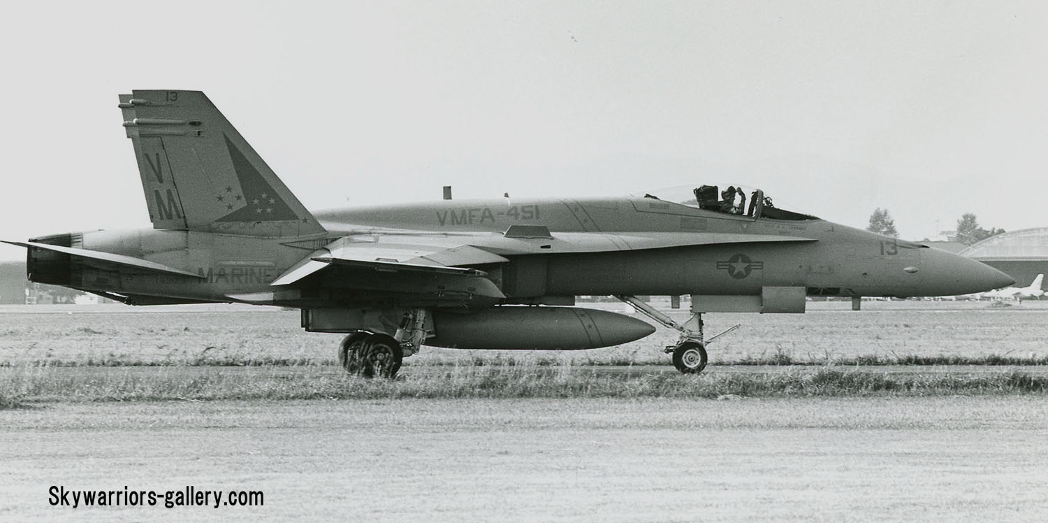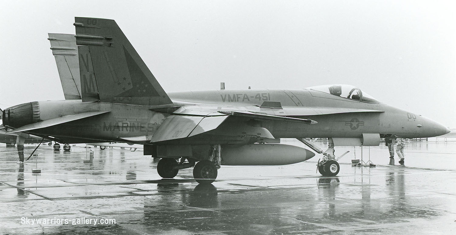 VMFA-451は、1987年にF-4SよりFA-18Aに機種転換し、大西洋方面で空母に展開できる4番目の飛行隊として CVW-13に所属し航海にも参加している。また 1988年に生産500機目となったF/A-18Aは、この部隊に配備された。残念なことに1997年、部隊は53年の歴史に幕を閉じた。ただ VMのテールレターとインシグニアは、F-35Bへの転換訓練部隊VMFAT-501に引き継がれた。