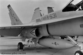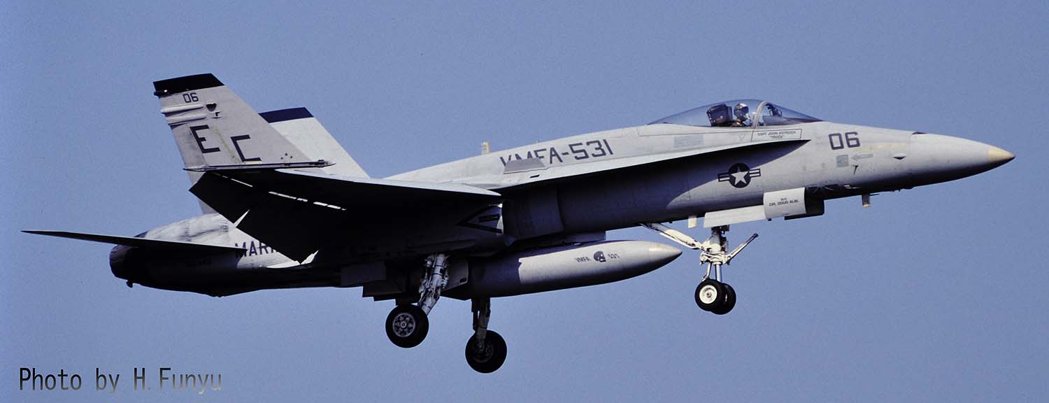↑ VMFA-531は、1988~1991年の間 3度岩国に駐留しているが、1991年当時のマーキングは、黒色をベースとした濃淡のはっきりした塗装で、尾翼のチップにもラインが入り 機体が締まった感じである。この時嘉手納での遠征訓練も盛んに行われた。F/A-18A