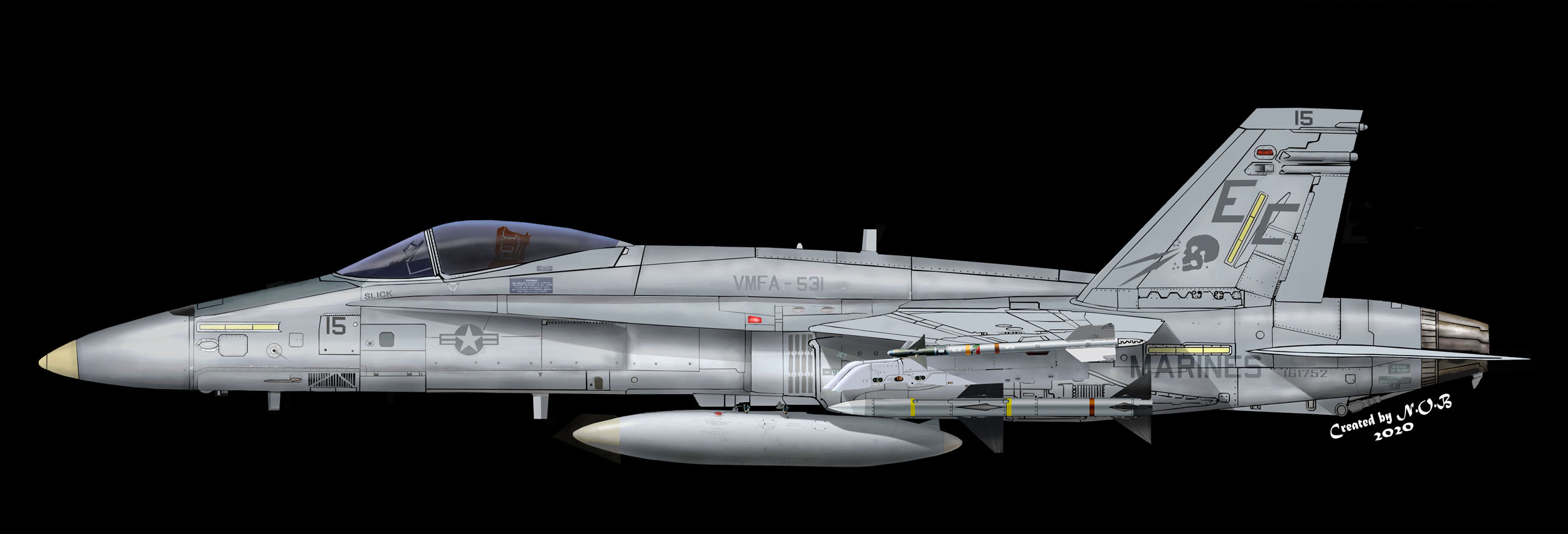 F/A-18Aを受領して僅か8年で部隊解散となったVMFA-531であるが、数回の来日で我々の前にもその雄姿を見せてくれた。マーキングは、名前通りグレー一色の正に幽霊のような塗装ではあったが、築城基地や厚木基地での展示などでマニアにシャッターチャンスを与えてくれた。