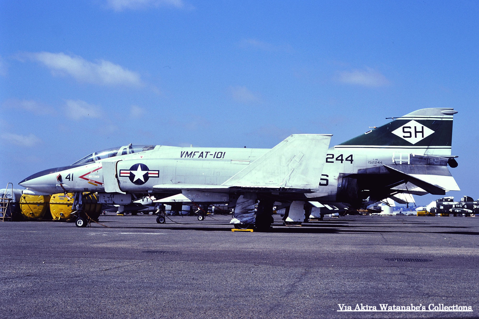 ↑ この写真は、1975年8月にNAS ノースアイランドの海軍リワーク施設で撮影されたものである。渡辺明さん自身の作品で、VMFAT-101のこの旧マーキングを撮影している日本のマニアは少ない。しかも 機体はN型で 尾翼のダークグレーンが非常にきれいである。渡辺さんからのお便りによると この時代ノースアイランドの海軍リワーク施設では、海軍機の改造(例えばF-4BからF-4N)や改修(装備品のアップグレード)などを請け負っていたそうです。