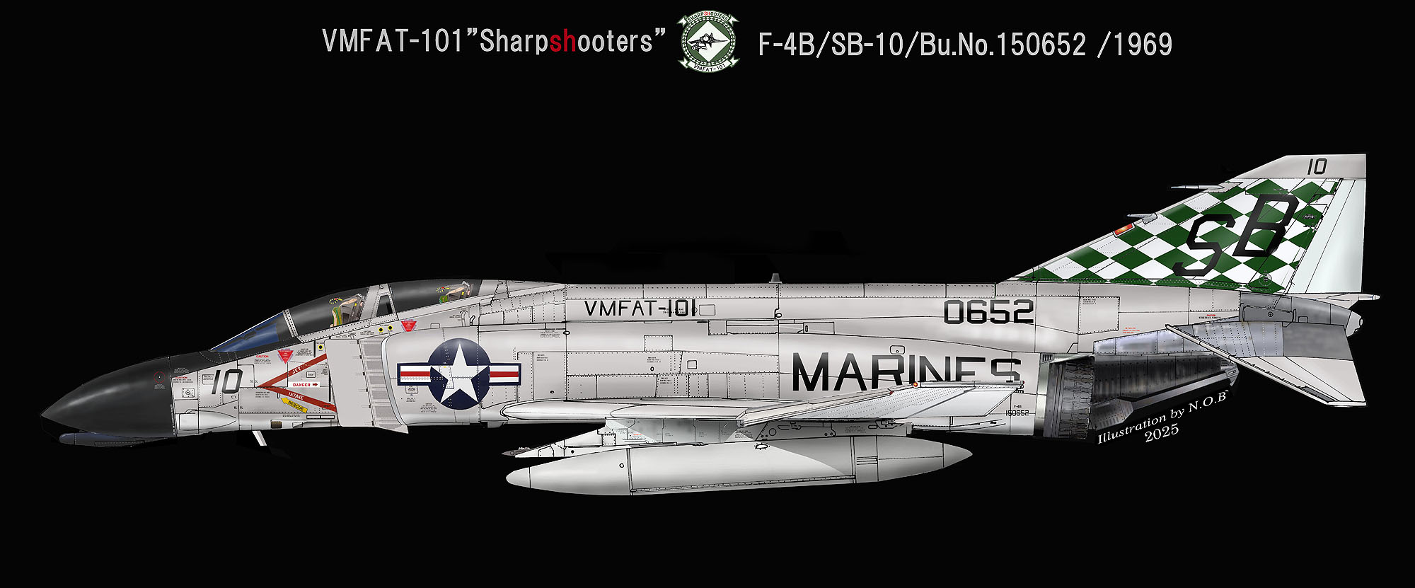 ↑ VMFAT-101が急きょMCAS エルトロに設立した時の初期のマーキングである。当時は東海岸のビューフォート基地の訓練部隊が”KB"そしてユマのこの部隊が”SB”を使っていたようであるが、尾翼のチェック模様ではテールコードが見辛い。F-4B/SB-10/Bu.No.150652