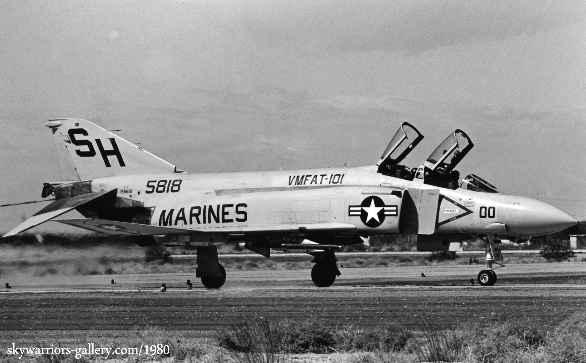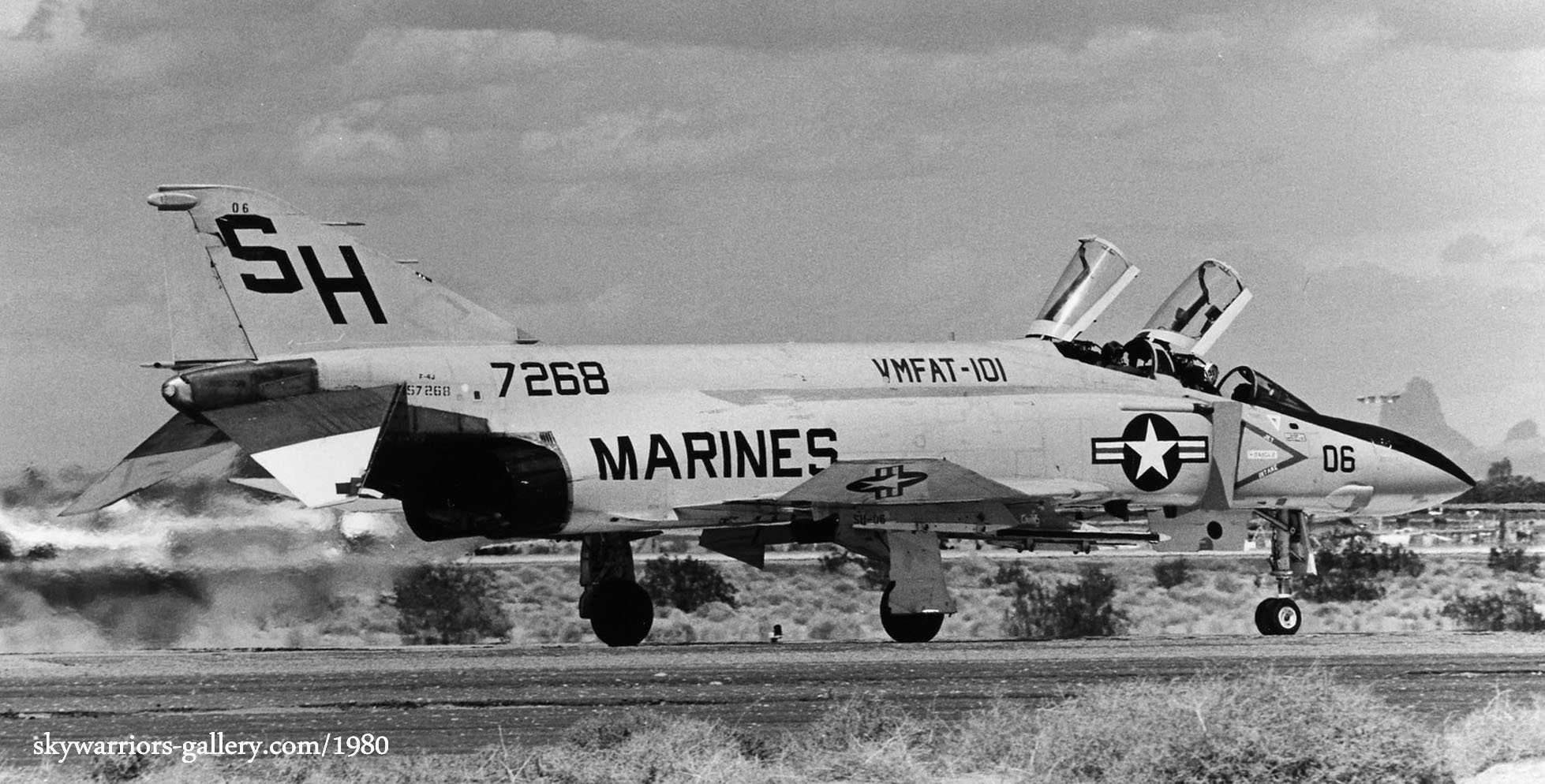 海兵隊のファントム部隊は当時殆ど東海岸のビューフォートにいたので、ユマでファントムが撮れるなどと考えてもいなかったが、この予備役部隊の合同訓練とVMFAT-101の訓練飛行で、毎日ファントムファントムファントムばかりが撮れる状態・・・A-4Mの部隊はこの訓練期間中何処かに移動しているようで姿も無かった。但しA-4Mの訓練部隊VMAT-102は居てくれたので撮る事ができたのである。前項でご覧いただいたようにVMFAT-101も数年前までは実に美しいマーキングであったのだが、海軍/海兵隊に迫りつつあったロービジの波を最初に受けた部隊のようで、機体に黒以外の色彩は見られなかったのが残念。