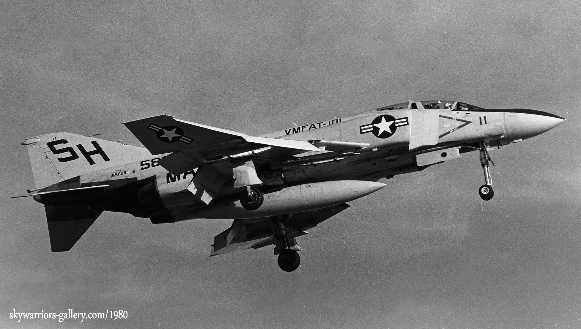 ↑VMFAT-101に配備されたF-4Bの後期型。尾翼最上部前縁に突き出ているのはAN/APR-30レーダーホーミング警戒アンテナである。同じく尾翼トップ後縁についているのが、AN/ALQ-51