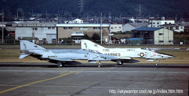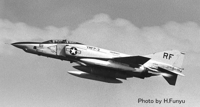 1977年9月27日厚木R/W01で 離陸するVMFP-3”RF-611”(157344) ご記憶に深いと思うが、この機体この後数分後に墜落して地上に激突、地上の住民3名が死亡する事故になった。(ご冥福をお祈りします) 正に離陸の時を捉えた写真でエンジンナセル付近から白い蒸気状のものが噴出している。何かが漏れ出しているのだ・・・乗員は脱出して無事だったが、厚木基地と米軍に対する風当たりがこの事故を契機に強くなり、反対運動に拍車を掛けてしまった。(2006年1月 記)