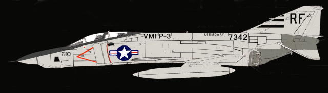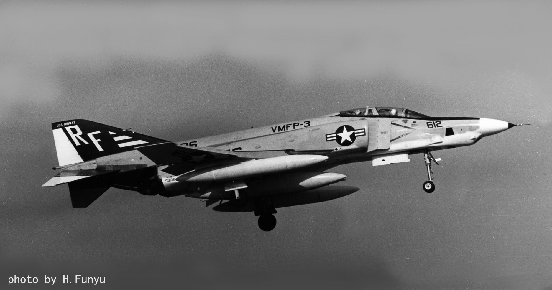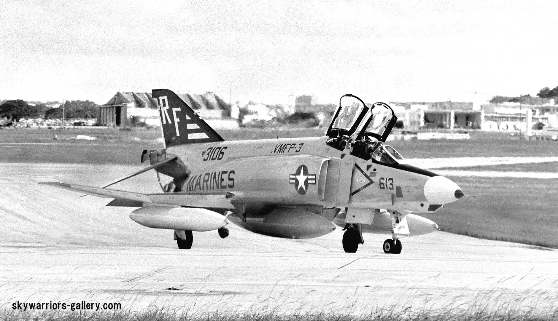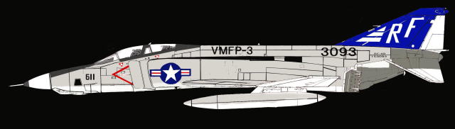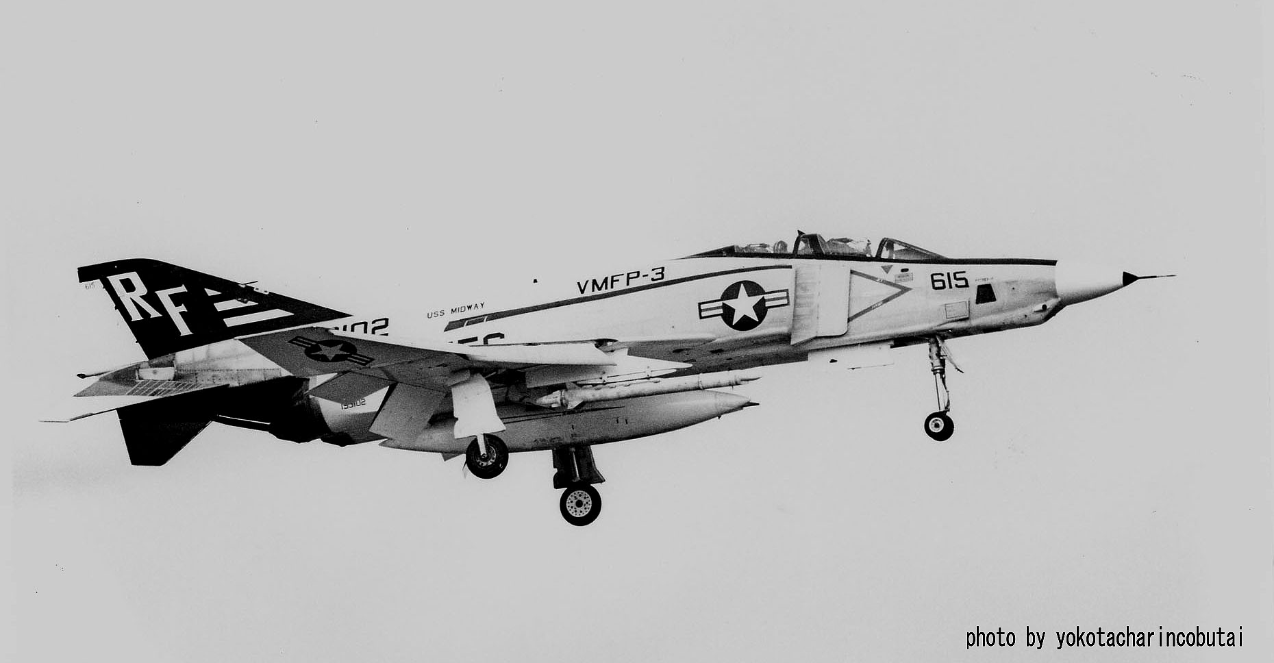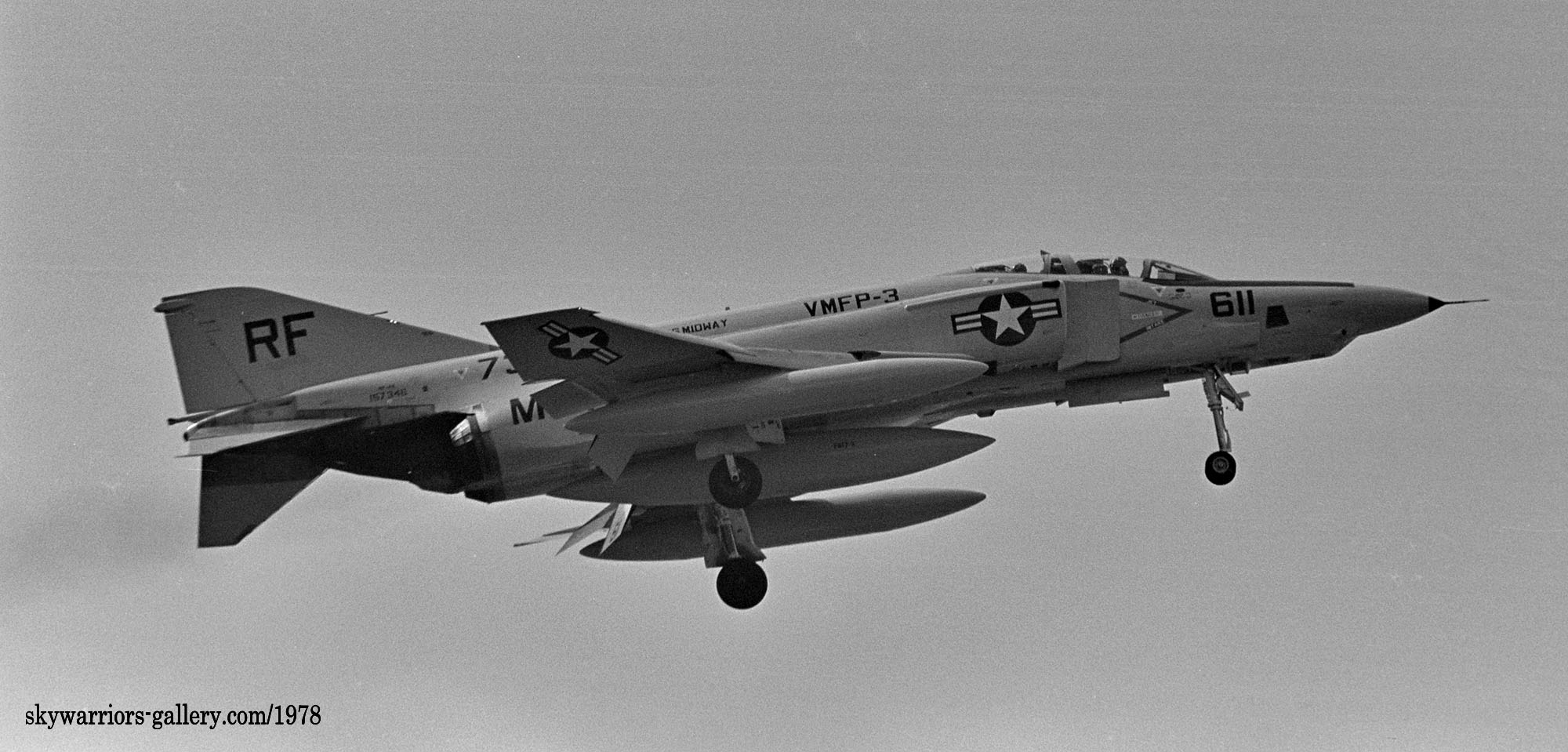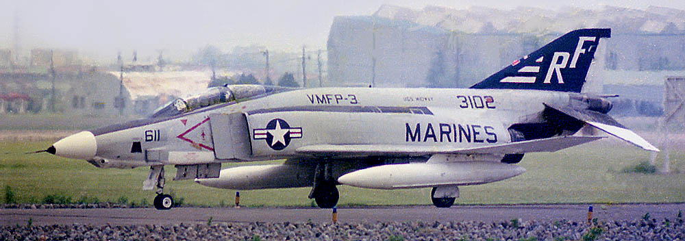VMFP-3は、VMCJ-1/2/3の機材などを引き継いで1975年7月に創設された部隊である。MCASエルトロをホームベースに本部飛行隊13機の他,4機編成の分遣隊(Det)を3個持っており、日本にも航空母艦USSミッドウェイでの洋上偵察/その他戦術偵察任務の為岩国に分遣隊が派遣され、厚木基地でも度々目にすることが出来た部隊である。アメリカ海軍がジェット偵察機RF-8G以降、自前の偵察飛行隊を持たなくなった為、海兵隊のRF-4Bが空母に派遣されるようになり、我々航空ファンはRF-4Bを目にする機会を得ることになった訳だ。今では偵察用のPODを使う為、専用の航空機は作らなくなったが、当時は空軍も海軍もRF-○○と言った偵察専用機を多用した。(2002/7/6 記)
