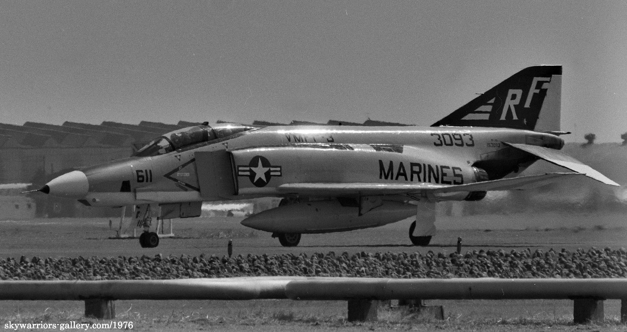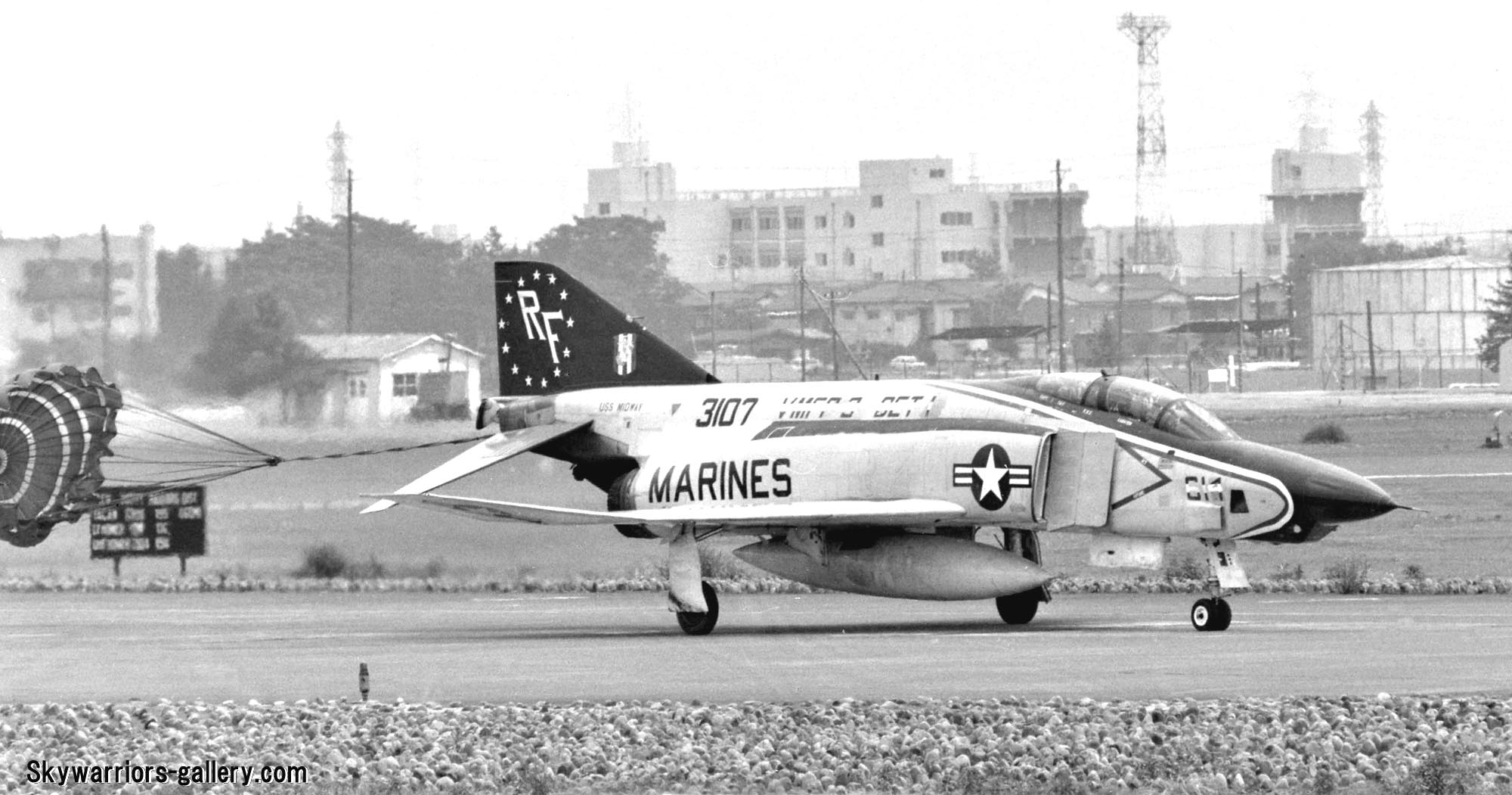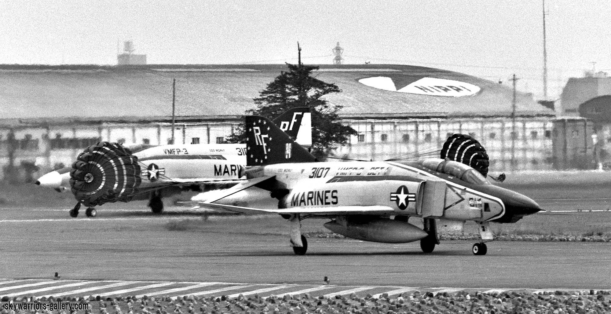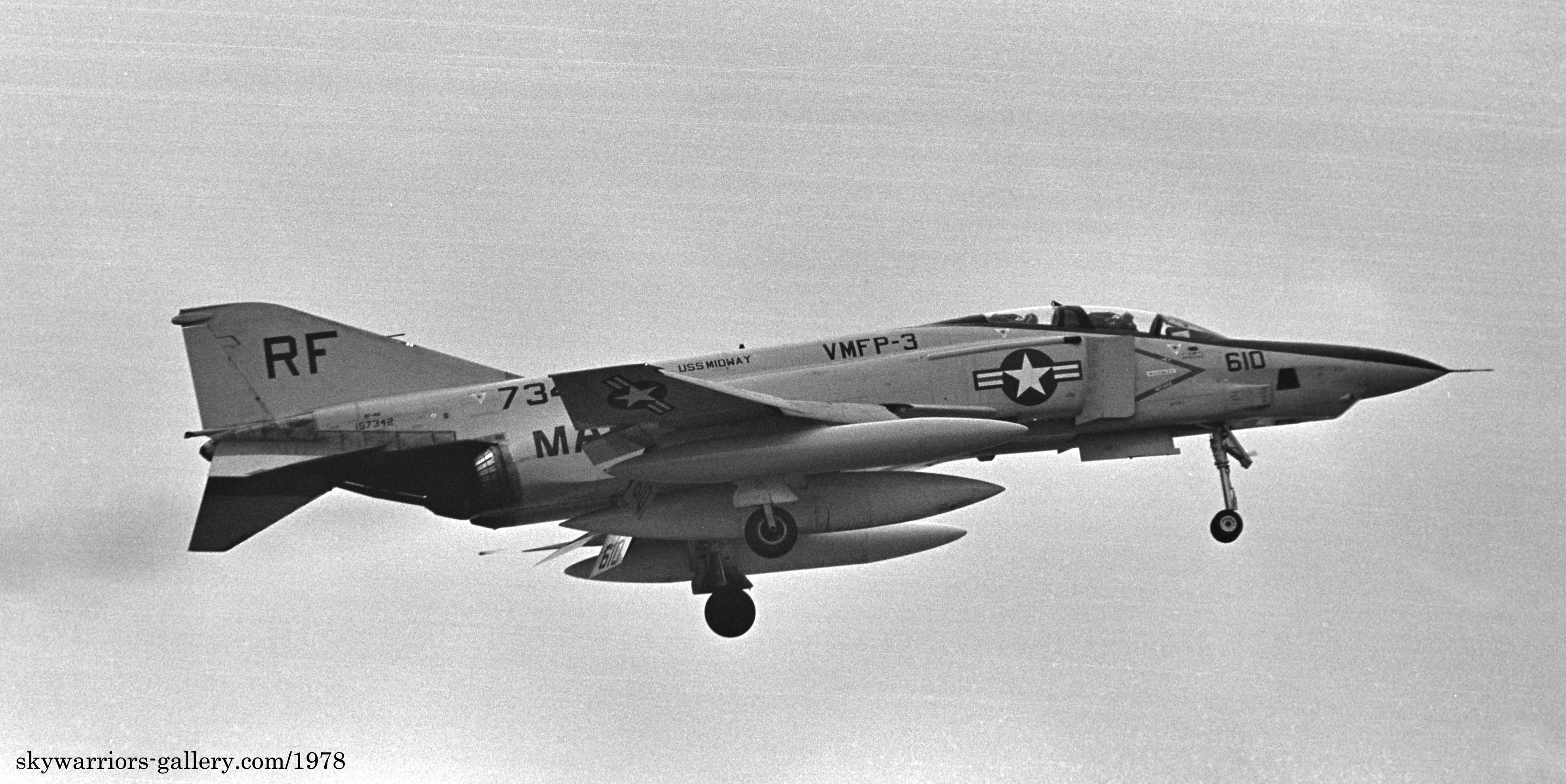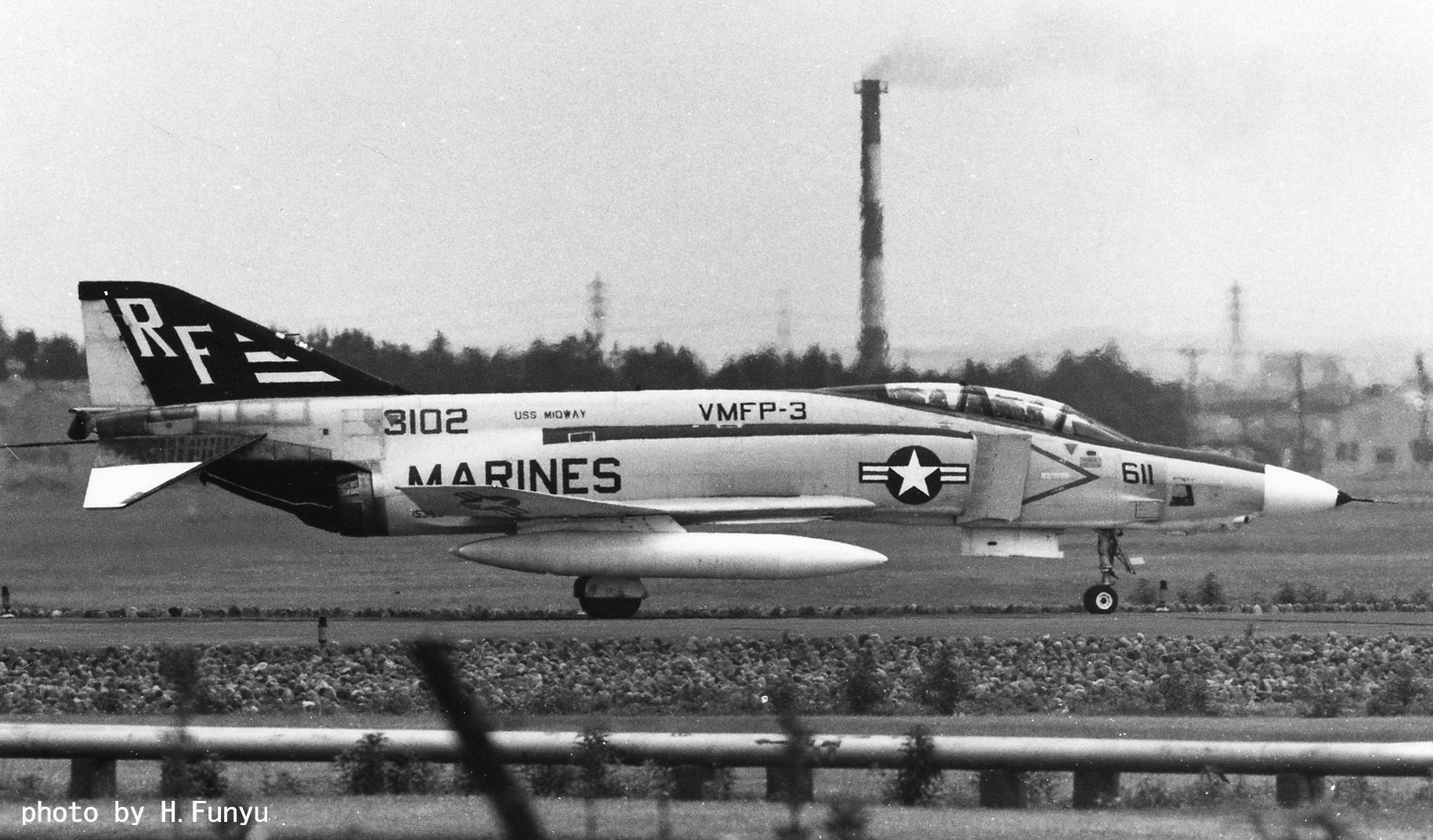 VMFP-3は、VMCJ-1/2/3の機材などを引き継いで1975年7月に創設された部隊である。MCASエルトロをホームベースに本部飛行隊13機の他,4機編成の分遣隊(Det)を3個持っており、日本にも航空母艦USSミッドウェイでの洋上偵察/その他戦術偵察任務の為岩国に分遣隊が派遣され、厚木基地でも度々目にすることが出来た部隊である。アメリカ海軍がジェット偵察機RF-8G以降、自前の偵察飛行隊を持たなくなった為、海兵隊のRF-4Bが空母に派遣されるようになり、我々航空ファンはRF-4Bを目にする機会を得ることになった訳だ。今では偵察用のPODを使う為、専用の航空機は作らなくなったが、当時は空軍も海軍もRF-○○と言った偵察専用機を多用した。(2002/7/6 記)