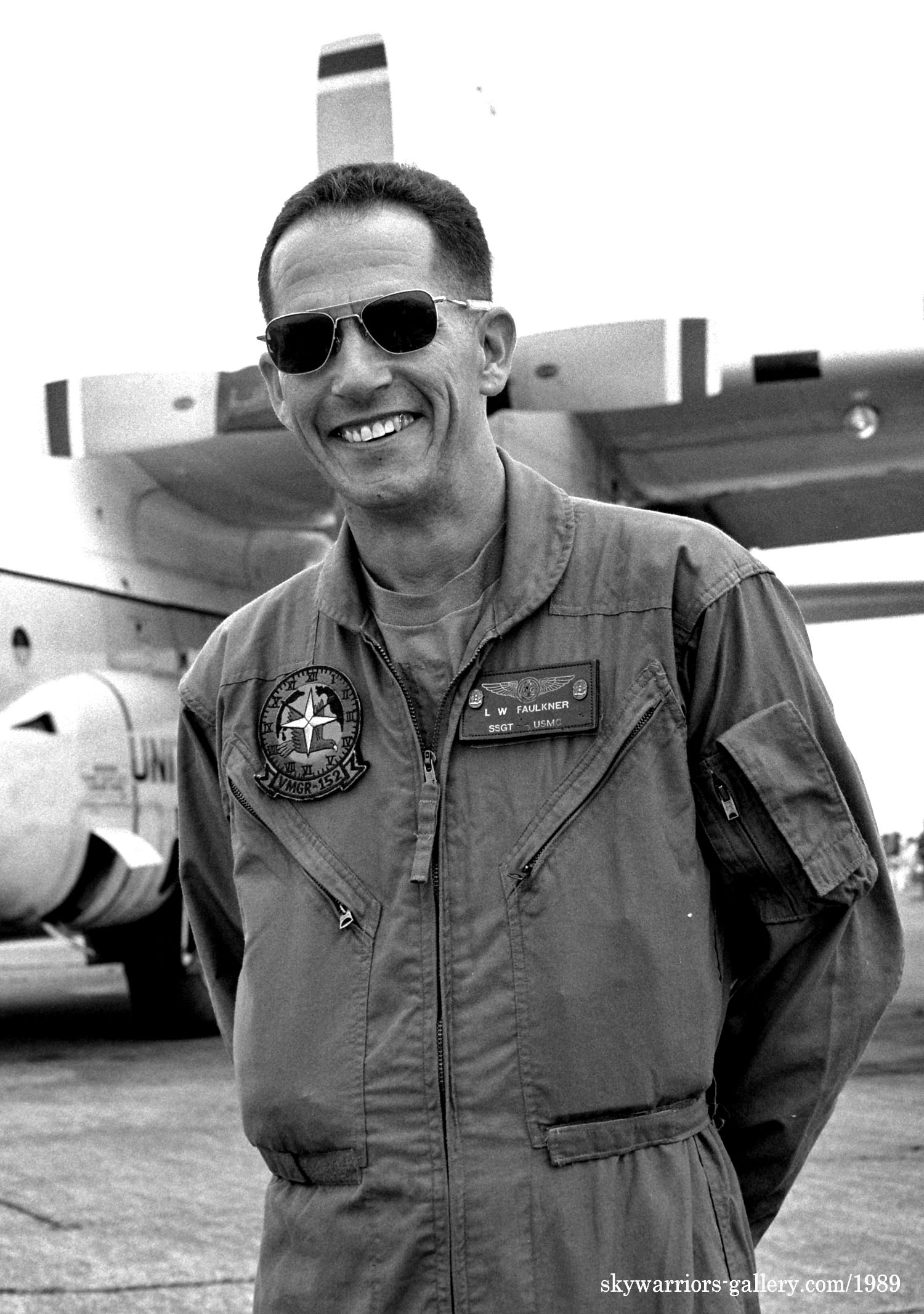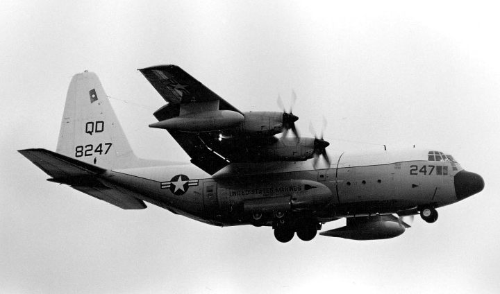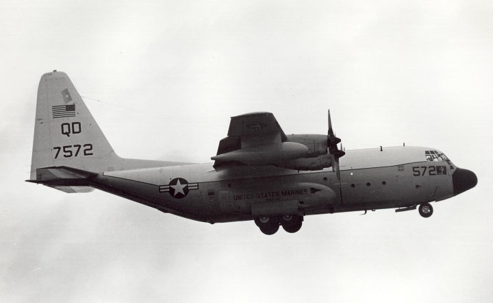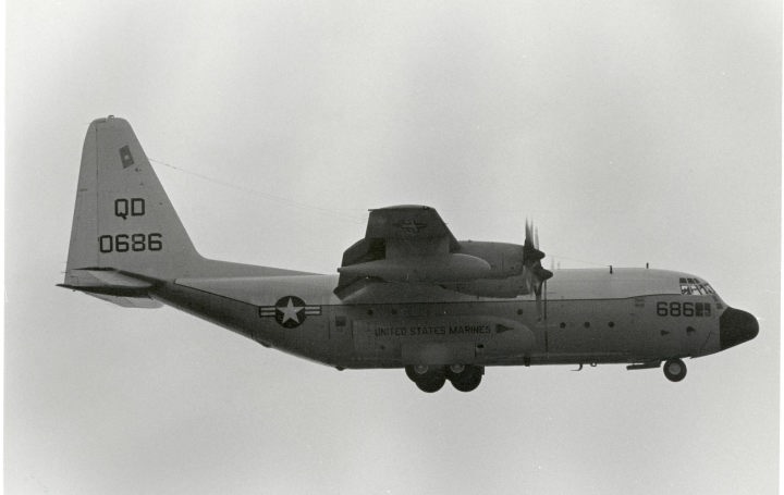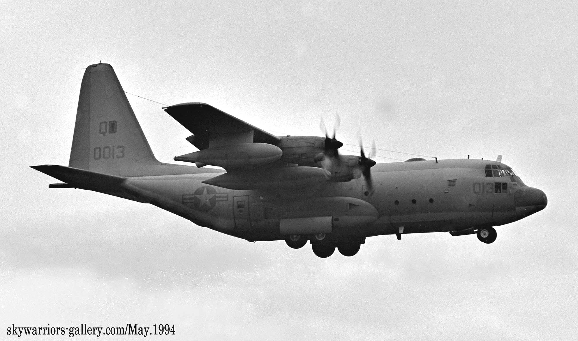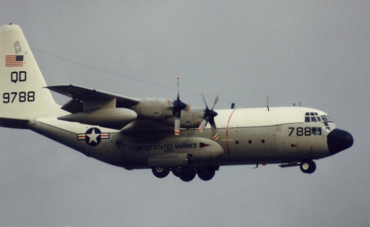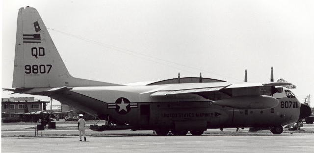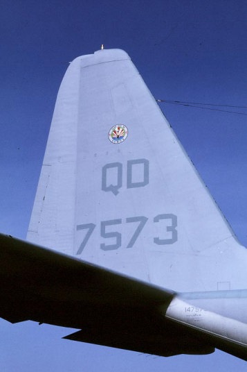”QD"のレターの上に星条旗を大きく書き込んでいた機体が結構多かった。1970年代のこの時機、部隊インシグニアは尾翼への書き込みが禁じられていたのか、他の部隊についてもテールレターだけか星条旗が書かれているのみであった。しかし 戦闘機部隊と比較するとロービジ化の流れは比較的遅い。これは空中給油そのものが自軍の制空圏内で行われる事がほとんどの為であろう。KC-130は、1957年に空軍のC-130を改造して試作機の検討が始まり、F型は46機が海兵隊に収められたようだ。