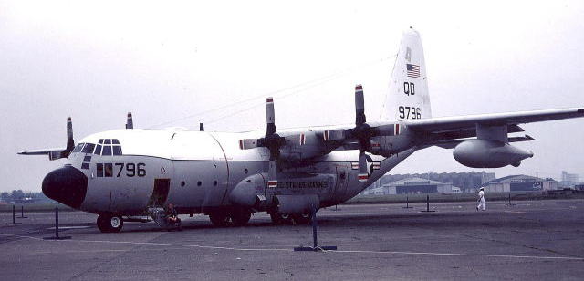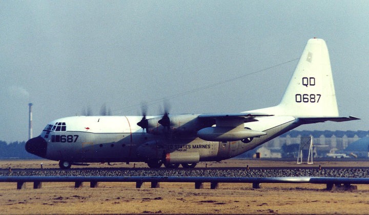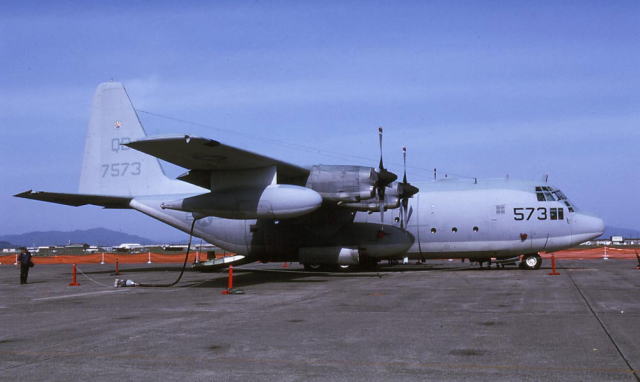 KC-130Fは、厚木にもよく飛来する部隊であった。極東の米海軍航空隊は、このように大型の空中給油機を持っていなかったため 海兵隊機への給油以外、海軍機の演習においてもKC-130F/Rの支援を受けていたものと思われる。翼の外側についているタンクのようなポッドがドローグ・ユニットで、給油用のホースは23mまで伸ばすことが出来る。大型機である為、飛行中の後流の影響が大きく、給油ホースは極力長く伸ばし、給油を受ける機体がKC-130の出来るだけ下方で受給できるように配慮してある。