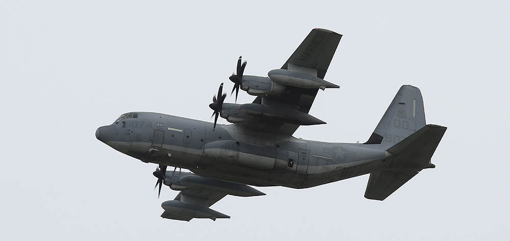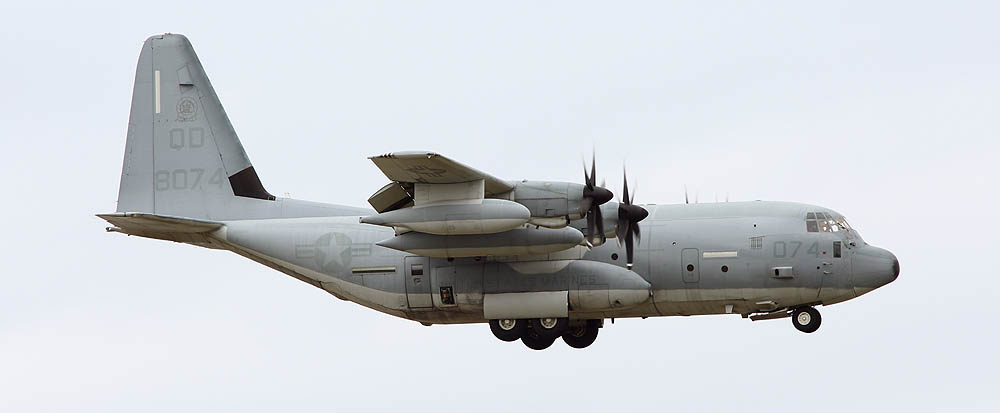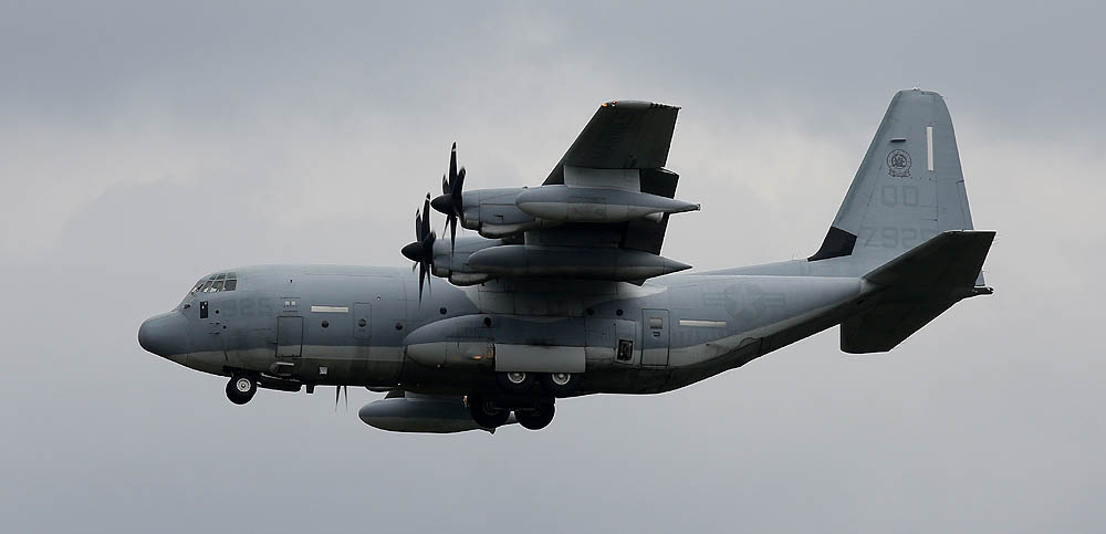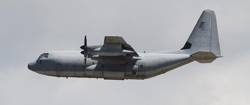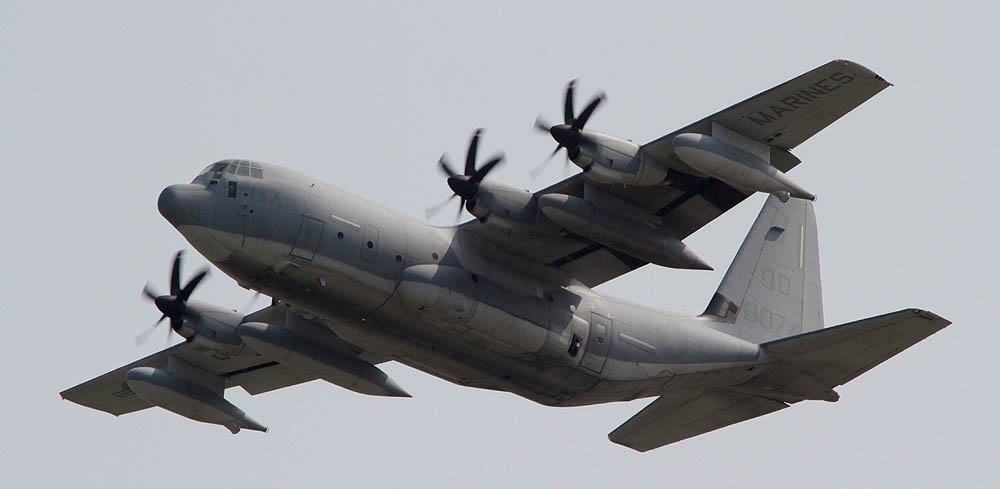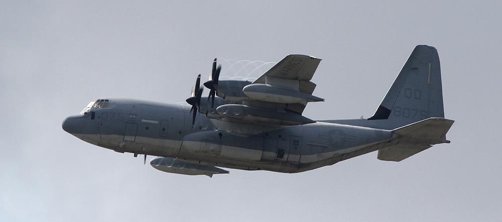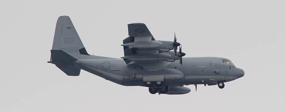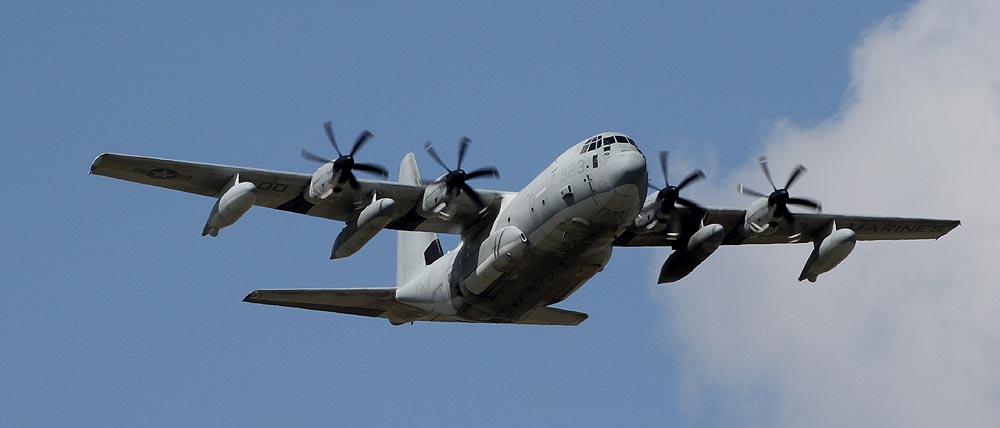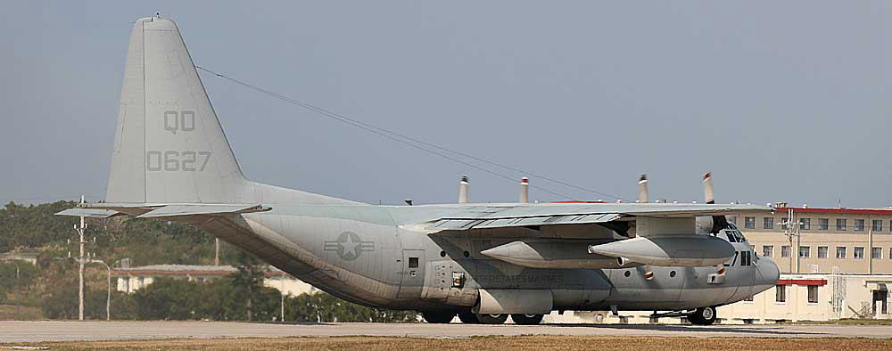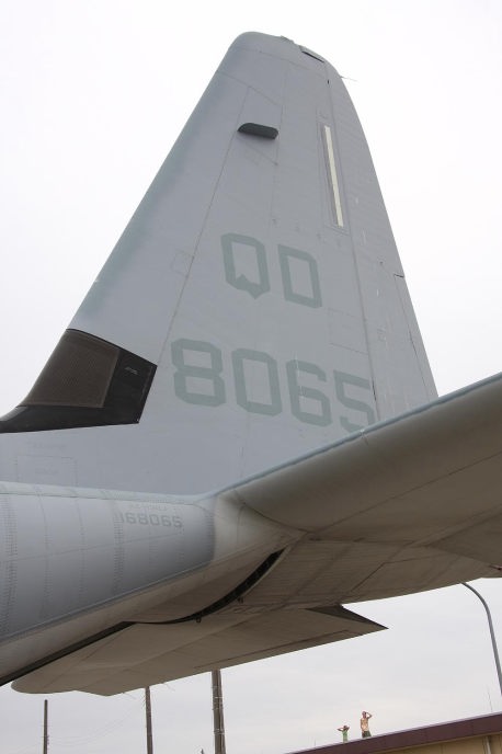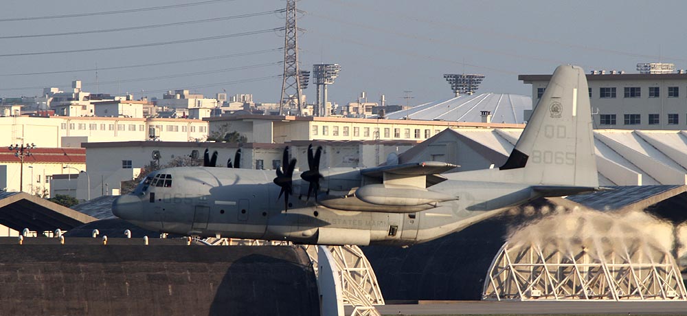 普天間基地返還後は、岩国へ移動が予定されているKC-130であるが それまではヘリ部隊と共に普天間の主である。トラフィック数の少ない普天間では、離陸前の充分なウォーミングアップに時間を掛けて離陸をしている。2007年12月普天間にて。