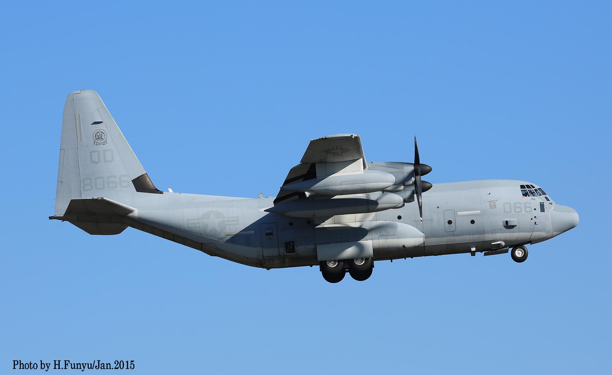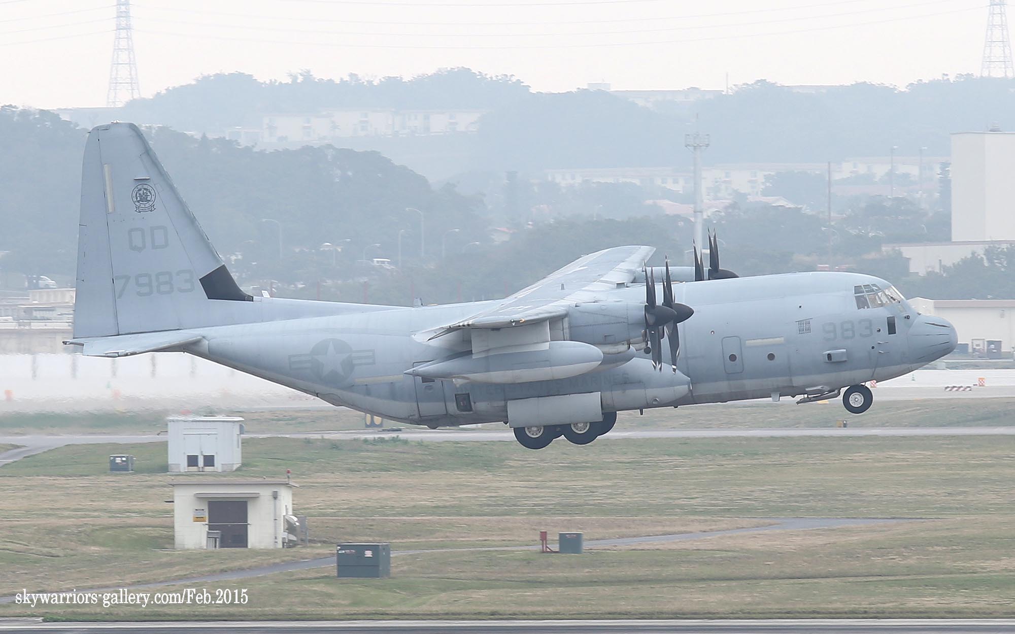 ↑写真は、2015年2月4日5日に撮影したものであるが 今までと異なるのが最近は尾翼に黒でインシグニアが入った事だろう。テールレターが薄くて読めないぐらいのロービジ塗装の中で インシグニアの強調は歓迎したい変化である。上写真は、KC-130J/Bu.No.167925