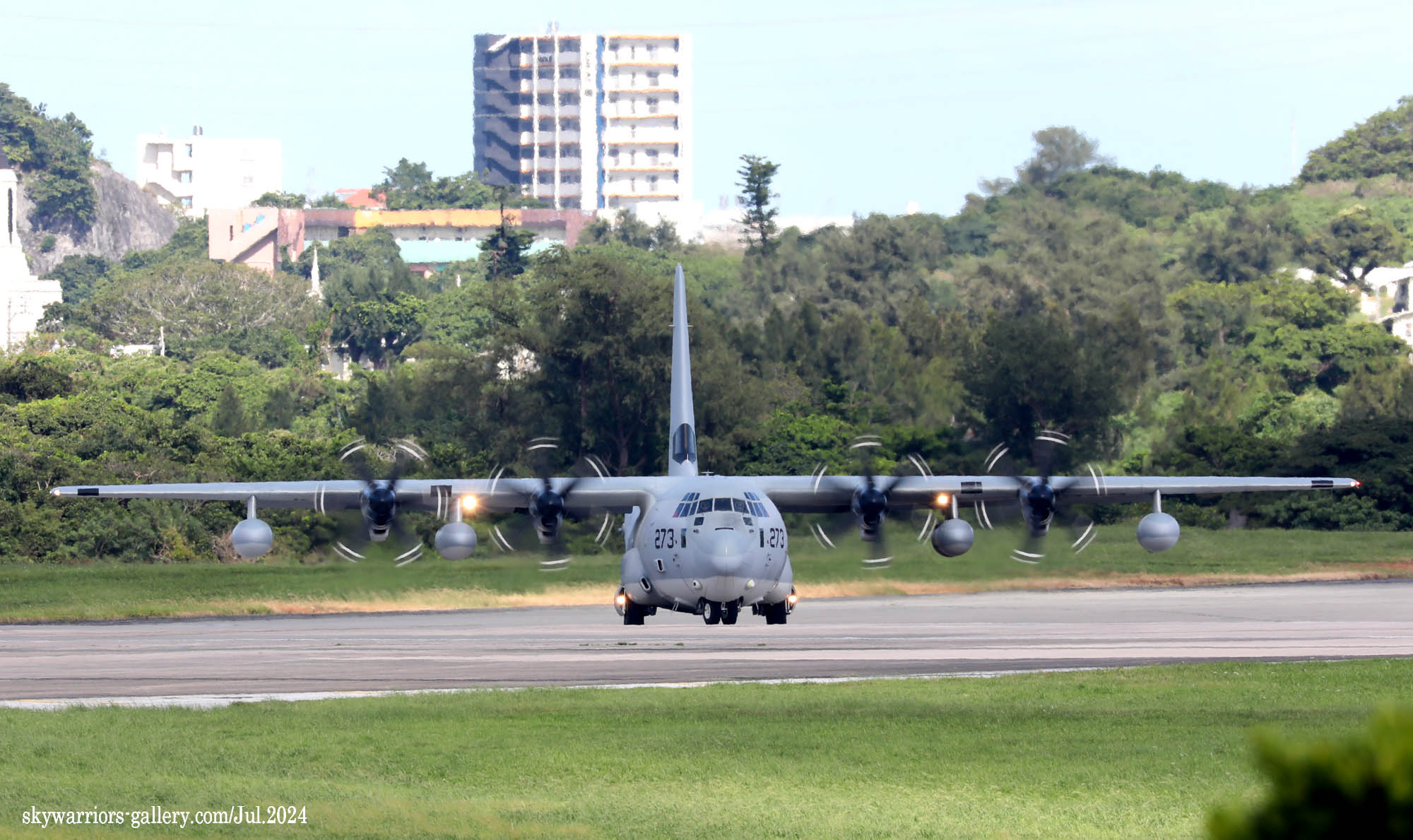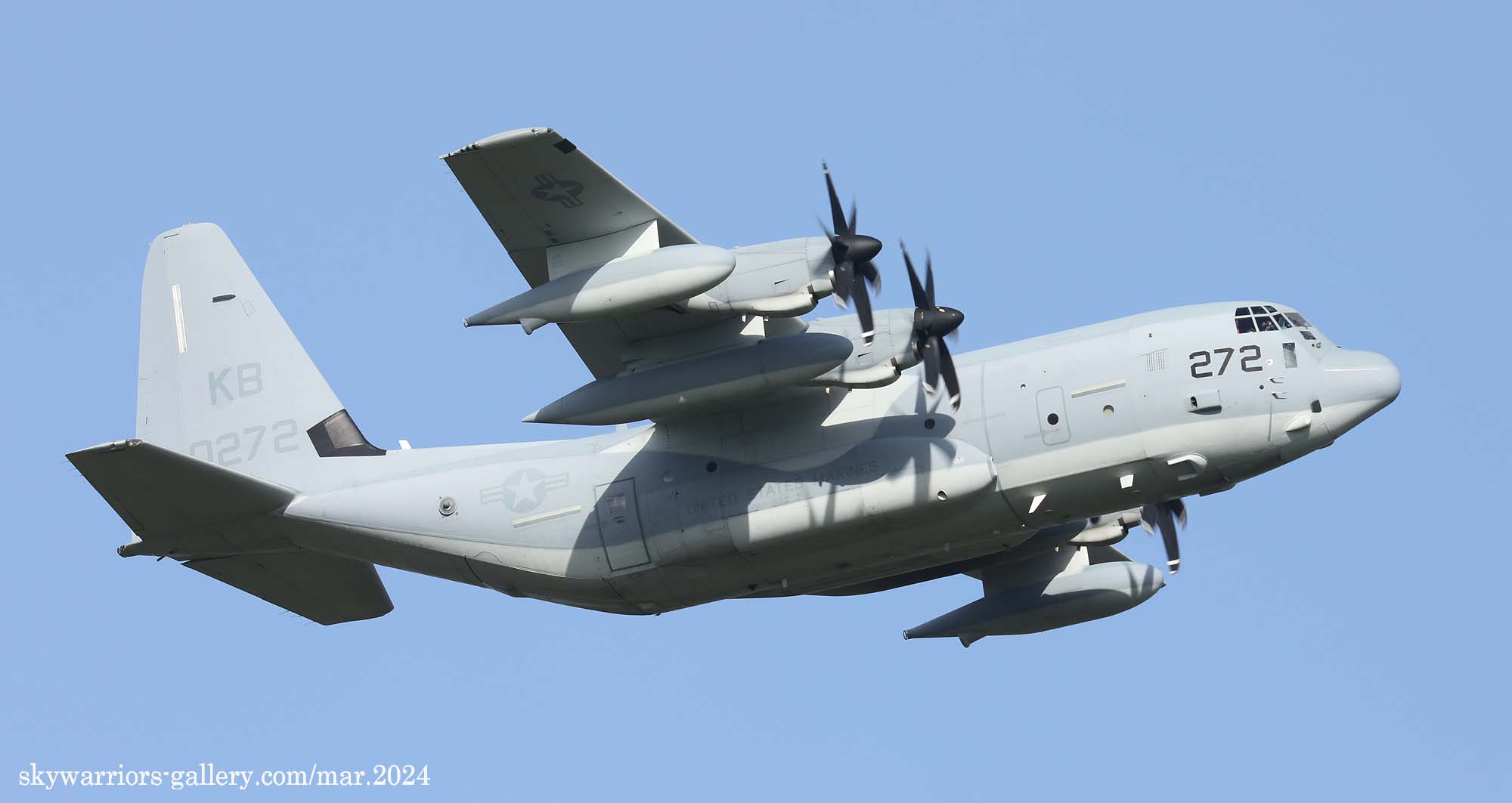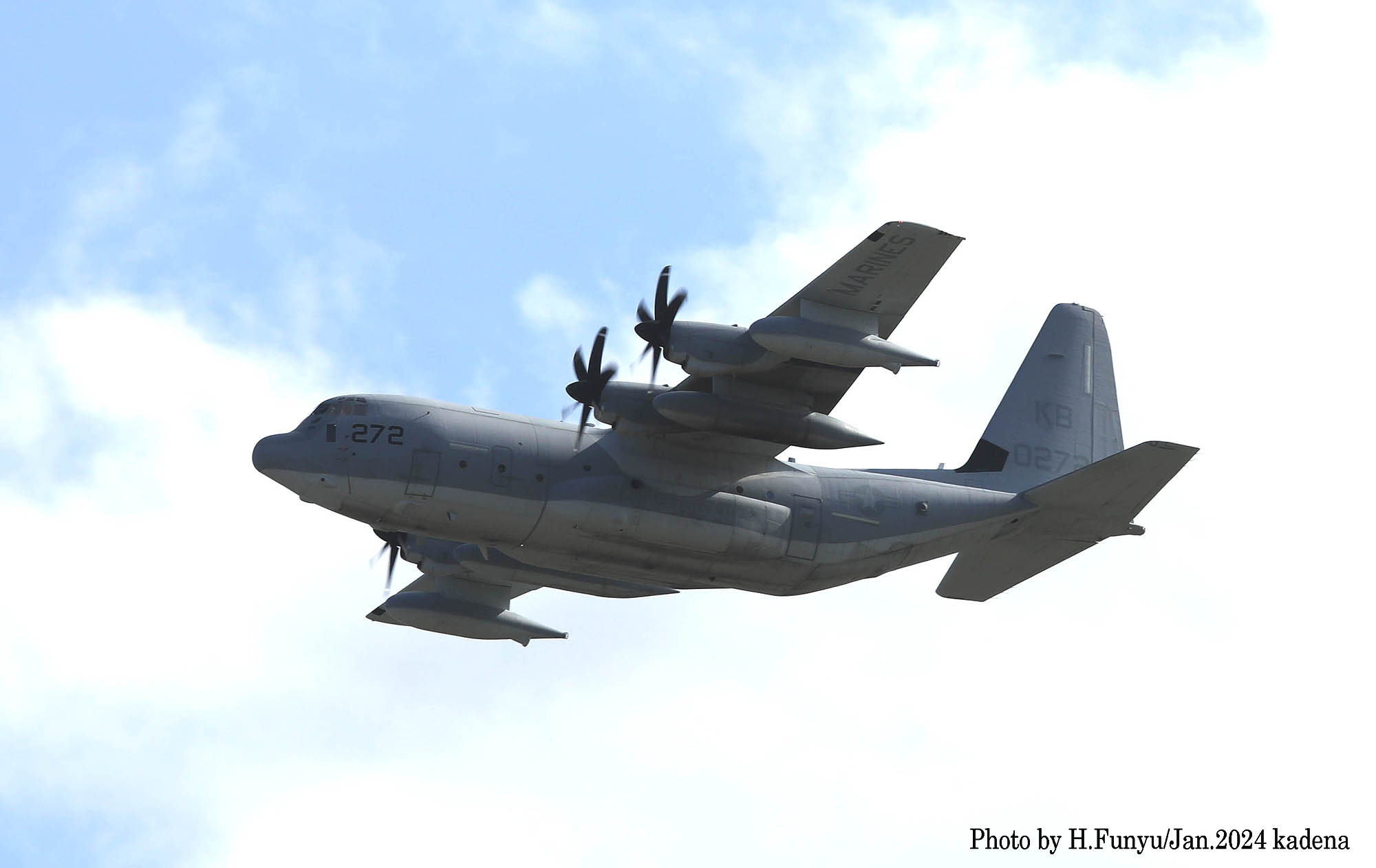 ↑ 2024年1月29日 フニュ君が沖縄旅行の中で立ち寄った嘉手納基地で、離陸して行ったVMGR-153のKC-130J/Bu.No.170272は、同飛行隊が最初に受け取った2機のKC-130Jの内の1機で、2023年1月6日に受領セレモニーが行われている。もう1機は、Bu.No.170273、どちらもピカピカの新品である。