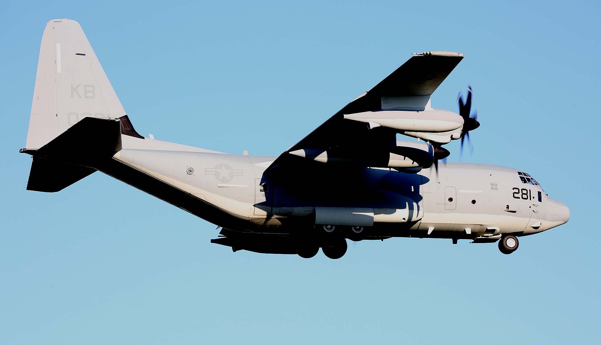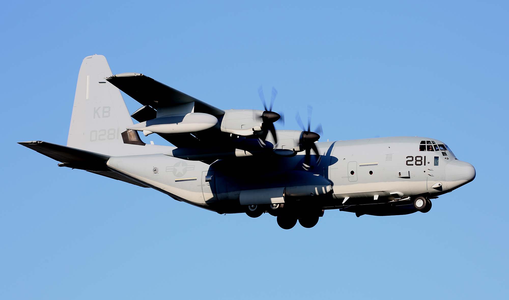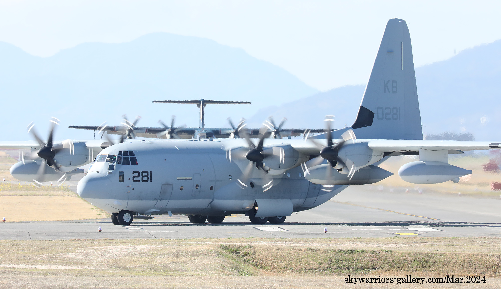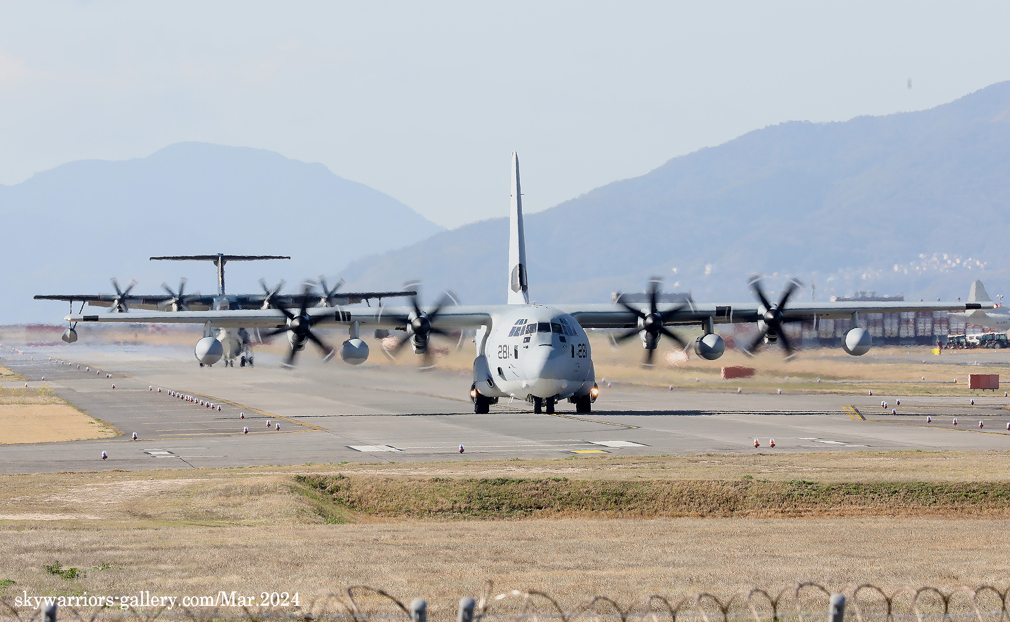 ↑ 2024年3月27日 岩国基地を離陸する為に誘導路より滑走路に進入するVMGR-153のKC-130J/Bu.No.170281。ビューアルナンバーも170000台を超えた航空機を目にするようになった。この機体より一つ若いBu.No.170280のKC-130Jも同隊の所属である。