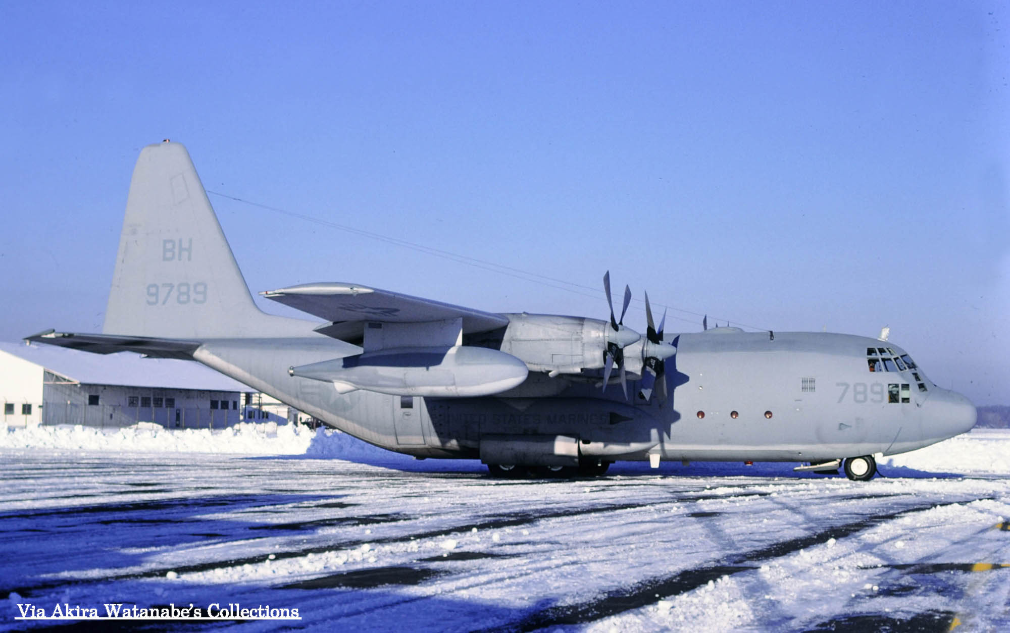 ↑ 1988年5月に撮影されたKC-130F/BH-9789。1980年代後半では多くの機体がグレー迷彩のロービジ仕様に変えられた。機体は古いが塗装は真新しい。光を反射しやすい胴体上部はより暗いグレー色で塗られている。