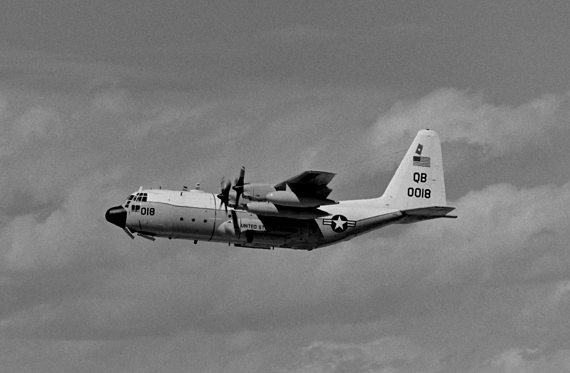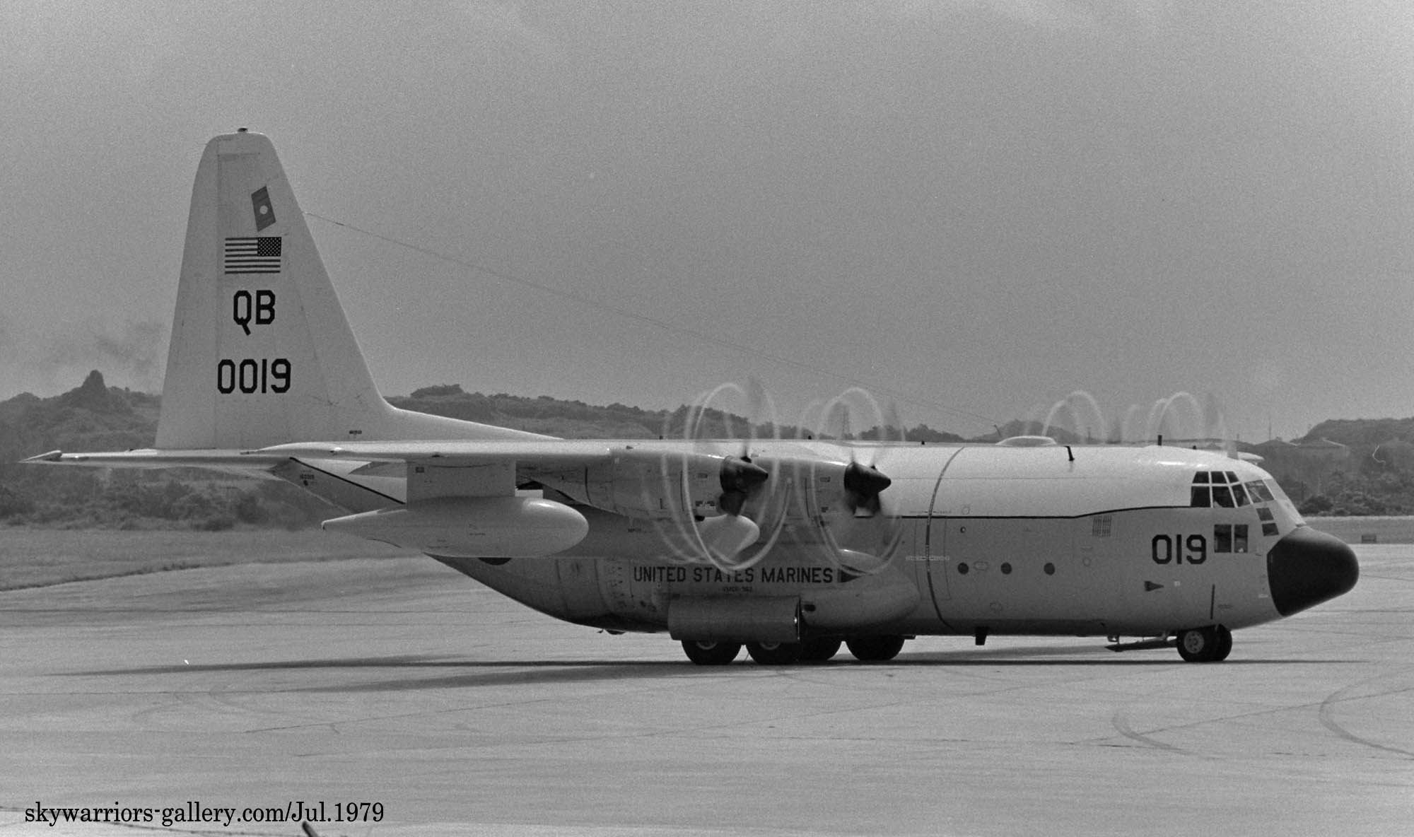 ↑ 1979年7月沖縄嘉手納基地で撮影したKC-130R/QB-0019。湿気の多い中、プロペラからはべーパーが出ている。