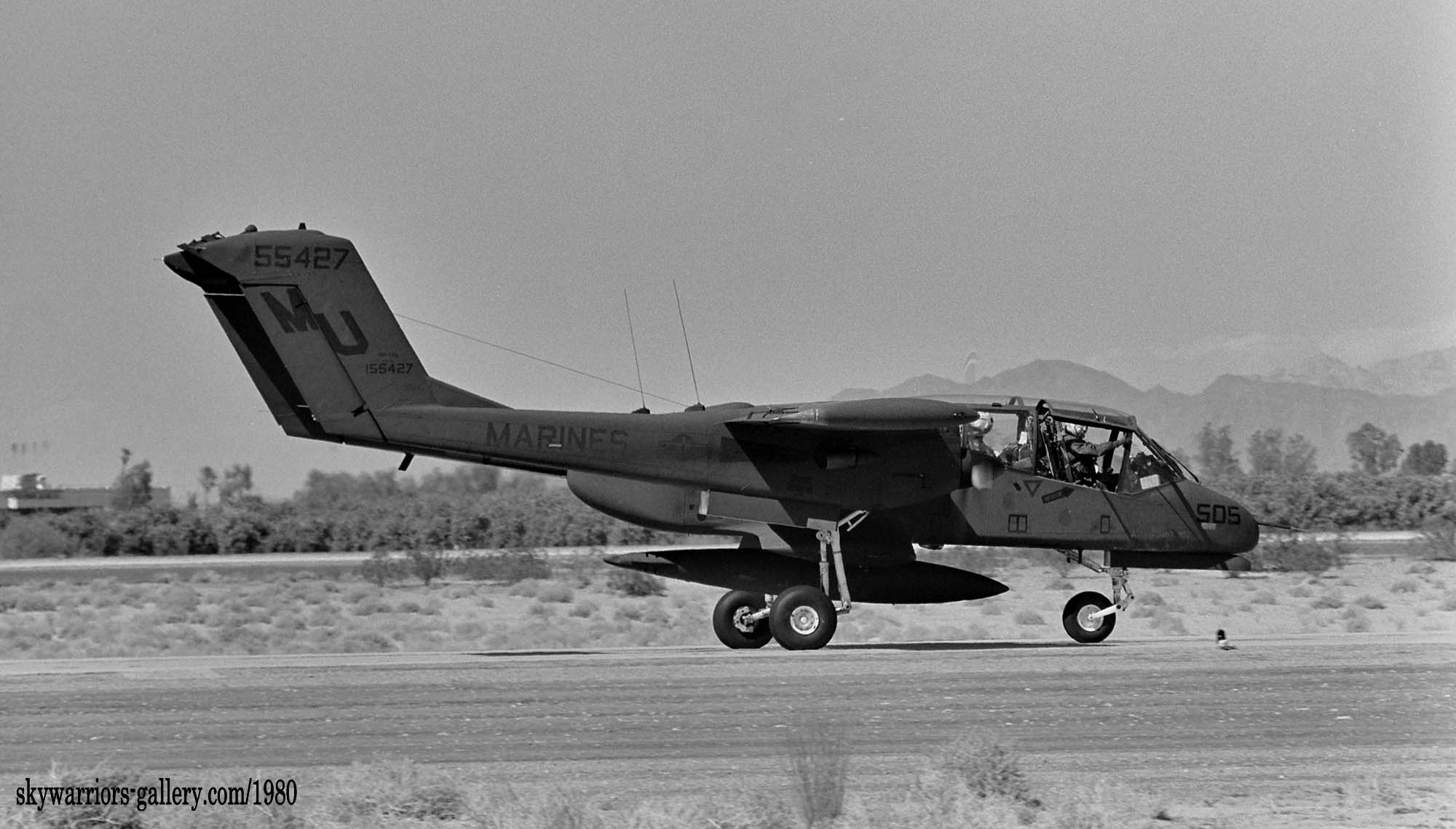 ↑ 1980年2月 アリゾナ州ユマ海兵隊基地に飛来したVMO-4のOV-10A/Bu.No.155427。この機体は、1973年には沖縄のVMO-6に所属し”WB-01”の機首番を付けていた。