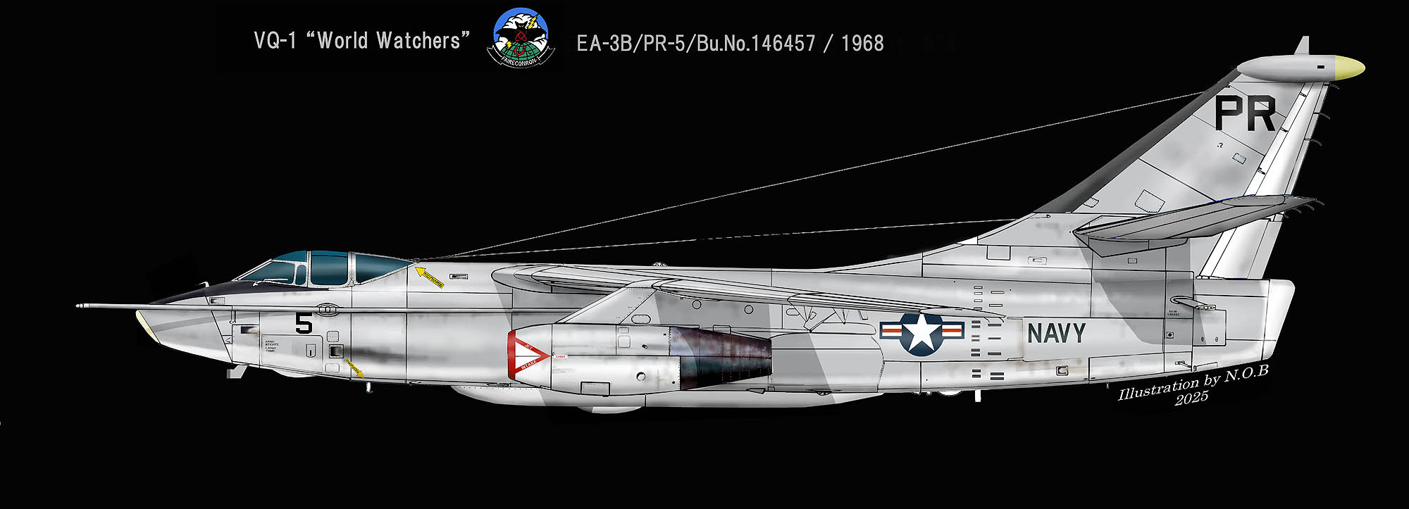 ↑ 1968年頃 厚木基地で活動していたVQ-1のEA-3B/PR-5/Bu.No.146457。尾翼端のECMアンテナ、機首下のL型アンテナ、胴体下の小さめのカヌー型アンテナなどが特徴だった。White Bearさんが厚木基地で最初に撮られたVQ-1のEA-6Bでもあるが、鼻が白く塗られていた時期もあった。