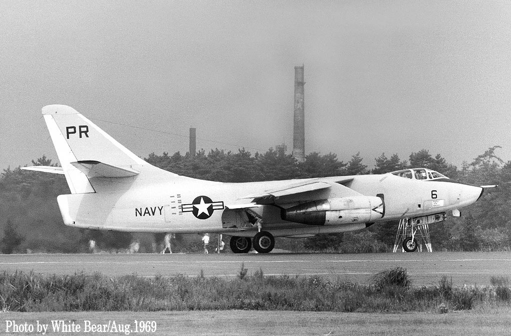 ↑ 1969年8月16日厚木基地南側で離陸を待ちをするVQ-1のEA-3B/PR-6/Bu.No.142671。尾翼先端のECMアンテナが撤去されているが、この時点では機首下のL字アンテナは撤去されていない。また胴体底部のカヌーアンテナも新型に更新されていない。