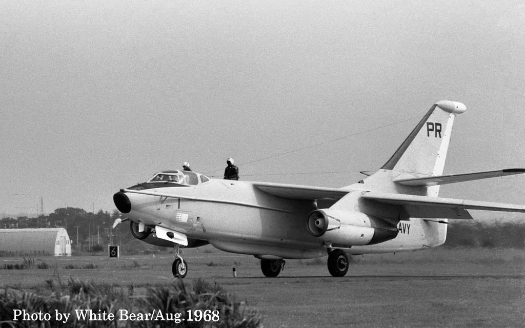 ↑ 1968年8月16日厚木基地を離陸の為タキシーするVQ-1のEA-3B/PR-1。VQ-1のEA-3Bは、ノーマークで機番以外区別しにくいとか、厚木基地がベースで地元のマニアも真剣に撮らないこともあり、余り意欲的に撮らなかった事を反省している。今になってみれば、もうすこし真剣に向き合っていたら良かったなと思う。