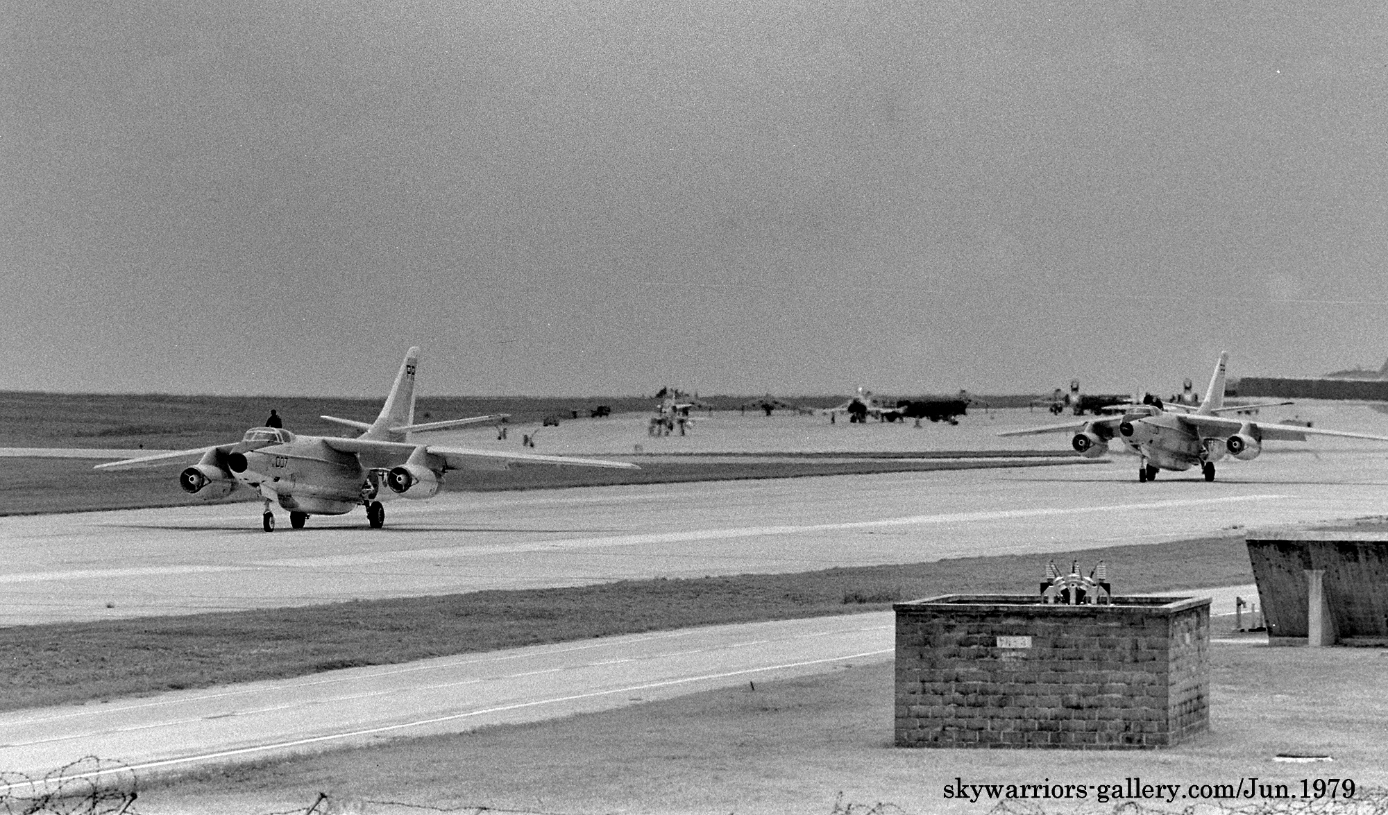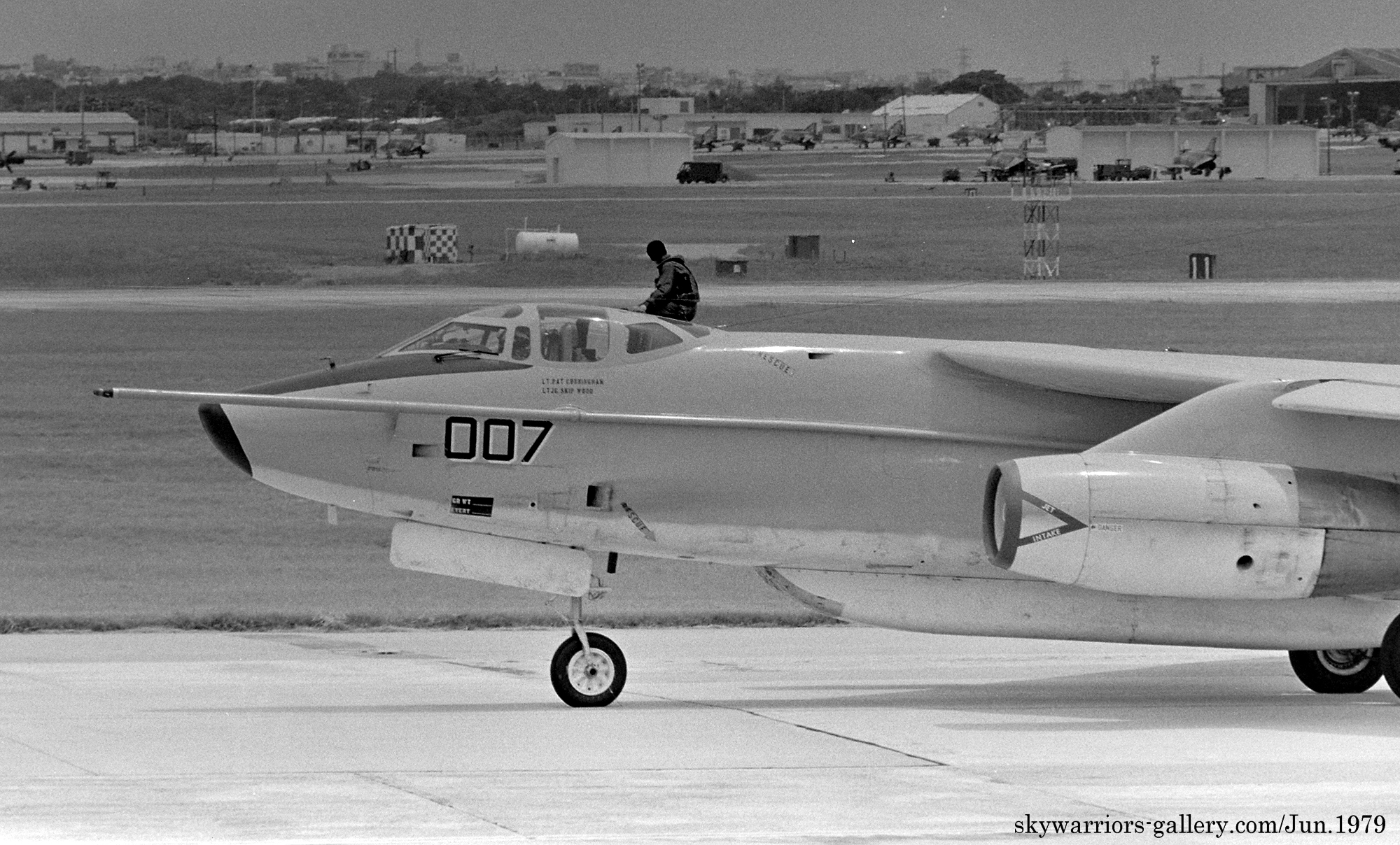 ↑ 1979年6月末 VQ-1の2機のEA-3Bが嘉手納基地の旧海軍エリアに飛来していた。この2機のスカイウォリアー電子戦機は、同年10月にUSSキティホークの艦上で見たEA-3Bと塗装も殆ど同じであったので(001/007の尾翼の塗り分けも同じ)、恐らく同じ機体だと考えられるが、この1979年の夏は嘉手納基地に飛来していた艦載機の殆どが、近海にいたUSS RANGERのCVW-2であった事から、キティホークも近くまで来ていたのかもしれない。