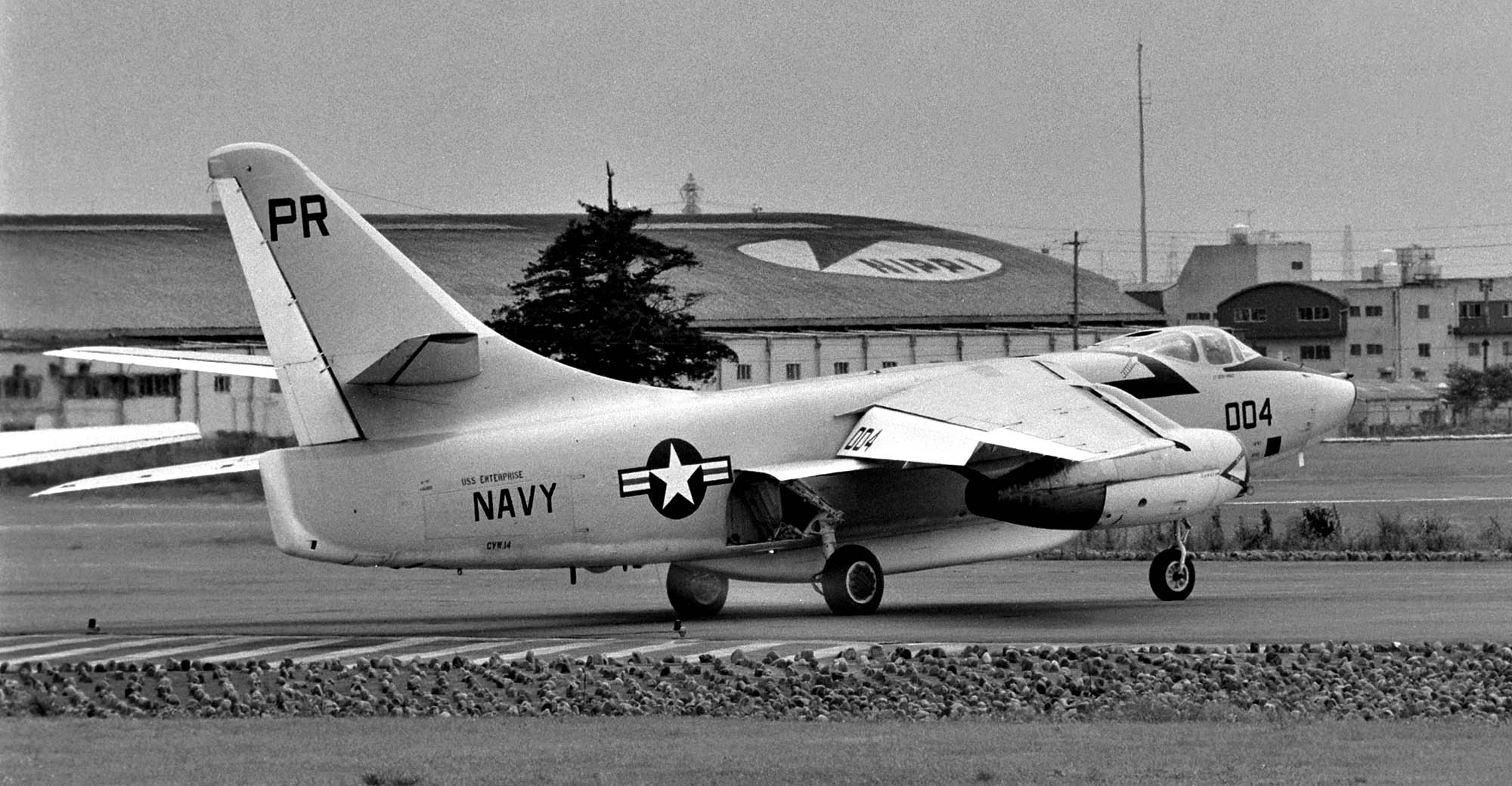 ↑ 1977年 厚木基地に飛来したVQ-1のEA-3B/Bu.No.146459。コックピット後方に黒い矢尻が書かれたレアなスカイウォリアーで、しかもUSS ENTERPRISEと艦名/CVW-14の表記も有り、興奮した被写体である。