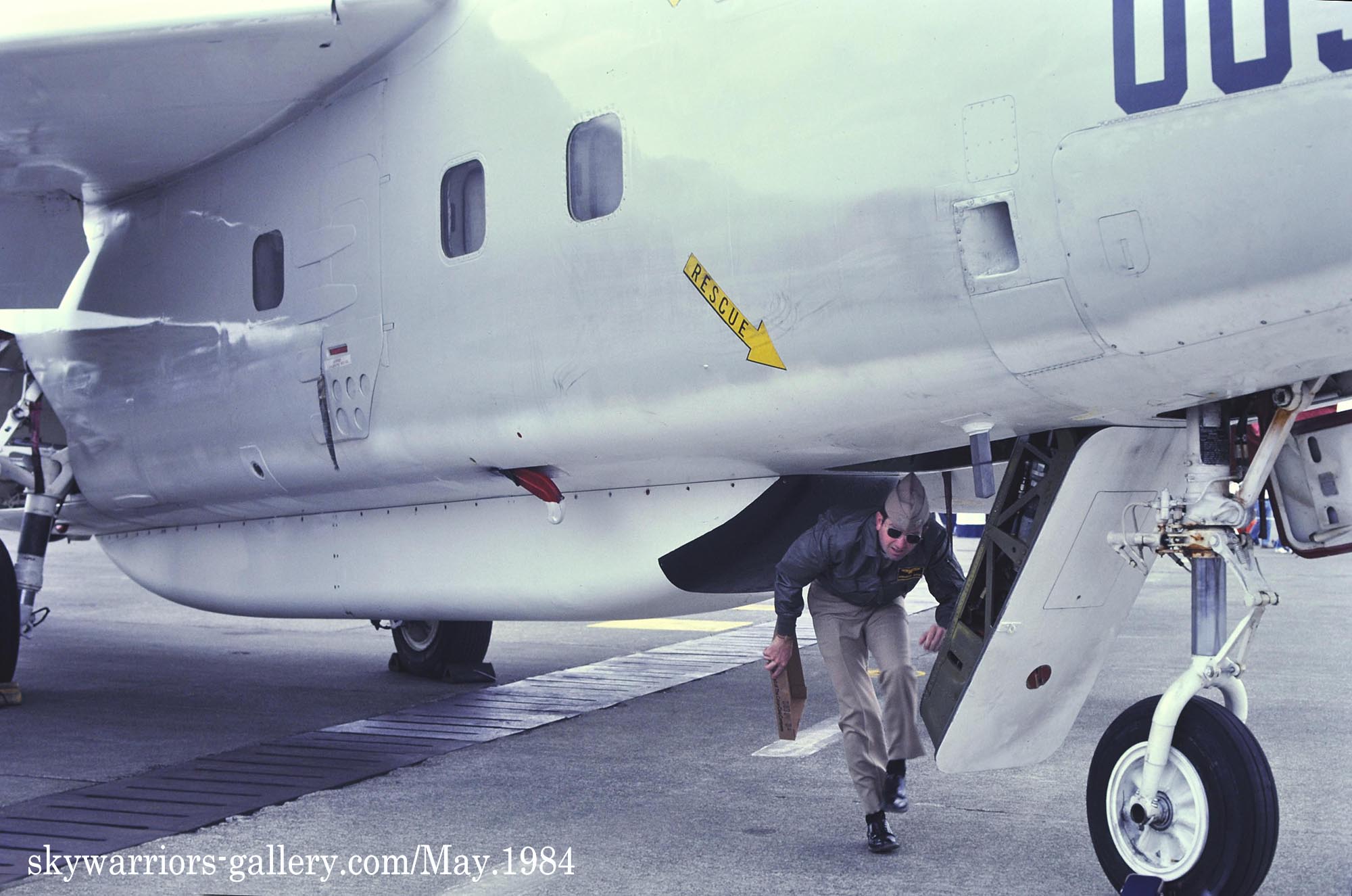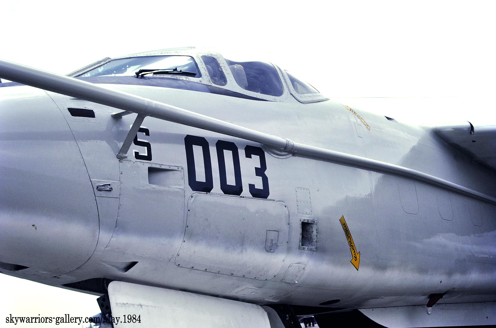 ↑ 1984年の厚木基地航空祭に展示されたVQ-1のEA-3B/PR-03/Bu.No.146452。展示機でもなければ、胴体後部のビューアルナンバーを中々はっきりと撮影できないので、わざわざ此処を狙って撮った記憶がある。この1984年前後から、統一された蝙蝠のデザインでEP-3E等もマークを入れるようになって、厚木の海軍マニアが嬉しかった時期である。