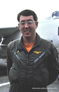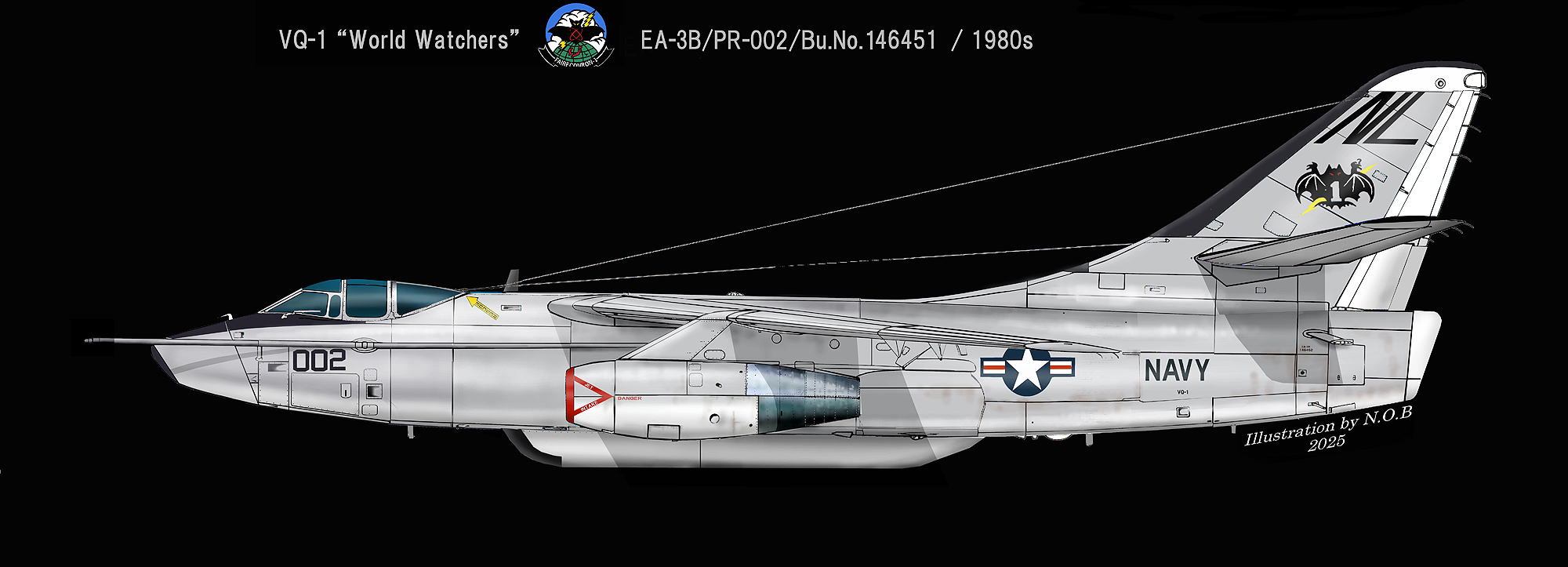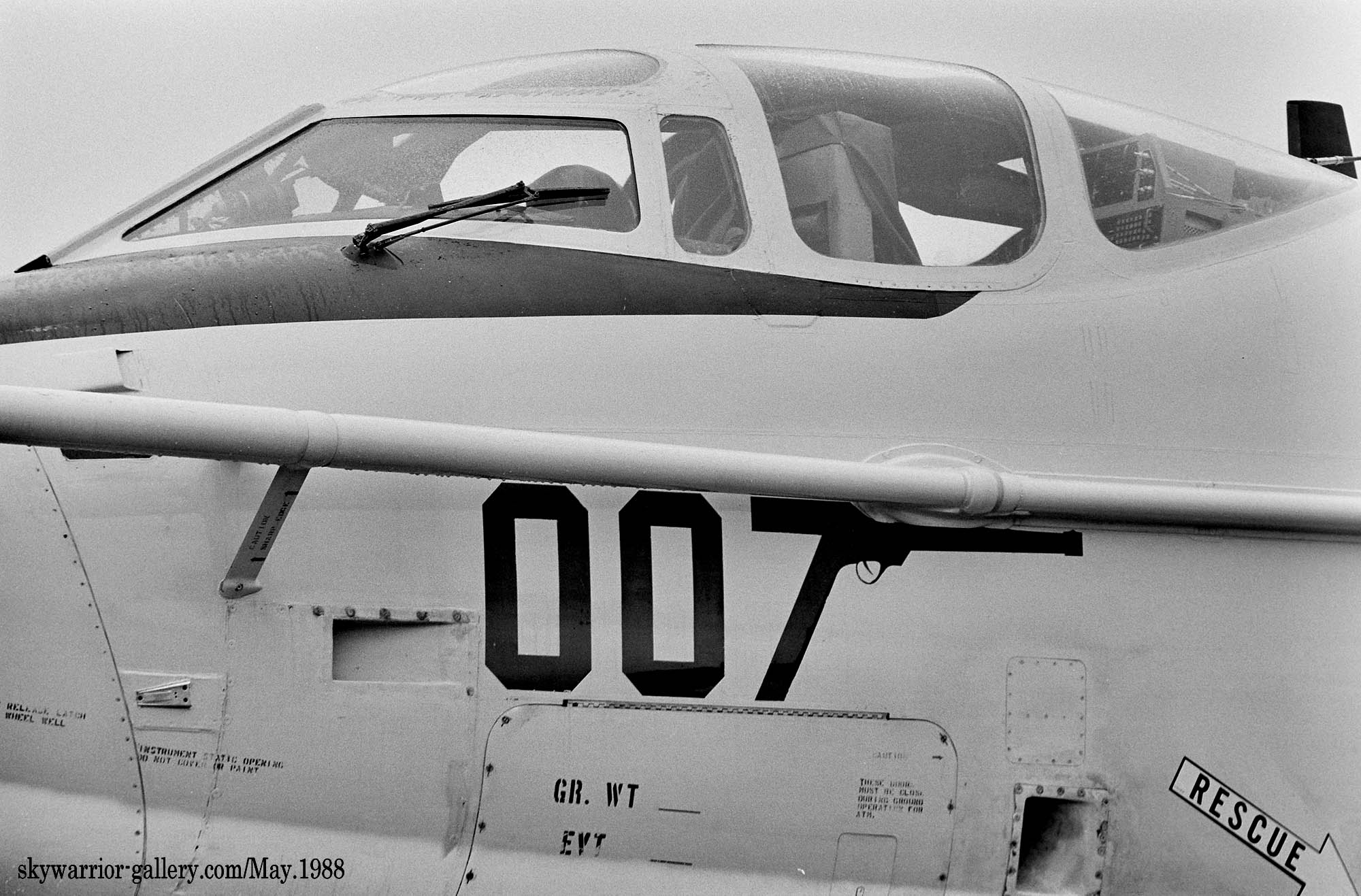 ↑ フニュ師匠が1983年1月厚木基地で撮影した貴重な”NH"のテールコードを入れたVQ-1のEA-3B。ビューアルナンバーは不明だが、恐らくBu.No.144849であろう。尾翼のチップの”007”の7はルガー拳銃の形をしており、映画007のロゴを真似ている。