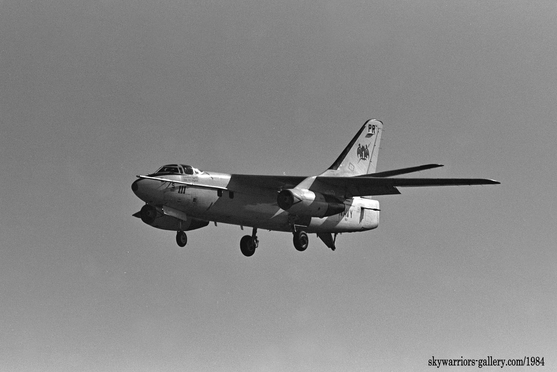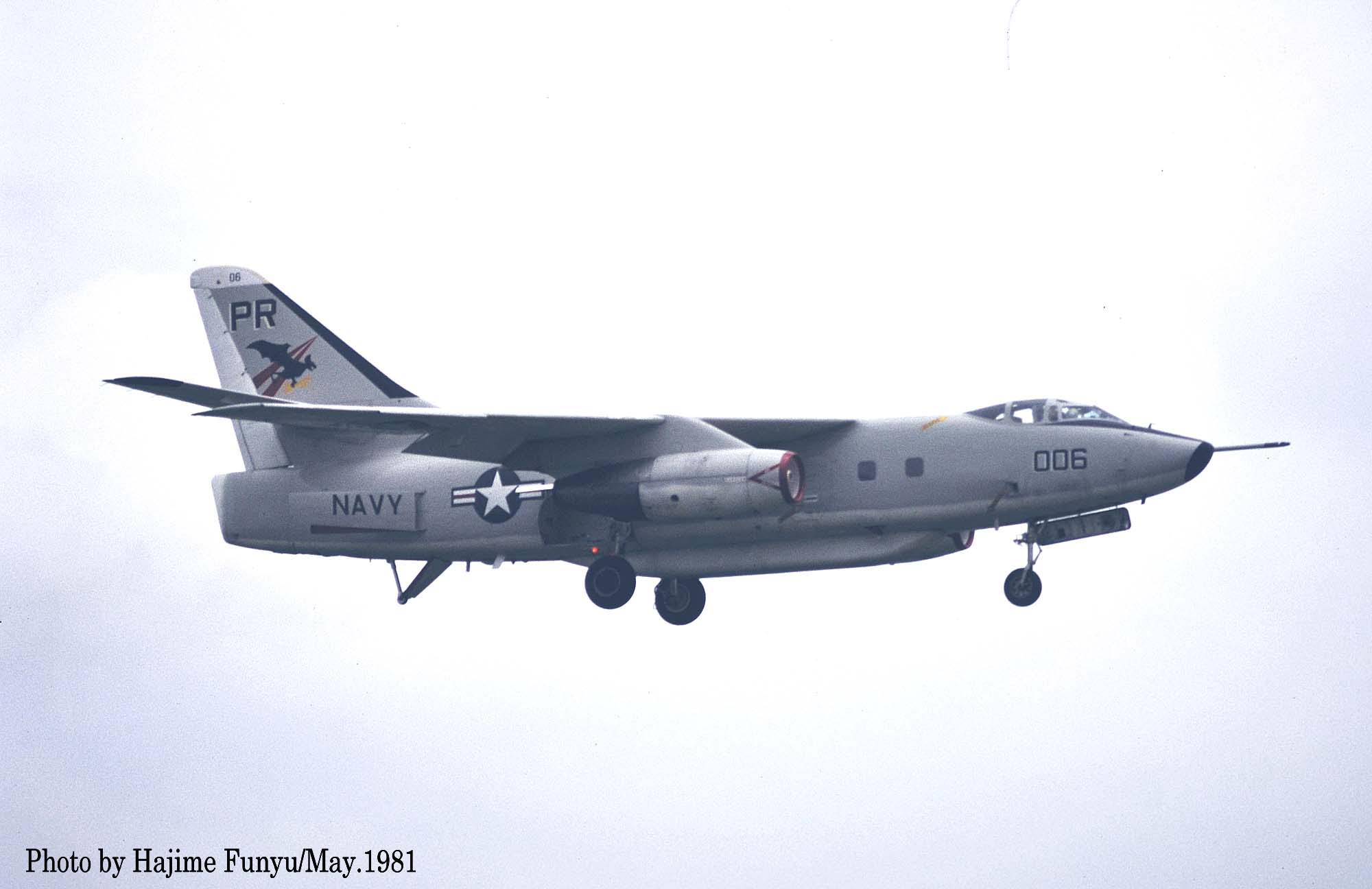 ↑ VQ-1の機体でシンボルの蝙蝠が横方向に書かれた珍しいデザインで、しかも1981年頃は殆どノーマークの機体が多かった中、注目されたEA-3Bであった。このPR-006のEA-3Bは、Bu.No.142671で、8月にも飛来している。