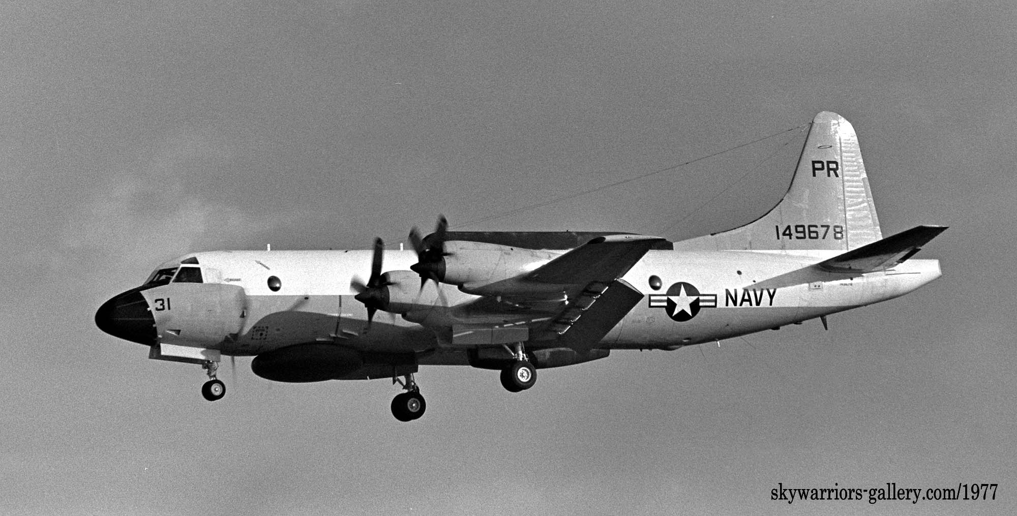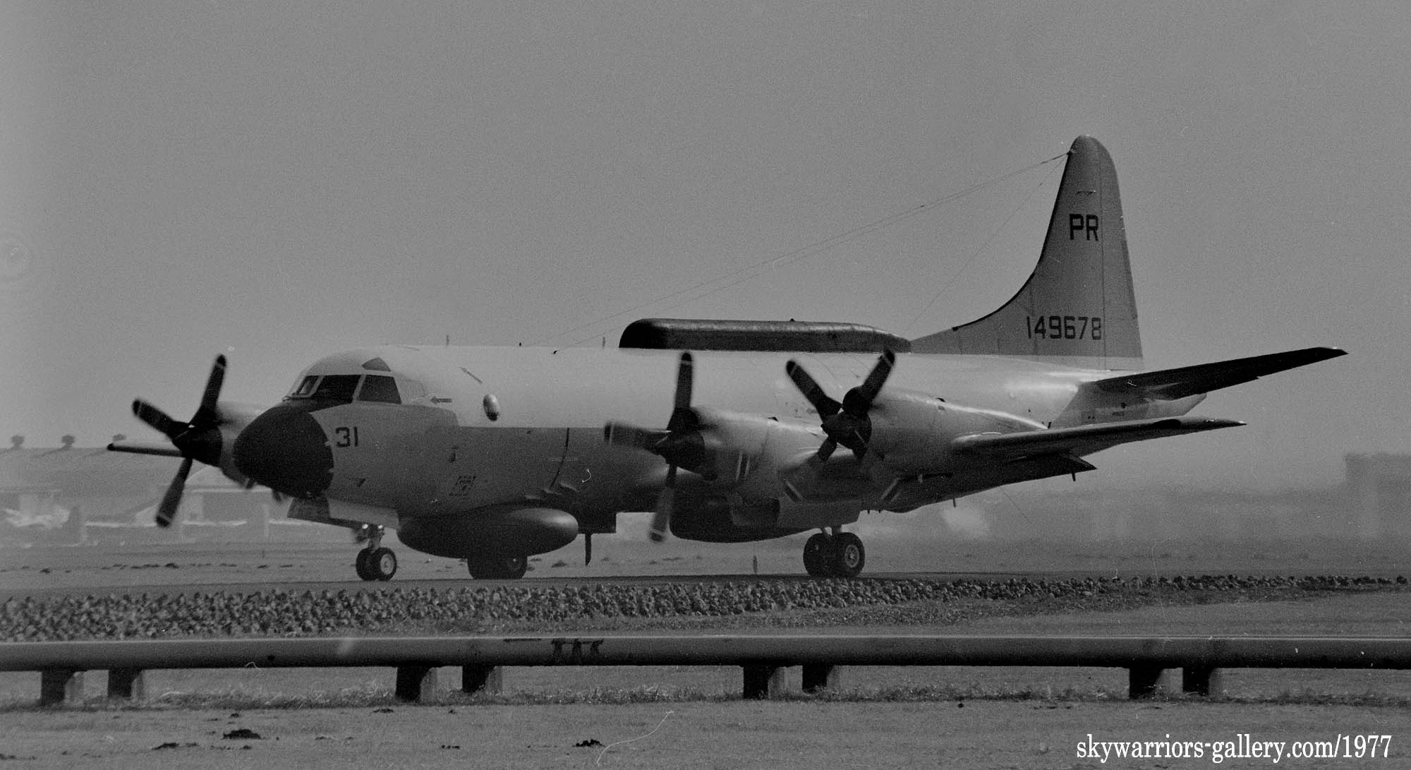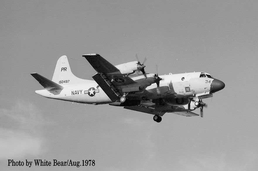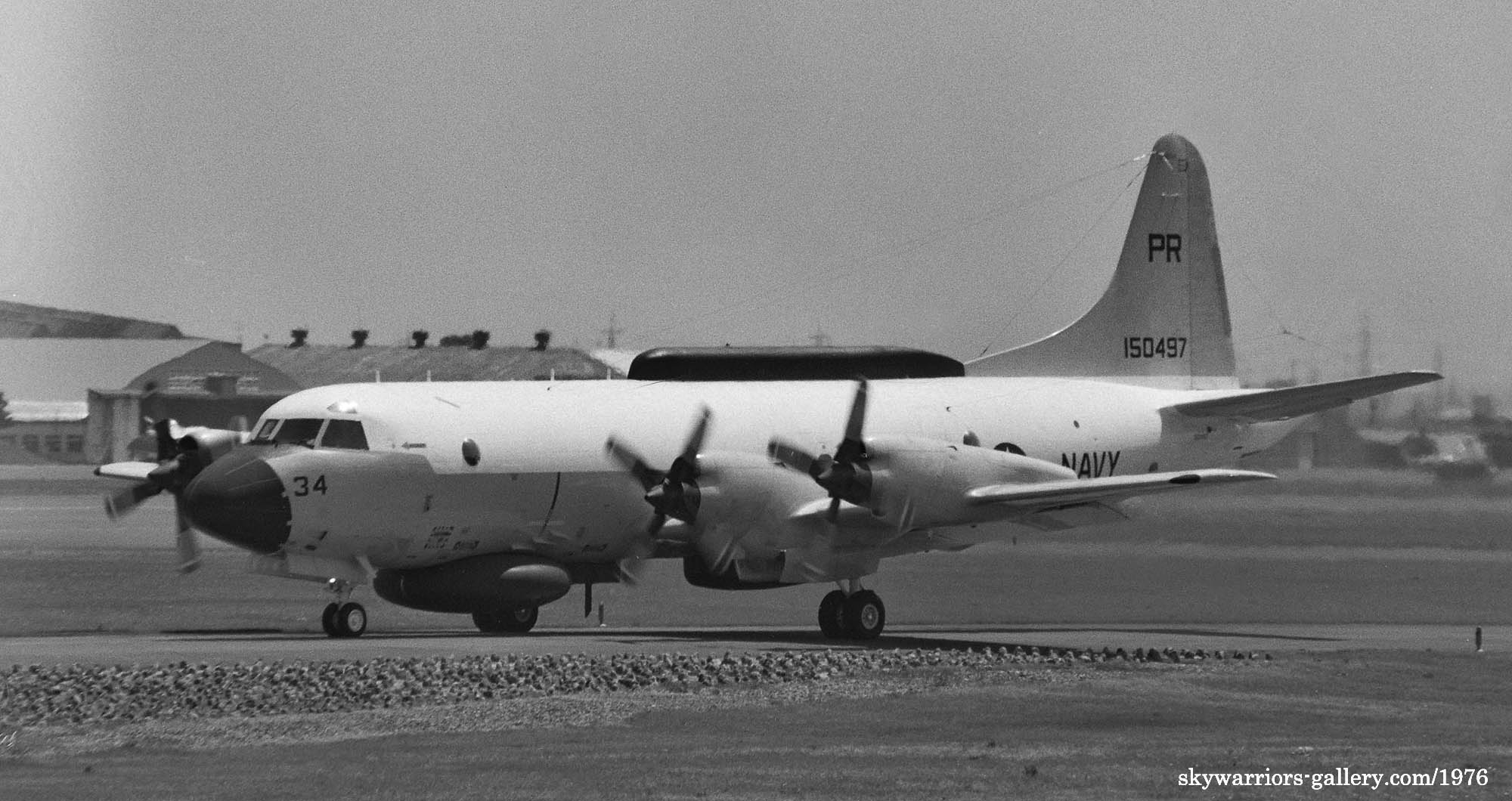 ↑ 1976年厚木基地のR/W19に向かう為タキシーするEP-3E/PR-34/Bu.No.150497。以前はずっとEP-3Bだと思っていたが、実は1972年にP-3Aから改造されたEP-3E DEEPWELLと言うタイプだ。PR31/32までがEP-3B、それ以降のPR-33/34/35/36は、全てEP-3Eである。