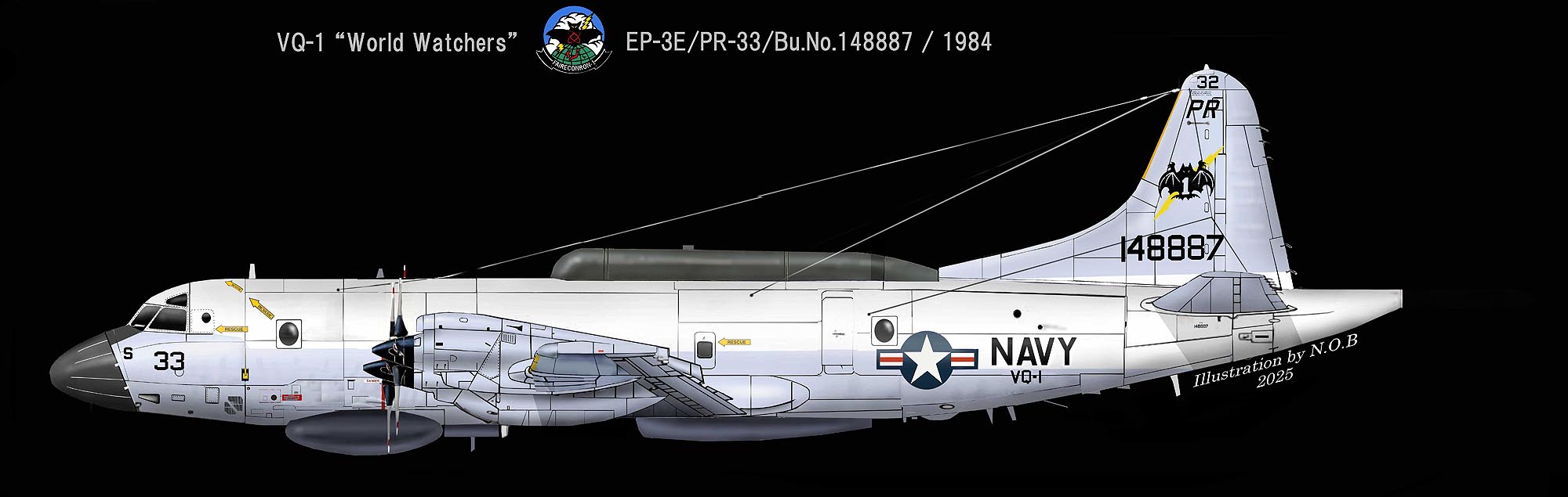 PR-31/32の2機のEP-3Bが厚木基地に来る前は、コンステレーション旅客機を改造して電子戦機にしたEC-121Mが活躍していたが、ご存知の通り1969年4月5日 北朝鮮沖でMig戦闘機に撃墜されて31名もの犠牲者が出る事件となり、1970年には南ベトナムのダナンでもEC-121Mは、着陸中に墜落事故を起こし格納庫に衝突、22名の犠牲者を出していた。そのような状況によってEC-121の引退とEP-3Eへの更新にも拍車がかかって行くことになるが、EC-121Mの減少と共にVQ-1の使用機はEP-3B/EとEA-3Bが中心となって、1971年には本拠地をグアム島のアガナ海軍基地に移している。またベトナム戦争中はフィリピンのキュービーポイントに分遣隊を置いてベトナム戦の側面支援を行っている。