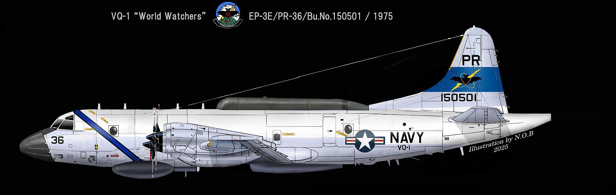 ↑ 1975年頃VQ-1のEP-3E/PR-36に施された歴代最も派手なマーキングで、何と胴体に青い帯まで入っていた。残念ながら1年少々で消されてしまったようで、1976年には厚木で姿を見る事は無かったと思う。EP-3E