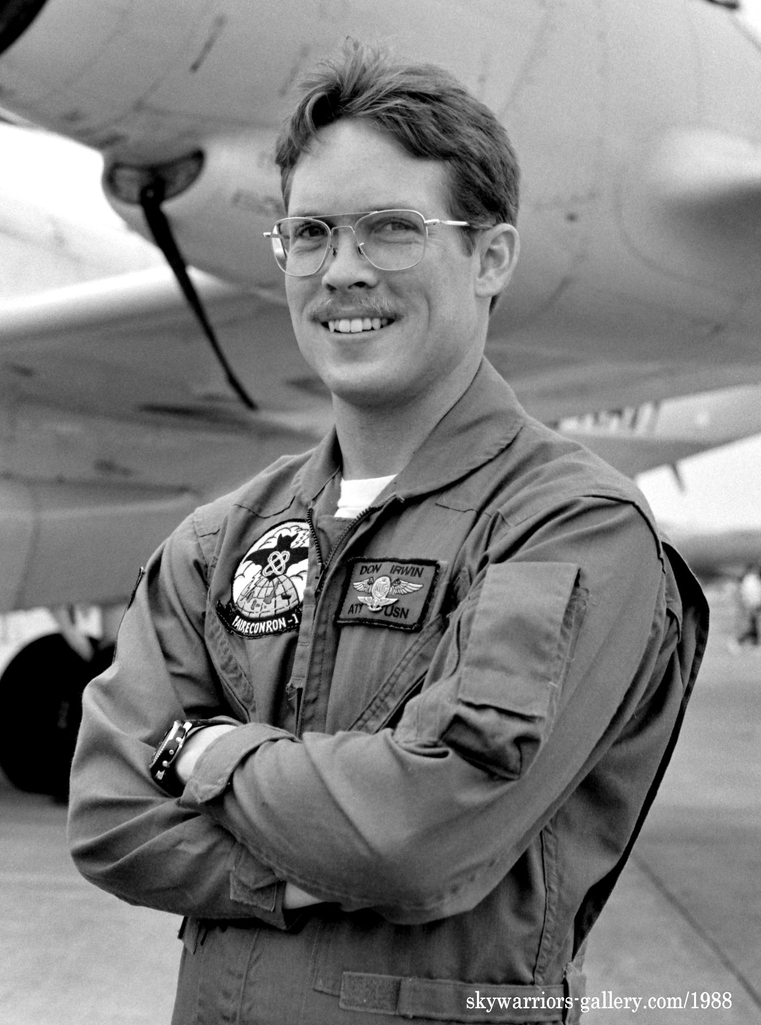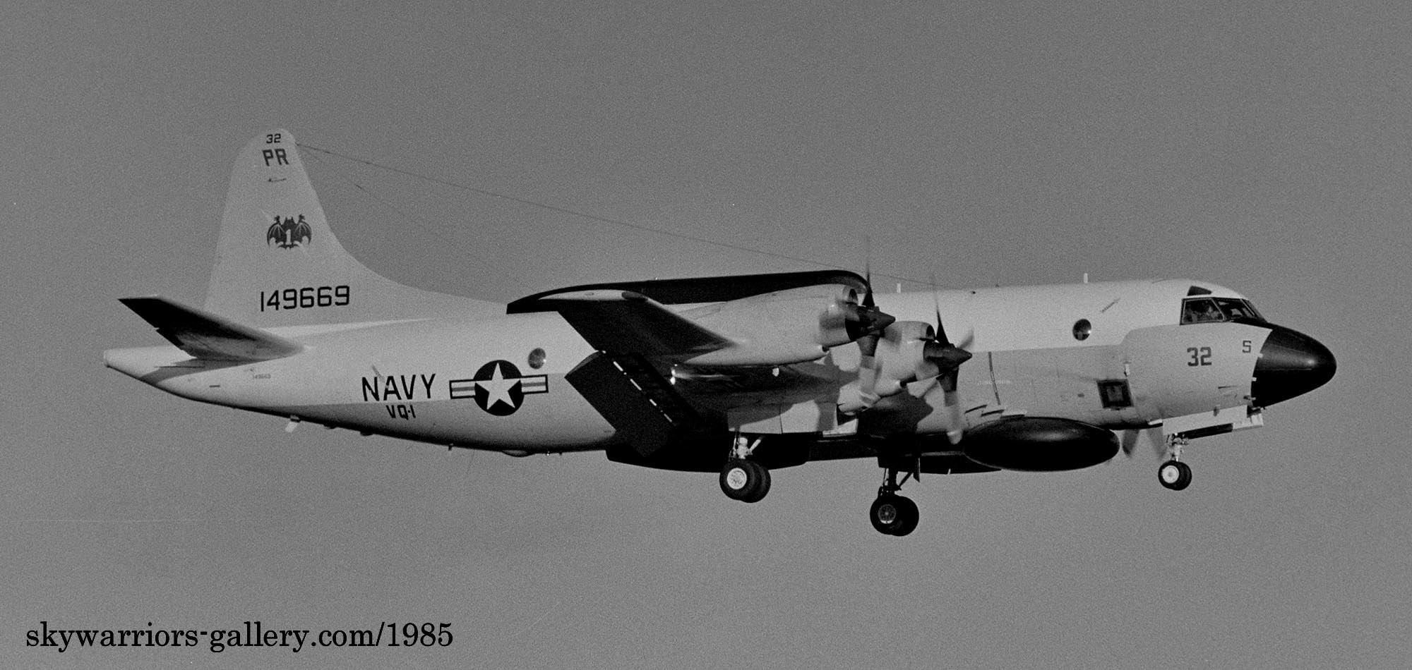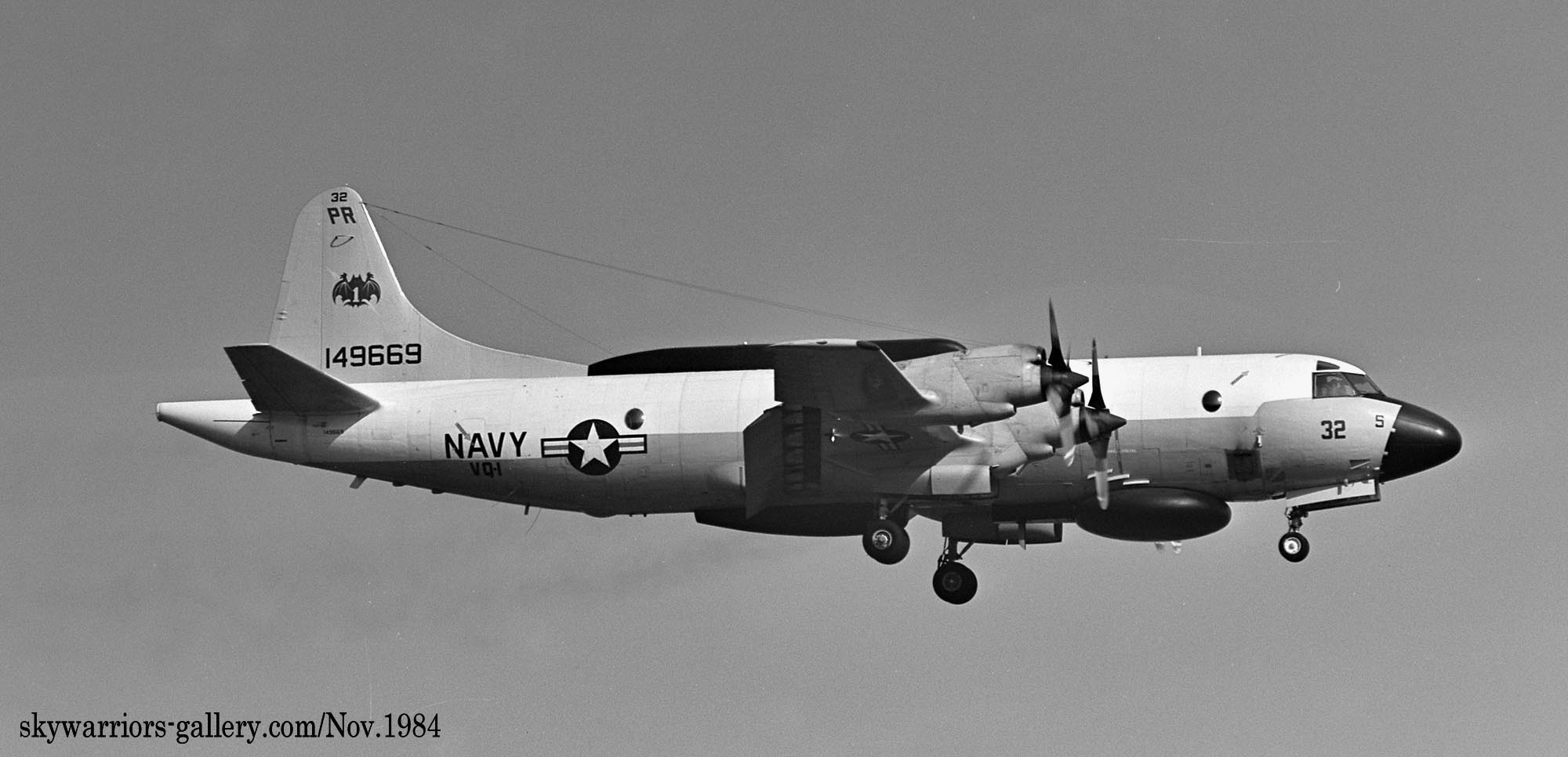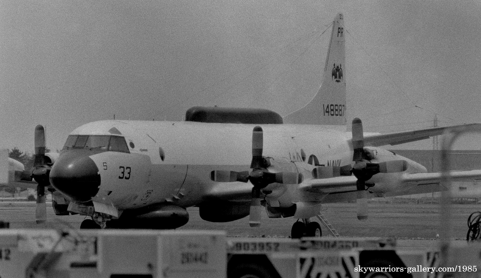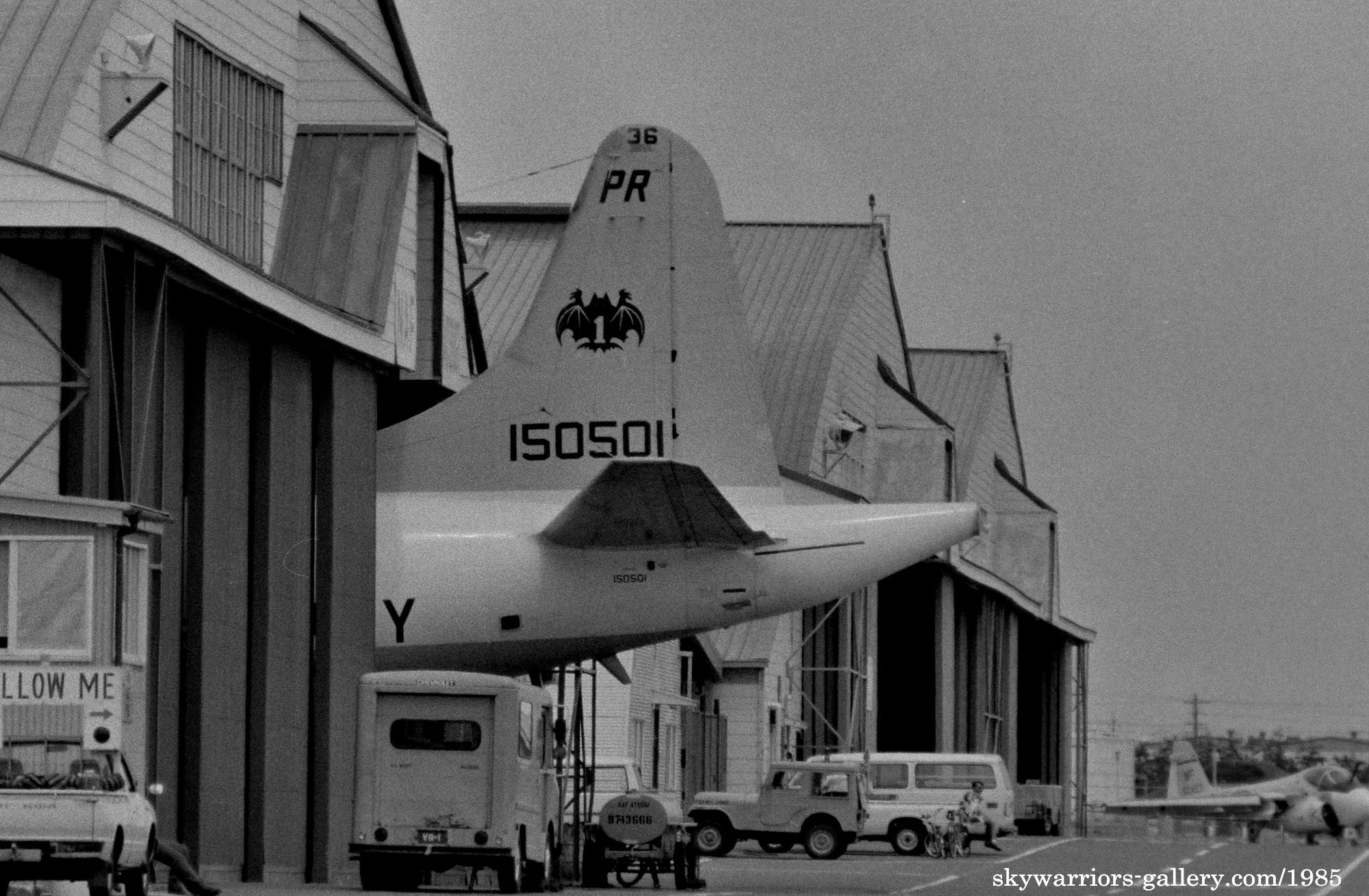 ↑ 1985年5月の厚木基地航空祭で格納庫に収まって尾翼だけが出ていたVQ-1のEP-3E/PR-36。VQ-1にとって1985年は年初から不運だったのは、1985年1月23日 VA-3B スカイウォリアーがグアム島へ向かう途中で墜落して、8名のVQ-1隊員が行方不明になり、その中には1984年3月にVQ-1の司令官となったジョン・T・ミッチェル中佐(CDR