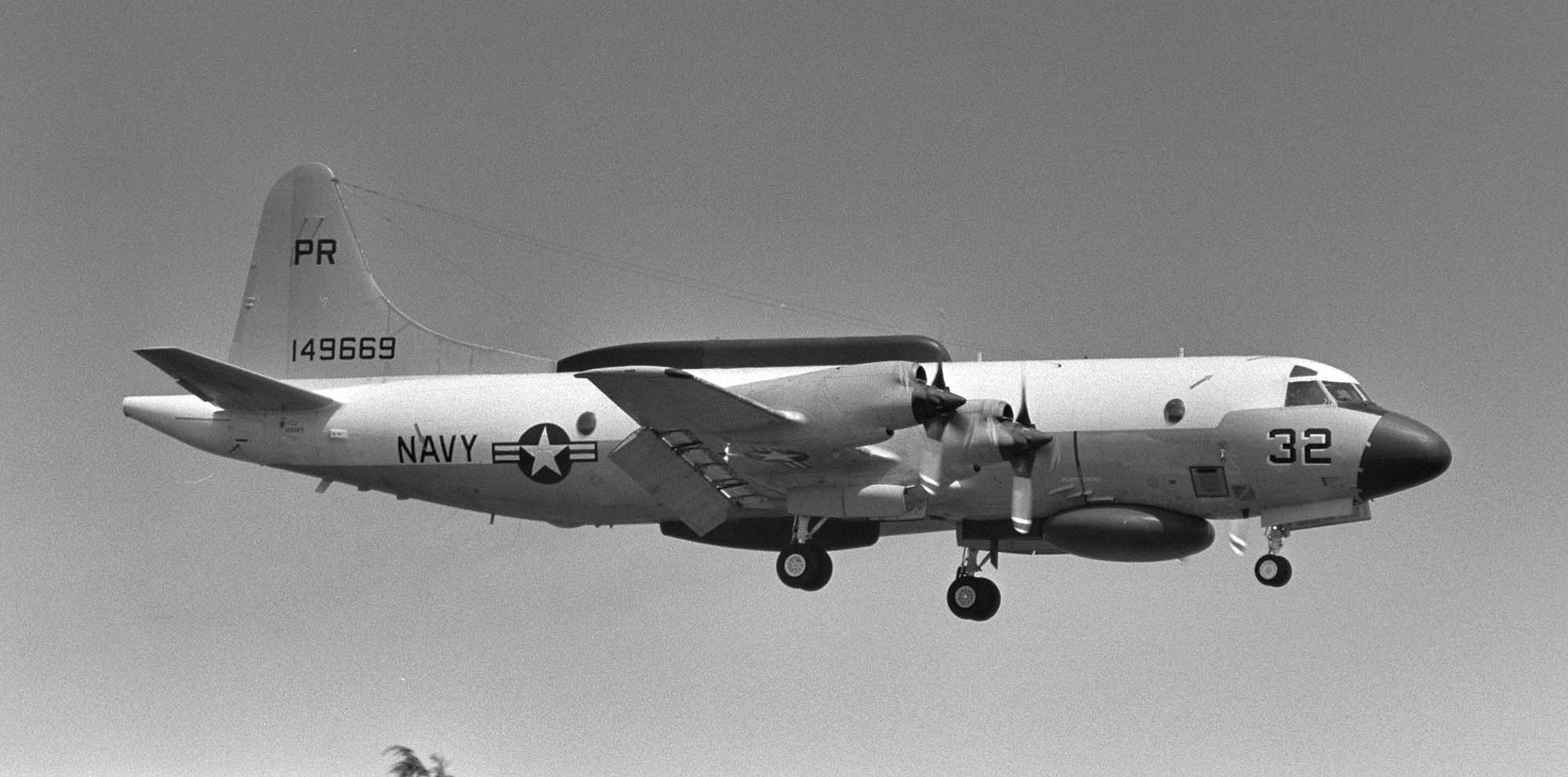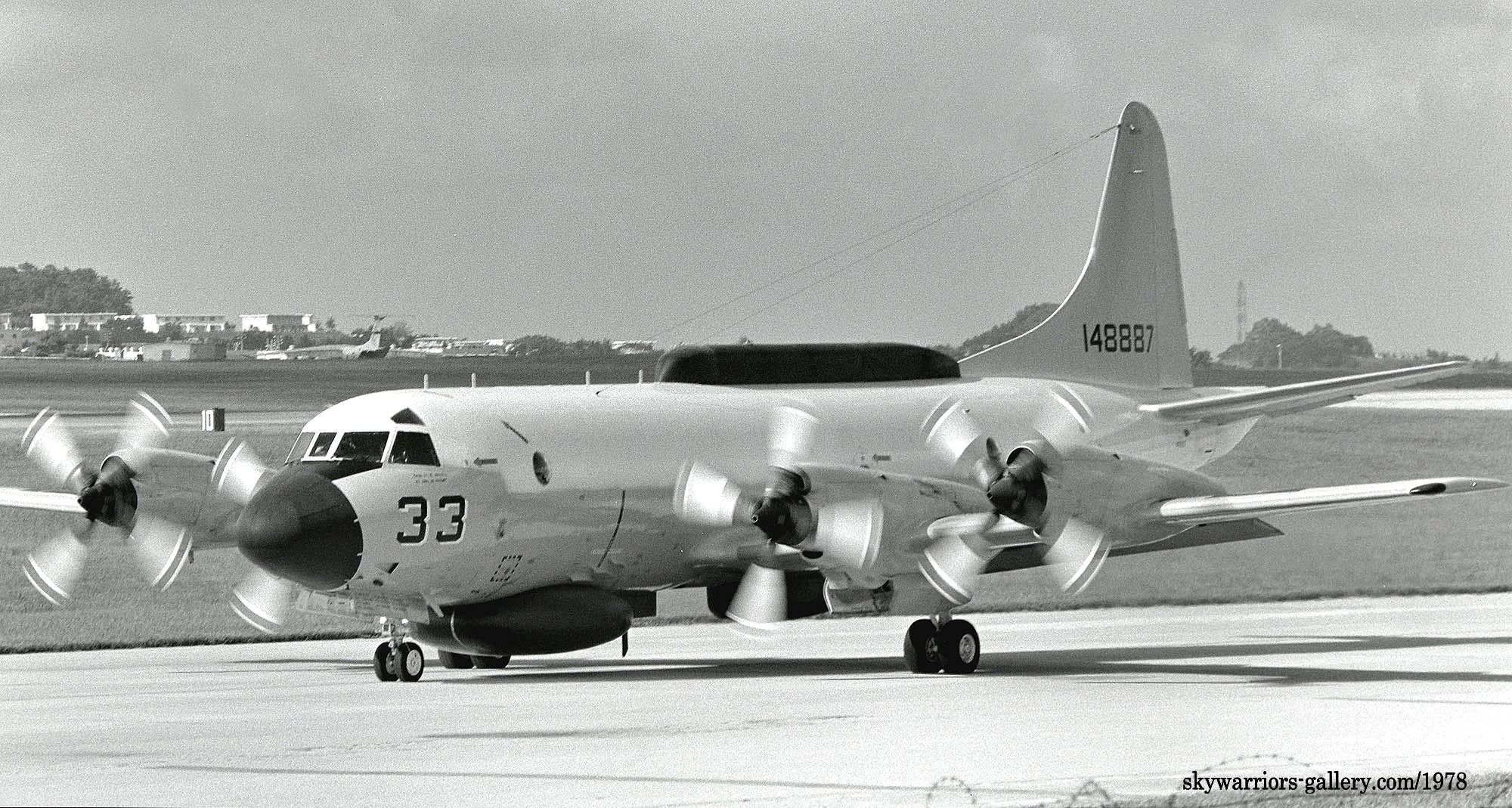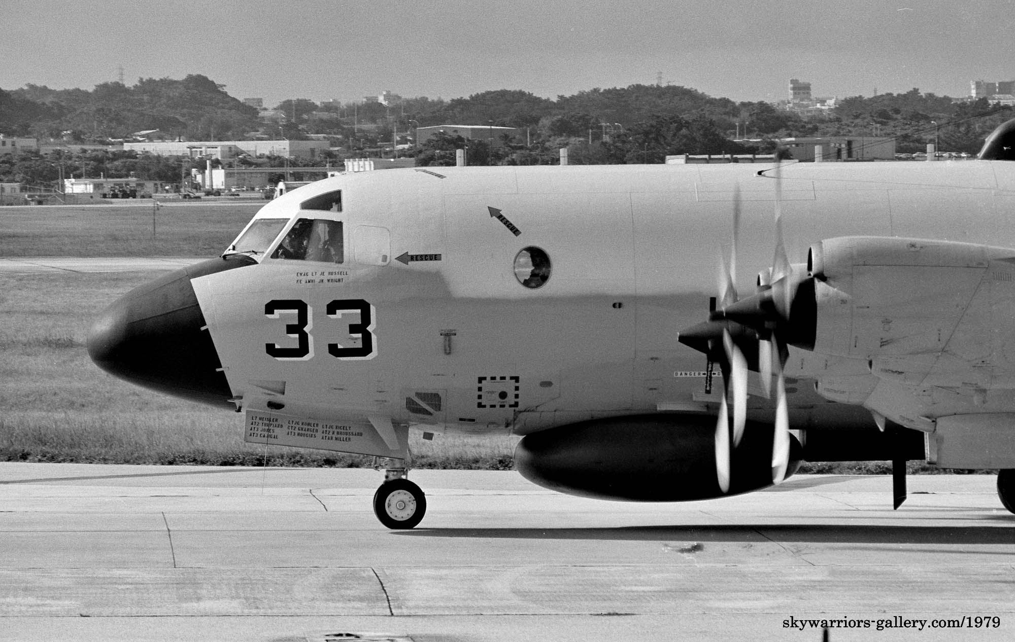 ↑ 1979年6月嘉手納基地R/W23へ離陸に向かうVQ-1のEP-3E DEEPWELL。PR-33の胴体上部前方のアンテナは4本あり その長さはほぼ同じである。機首のレーダーはP-3と同じAN/APS-134(V)で元々対潜戦闘用として設計されたもので、3種類のモードで捜索が出来る。潜望鏡など海上の小型物体捜索では前方60km迄の捜索が可能との事である。何れのモードも1秒間に2000回ものパルスレーダー波で捜索するもの。