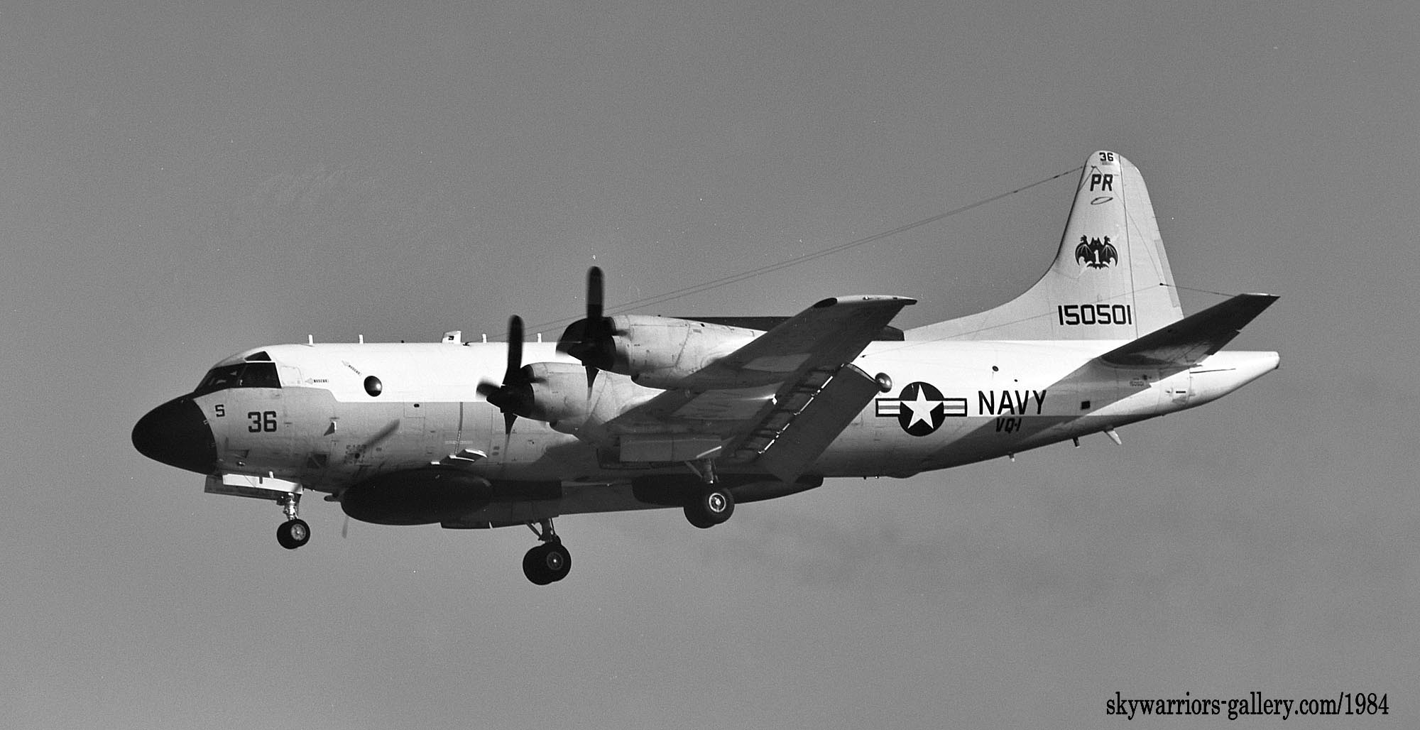 ↑ 1979年横田基地に飛来したVQ-1のEP-3E/PR-36。1979年当時は胴体前方のアンテナは4本のみ。↓の1984年にはPR-34と同様のアンテナが追加されている。EP-3Eには24名の乗員が通常乗っており、そのメンバーには言語学者や暗号学者、電子技術者など多様な人材が含まれていた。