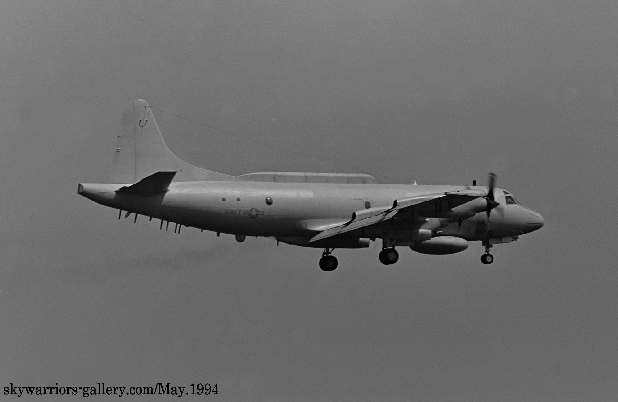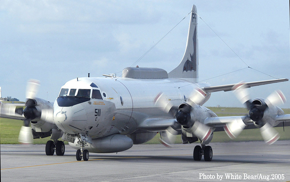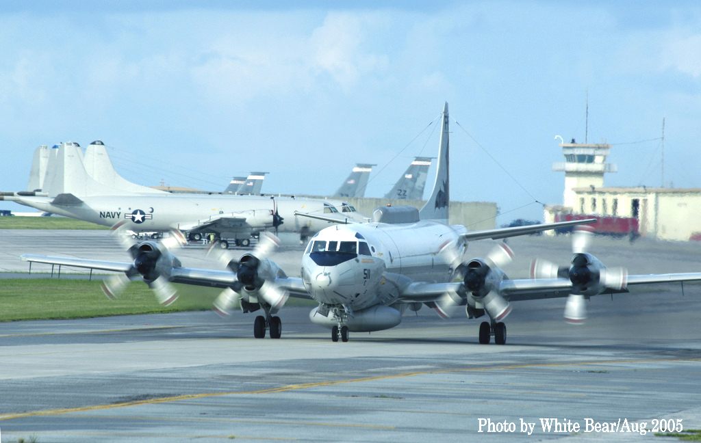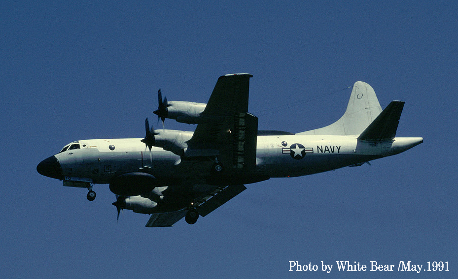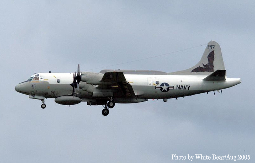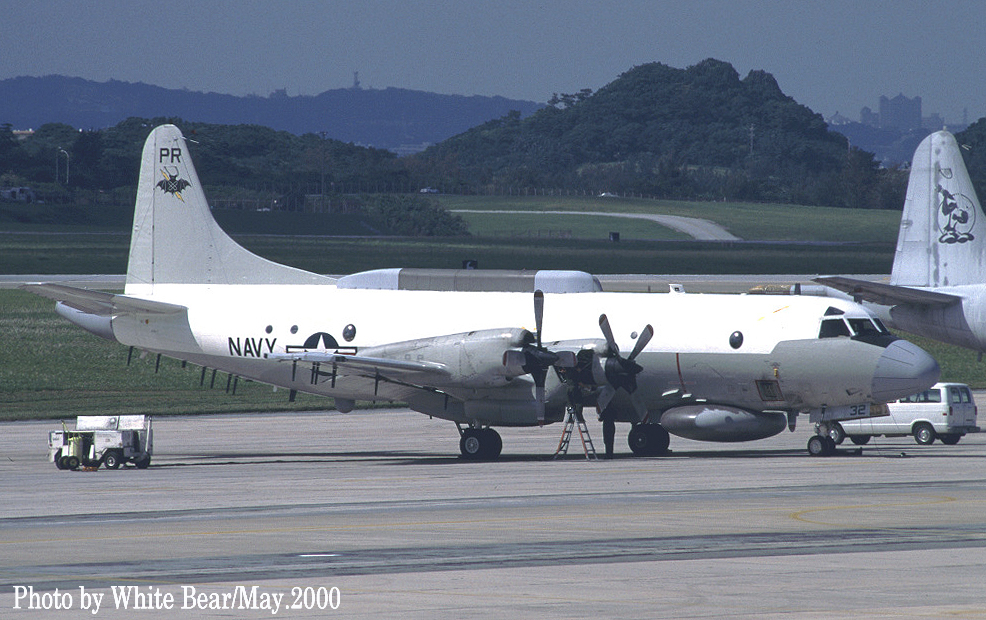 ↑ 1994年5厚木基地R/W19に着陸するVQ-1のEP-3E ARIES-Ⅱ。前脚カバーの”32”から、これもPR-32/Bu.No.156511であると判るが1年で全面グレーに塗り替えられていた。。この機体が後に中国の海南島沖で事件に巻き込まれる機体である。2001年4月に中国空軍のJ-8Ⅱ戦闘機の迎撃を受け、お調子者の中国人パイロットが、EP-3Eの前方をかすめるように抜きかけた時に、EP-3Eの第2エンジンのプロペラに接触して、J-8Ⅱは墜落、EP-3Eは海南島に緊急着陸して、中国当局に拘束された事件である。 このJ-8Ⅱのパイロット(王偉)は、米軍機を迎撃にやってくる時は、毎回コカコーラを飲んで見せたり、手振りでジェスチャーを送ったり、派手な演技を見せたりなど、米軍の中でも彼のパフォーマンスは有名だったらしいが、ちょっと調子に乗り過ぎて今回は衝突、自らは墜落して殉職した。中国では英雄扱いになっているが、実はいつもの荒っぽい演技で脅かそうとして失敗したもので英雄とは言い難い人物であった。海南島は中国の原子力戦略原潜の基地が建設中でもあり、米軍も領空すれすれまで近づいて飛行を繰り返していた事は想像でき、こうした偵察活動が相手の刺激的対応となっていたのも事実であろう。まぁ毎回話題となるロシア・中国の得意技でもある。
