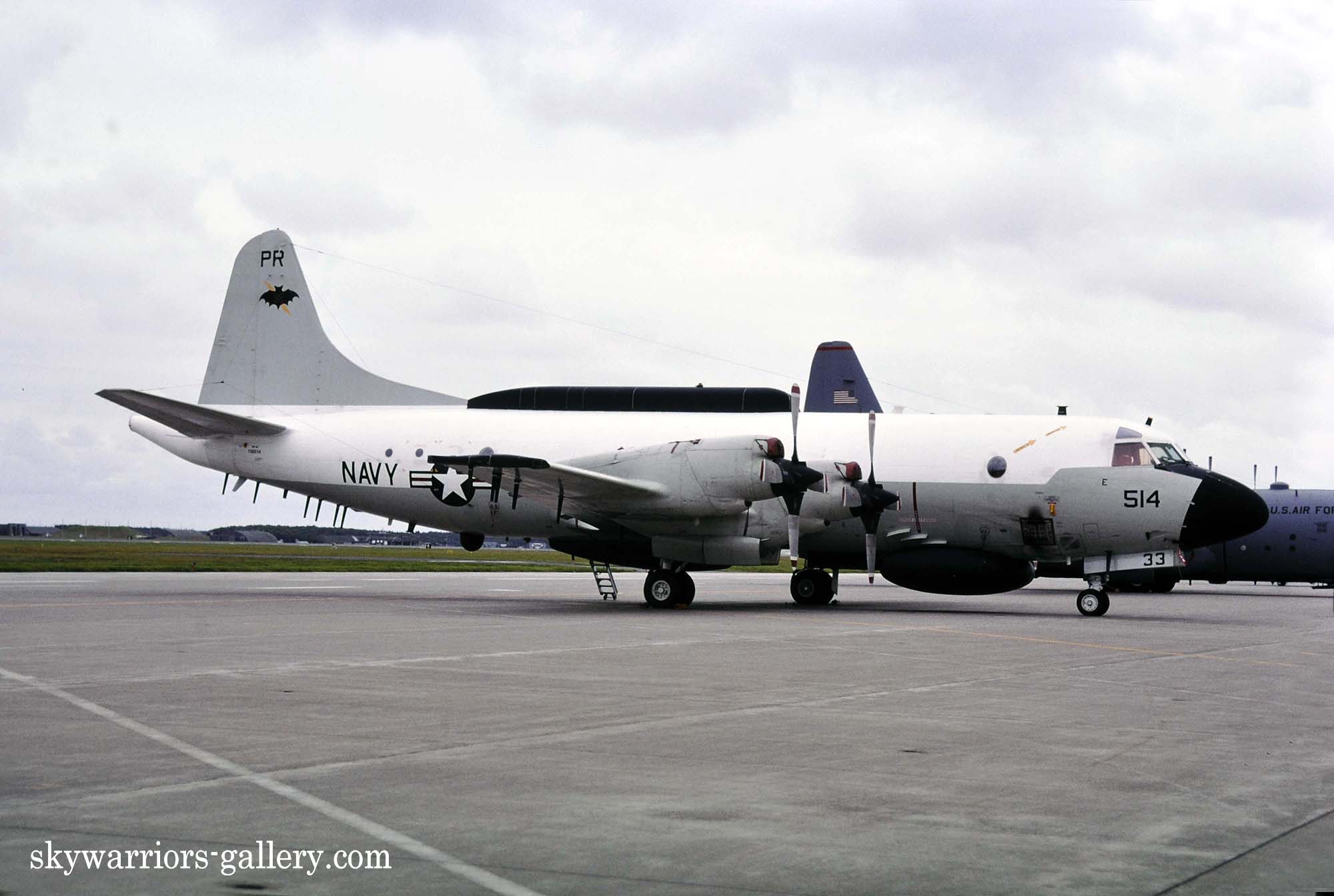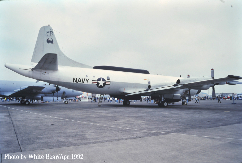 ↑ 1990年9月にWhite Bearさんが厚木基地で撮影されたVQ-1のEP-3E/PR-34。機首の機番が白で書かれた短い時代の一コマである。1989年VQ-1は、EA-3Bスカイウォリアーを退役させ、EP-3E ARIES-Ⅰが主力となっていた。