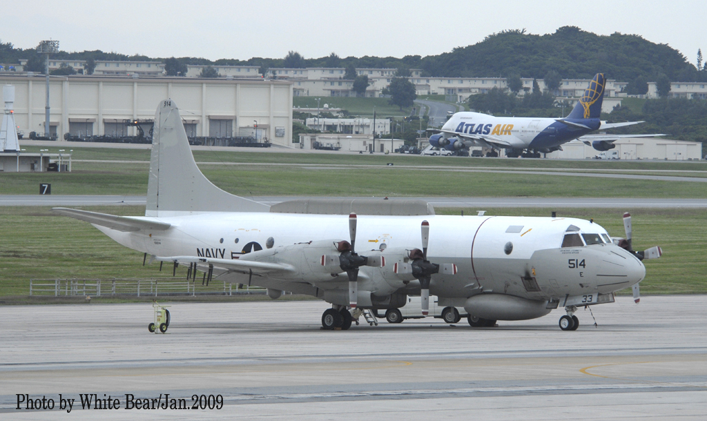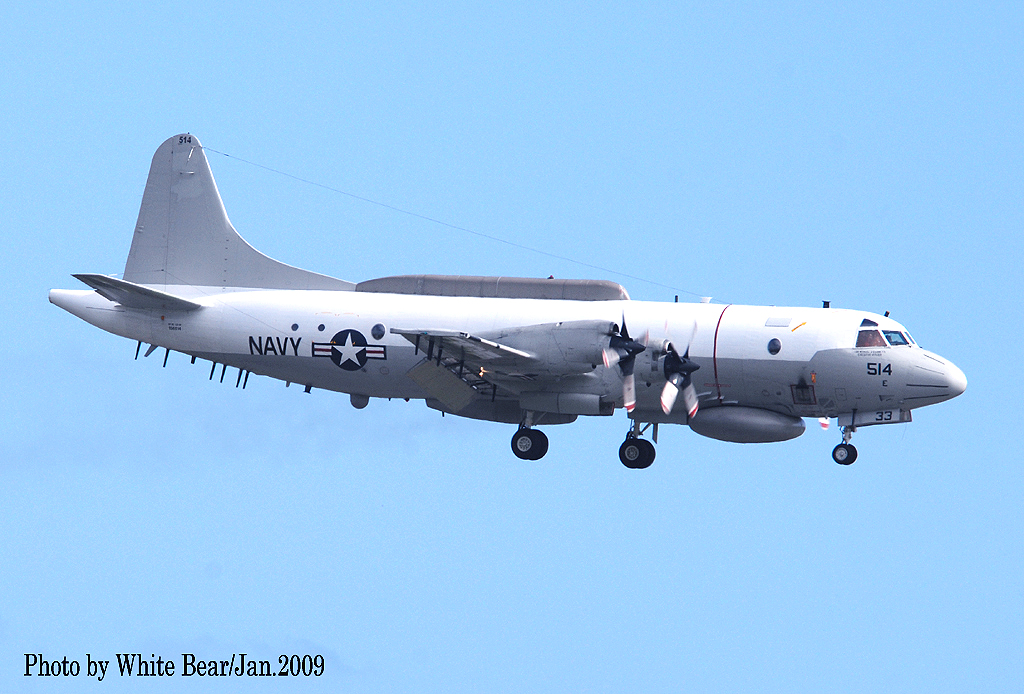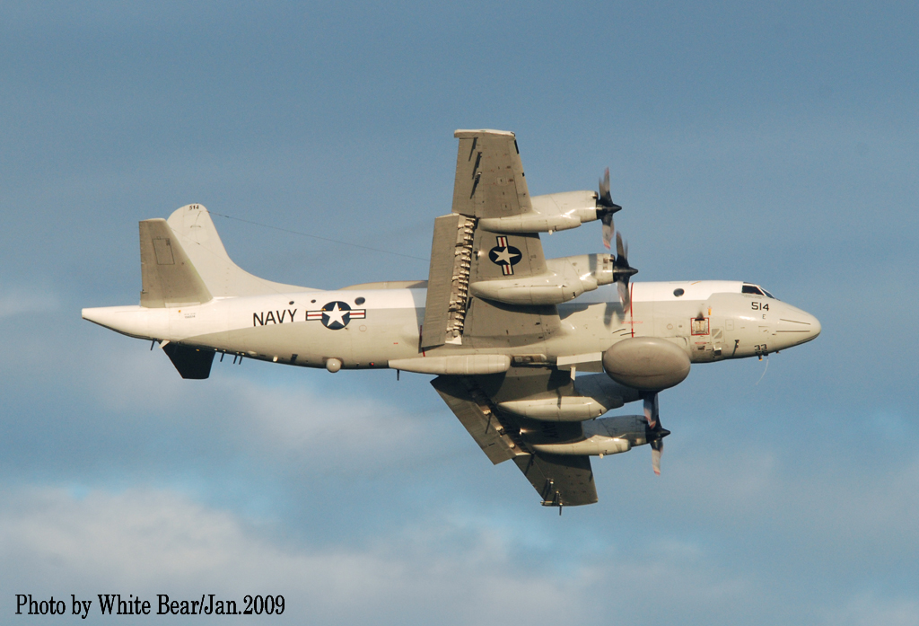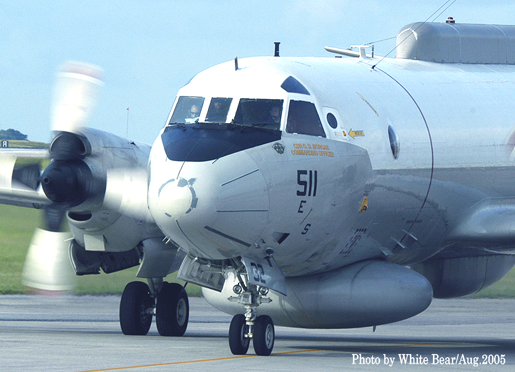 ↑ 海南島事件が起きる1年前に、White Bearさんが、嘉手納基地で撮影されたVQ-1のEP-3E/PR-32.。C国に拿捕された時のマーキングは恐らくこれと同じであったはずだ。EP-3の外見的特徴の一つである胴体前部下面のドーム型レーダーOE-319ビックルックアンテナが、黒からグレー色に変っている。このアンテナは飛行中に胴体から下部に降ろして、レーダー波が遮らない様調整が出来る。