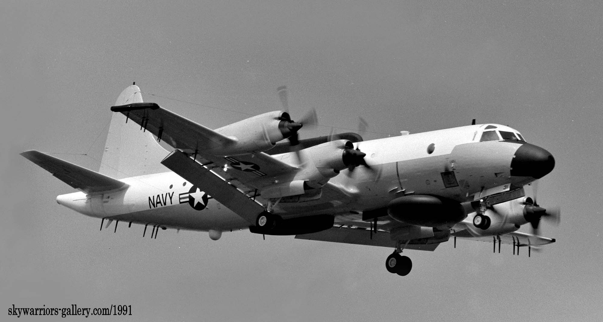 ↑ 1991年春に厚木基地のR/W19に着陸するVQ-1のEP-3E ARIES-Ⅱと呼ばれる大きな改造を加えたタイプで、Modex(機首の機番)は、コックピット下から消えて、前輪カバーに”31”と書かれているのが判る。PR-31号機であるが、従来の機体と入れ替えられ、所謂”2代目PR-31"。この機体はBu.No.156507。