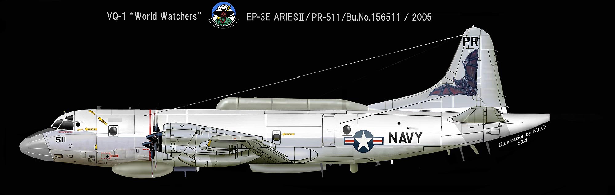 ↑ 中国の海南島に緊急着陸して拿捕されたEP-3E/Bu.No.156511が再び復活して、大きな蝙蝠を尾翼に描いた2005年のマーキング。蝙蝠のモデルは大型のフォックスバットではなく、チスイコウモリのようである。