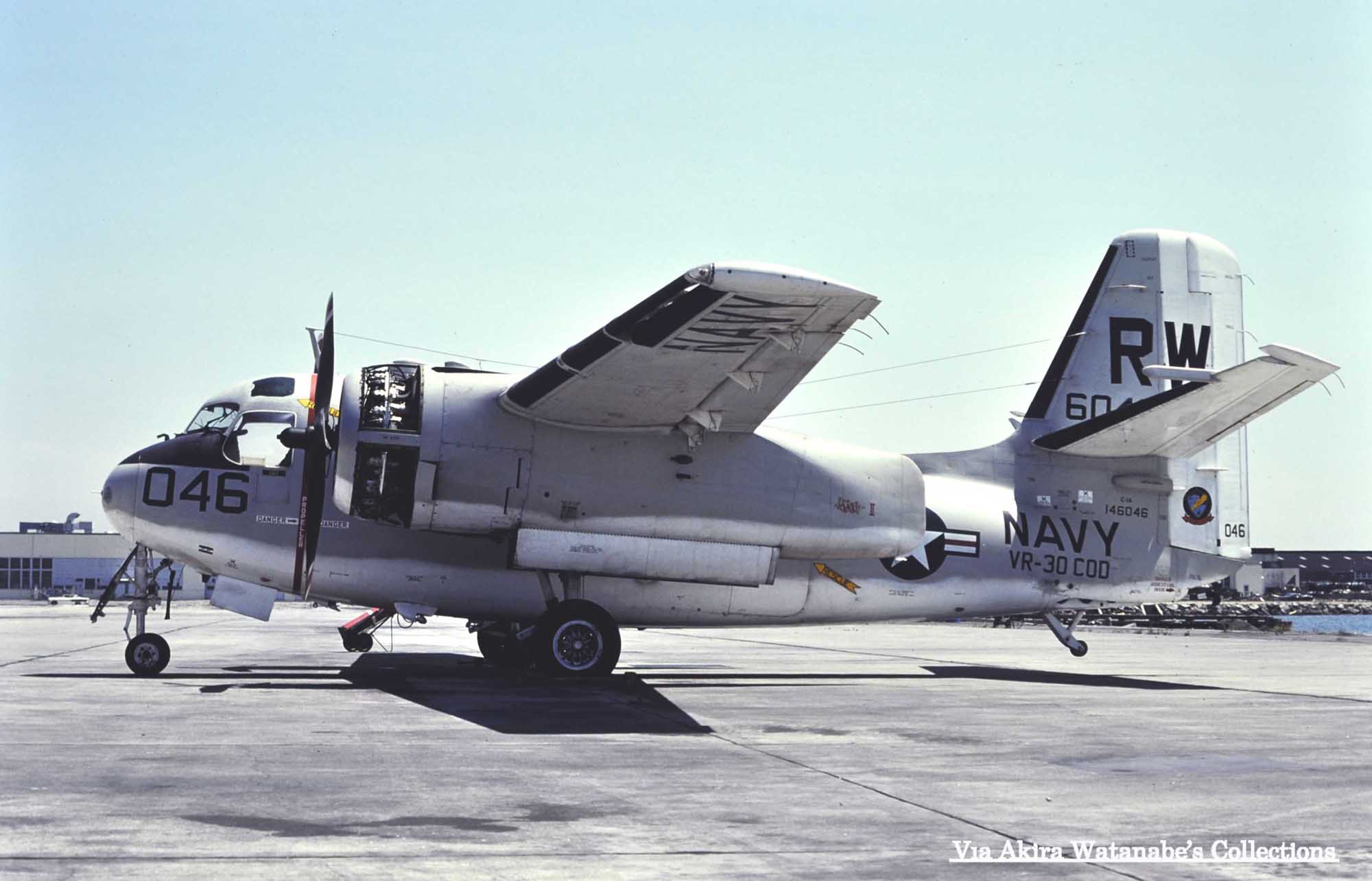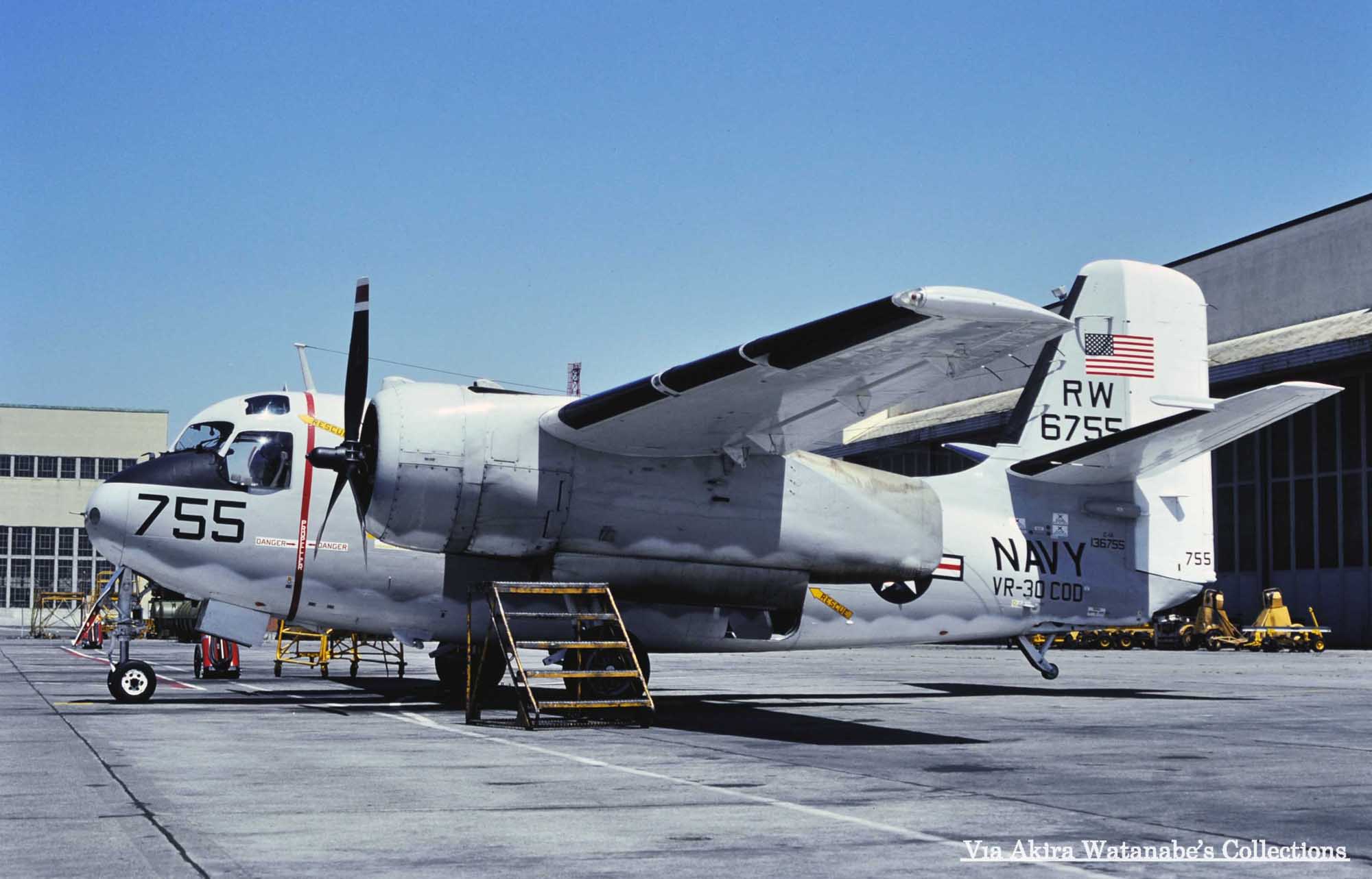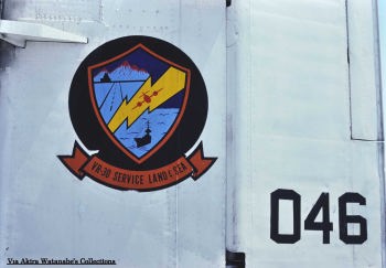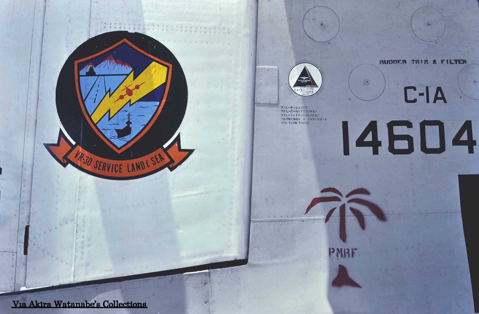 ↑ 上の3枚の写真は何れも撮影場所が不明であるが、1975年9月に同一場所で撮影されたものと推測されるVR-30のC-1A 2機。尾翼をラダーも含めその面積の半分をガルグレー色、残り半分を白色に塗り分け、インシグニアを水平尾翼の位置より下に書き込んである。