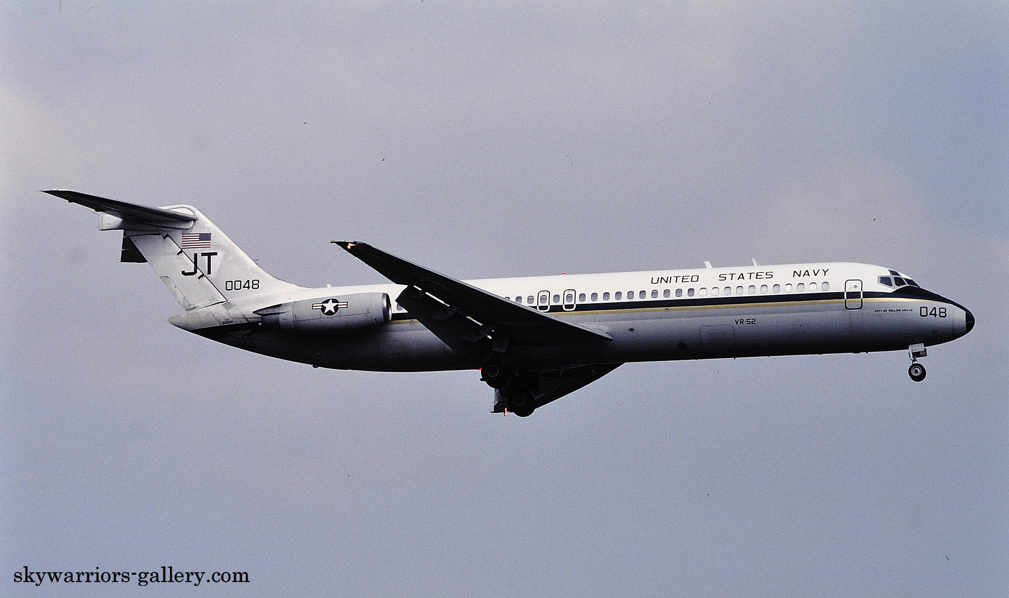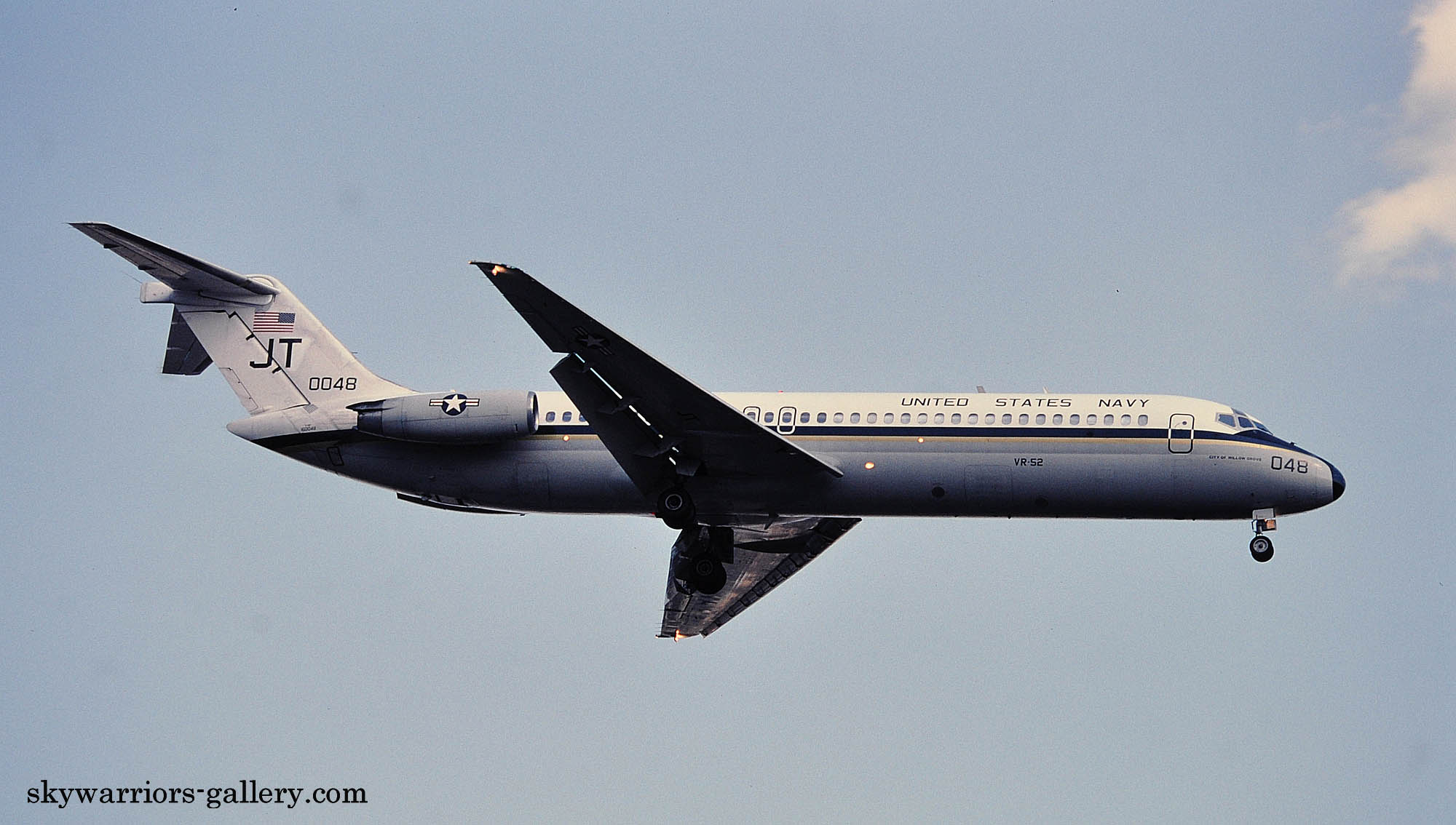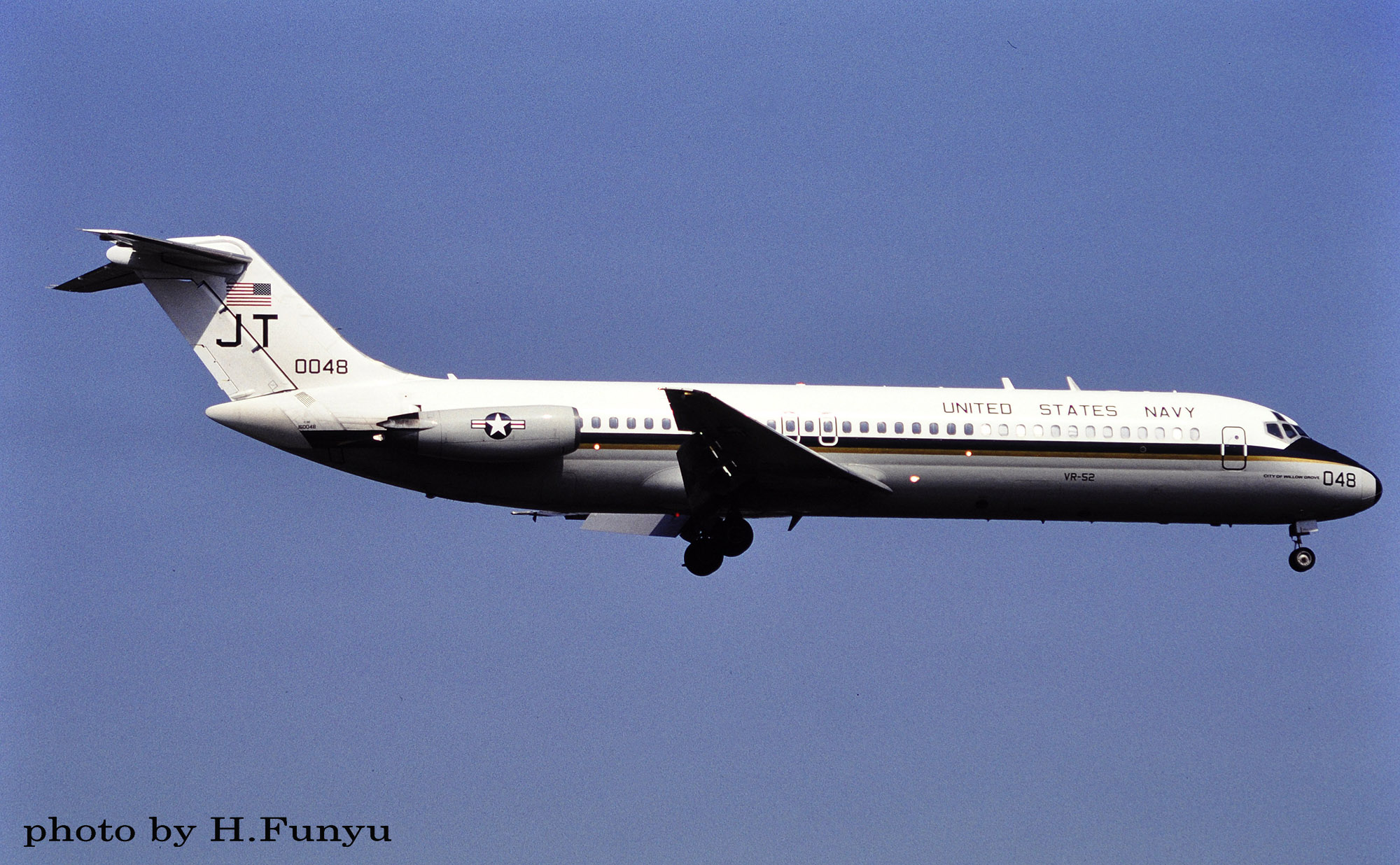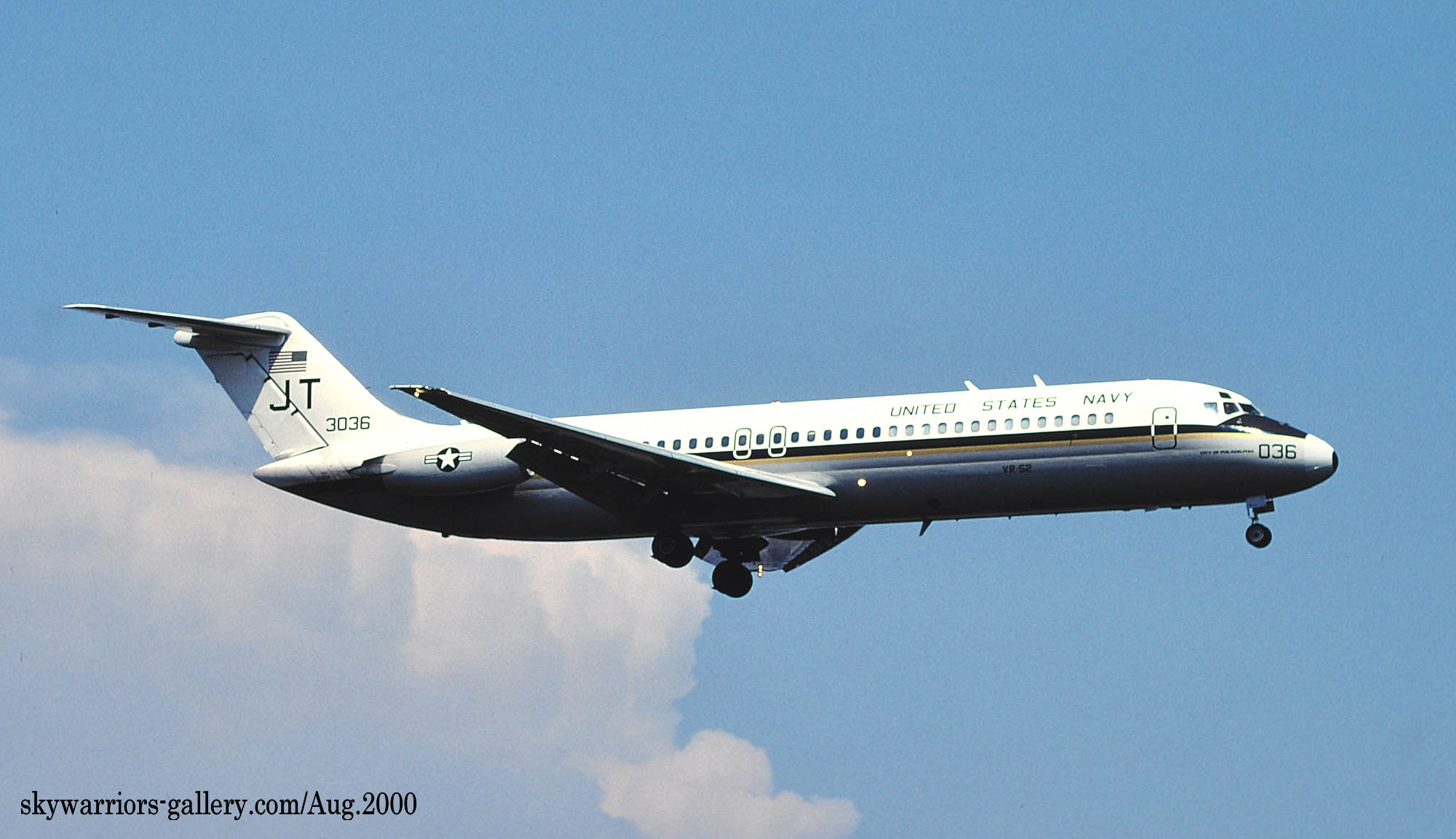 ↑ 2000年8月厚木基地に着陸するVR-52のC-9B/Bu.No.163036 JT-036 "city of philadelphia"1967年に生産された機体で1984年に海軍に移管されVR-52で使われるようになった。因みに本機とビューアルナンバーが一つ違いのJT-037/Bu.No.163037もVR-52の所属で”City of Willow Grove"と命名されていた。。