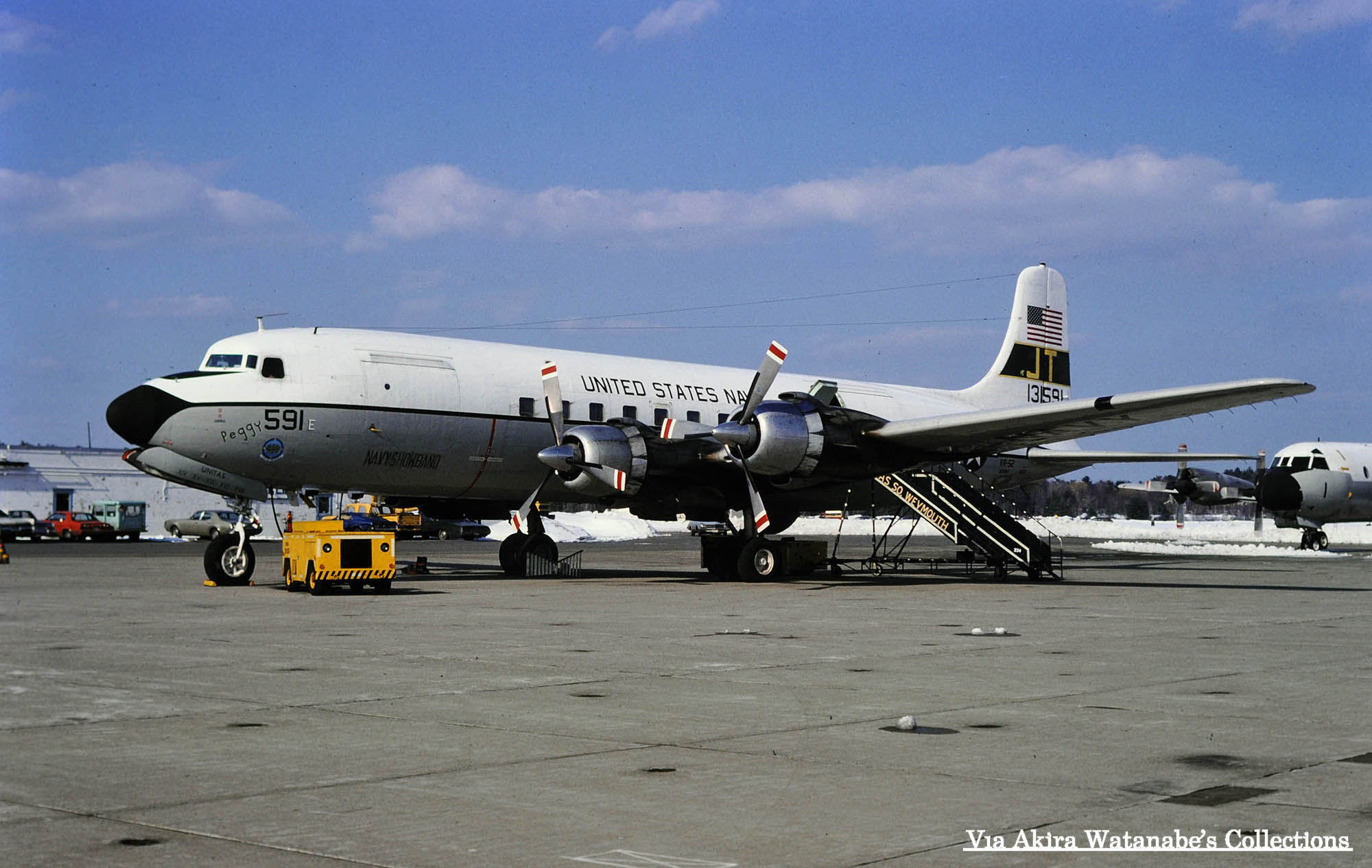 ↑ 1978年4月にイギリス南部のウェイ・モスで撮影されたVR-52のC-118B/131591.機首に”Peggy"の文字と部隊インシグニア